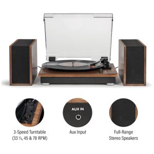 GIRATÓRIO DE 3 VELOCIDADES Projetado para um amante da música moderna, este toca discos Victrola de 3 velocidades 33 1, 3, 45 e 78 rpm reproduz música de qualidade impressionante com volume aumentado e graves profundos sem perder clareza e precisão. Ideal para iniciantes e entusiastas vintage
