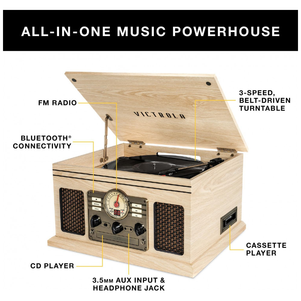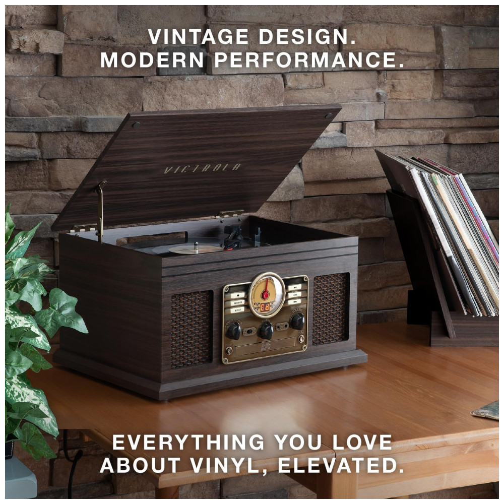 Toca Discos 6 em 1 3 Velocidades Rádio FM CD Entrada Auxiliar RCA VICTROLA VTA 200B FSG Marrom Claro