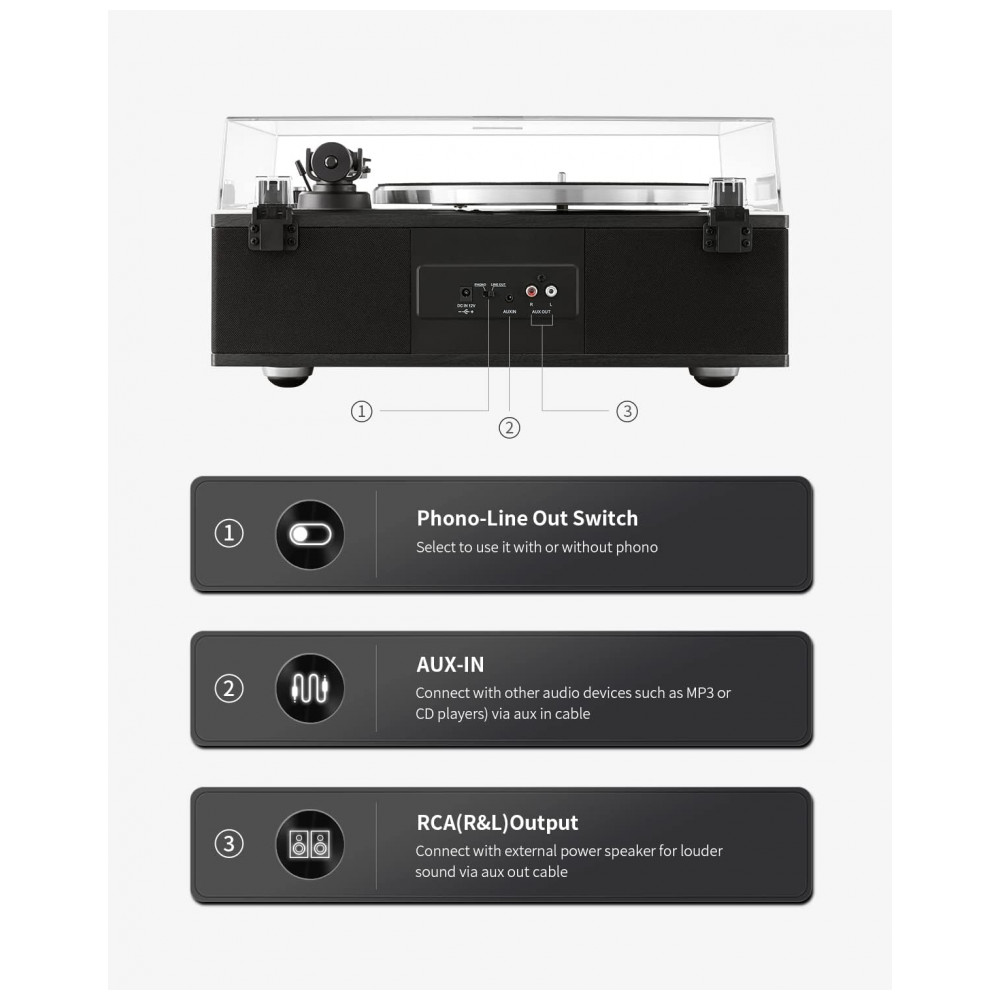 Desfrute da riqueza da sua coleção de vinis com a conveniência moderna da tecnologia Bluetooth 5.0. Transmita suas músicas favoritas sem esforço a partir de qualquer dispositivo compatível com Bluetooth para o toca-discos de vinil com alto-falantes integrados. Experimente qualidade de som premium com quatro alto-falantes embutidos projetados para áudio de alta fidelidade. Além de reproduzir vinis, também reproduz músicas via Bluetooth ou através da porta Aux-in. Com suporte para saída Phono e Line, permite a reprodução com ou sem equalizador Phono. Equipado com sistema de acionamento por correia e motor DC servo, o prato de alumínio fundido do toca-discos ANGELS HORN gira a 33 1/3 ou 45 RPM, sendo compatível com vinis de 7”, 10” e 12”. A cápsula AT3600L rastreia com precisão os sulcos dos discos para áudio de alta definição, com contrapeso ajustável para um som rico e livre de ruídos. Design elegante com recursos práticos, incluindo tampa antipoeira removível. Além de um toca-discos, é uma peça de decoração que também serve como ponto focal de entretenimento. O toca-discos de vinil com Bluetooth é o presente perfeito para amantes de música em qualquer ocasião.