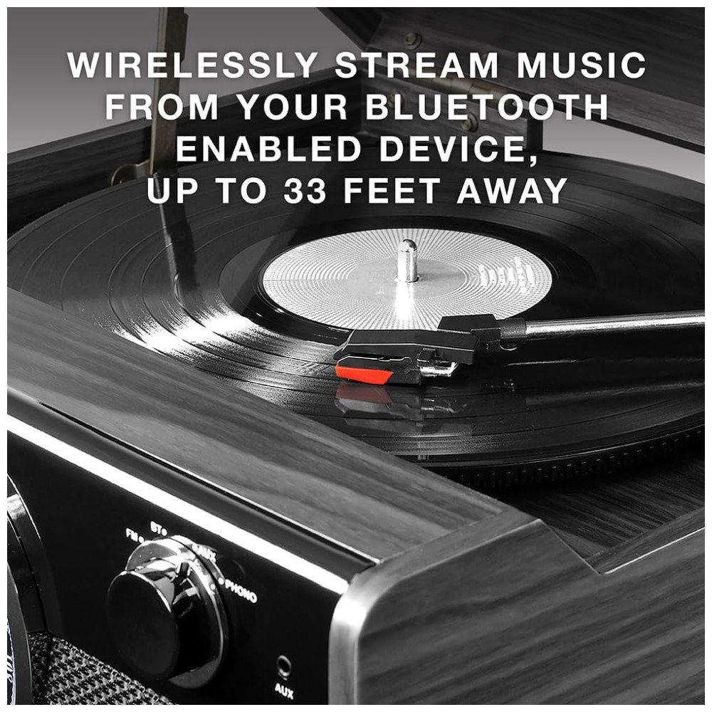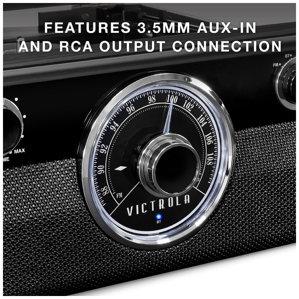 O Victrola Metropolitan Mid Century 4 em 1 é um toca-discos e reprodutor multimídia que combina tecnologia moderna com design contemporâneo de meados do século. Possui um fono de 3 velocidades, rádio AMFM, Bluetooth integrado para streaming de música sem fio e um conector de fone de ouvido de entrada auxiliar de 3,5 mm. Este toca-discos é projetado com construção em madeira real e um painel frontal inteligente, simples e organizado. É um centro de entretenimento 4 em 1, perfeito para ouvir discos de vinil, rádio AMFM ou transmitir música do smartphone via Bluetooth ou conector de fone de ouvido auxiliar de 3,5 mm. Não é necessário sistema estéreo ou equipamento extra. Com aparência de casa de fazenda tradicional por fora e recursos modernos por dentro, este toca-discos é fácil de colocar em funcionamento em minutos. O toca-discos de 3 velocidades apresenta qualidade de som premium atualizada com vibrações mínimas e é perfeito para sua sala de estar, quarto ou escritório. O player tem tudo que você precisa ali mesmo, um dial de rádio analógico no meio cercado por iluminação LED e botões de seleção de volume de entrada em ambos lados, junto com um conector auxiliar. As opções de conexão expandidas estendem o som conectando alto-falantes externos ou um amplificador através do cabo de saída de linha RCA incluído. Para audição pessoal, conecte seus fones de ouvido na entrada de fone de ouvido.