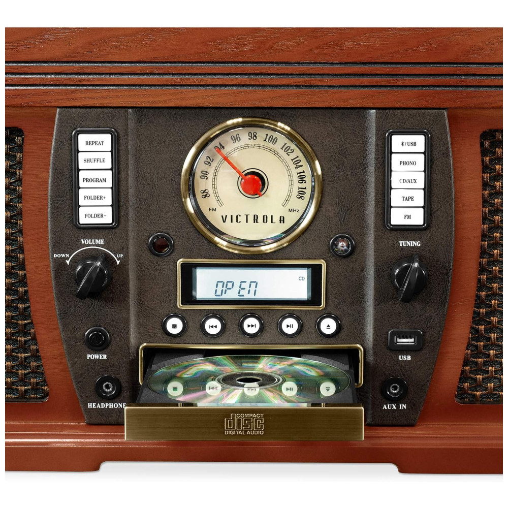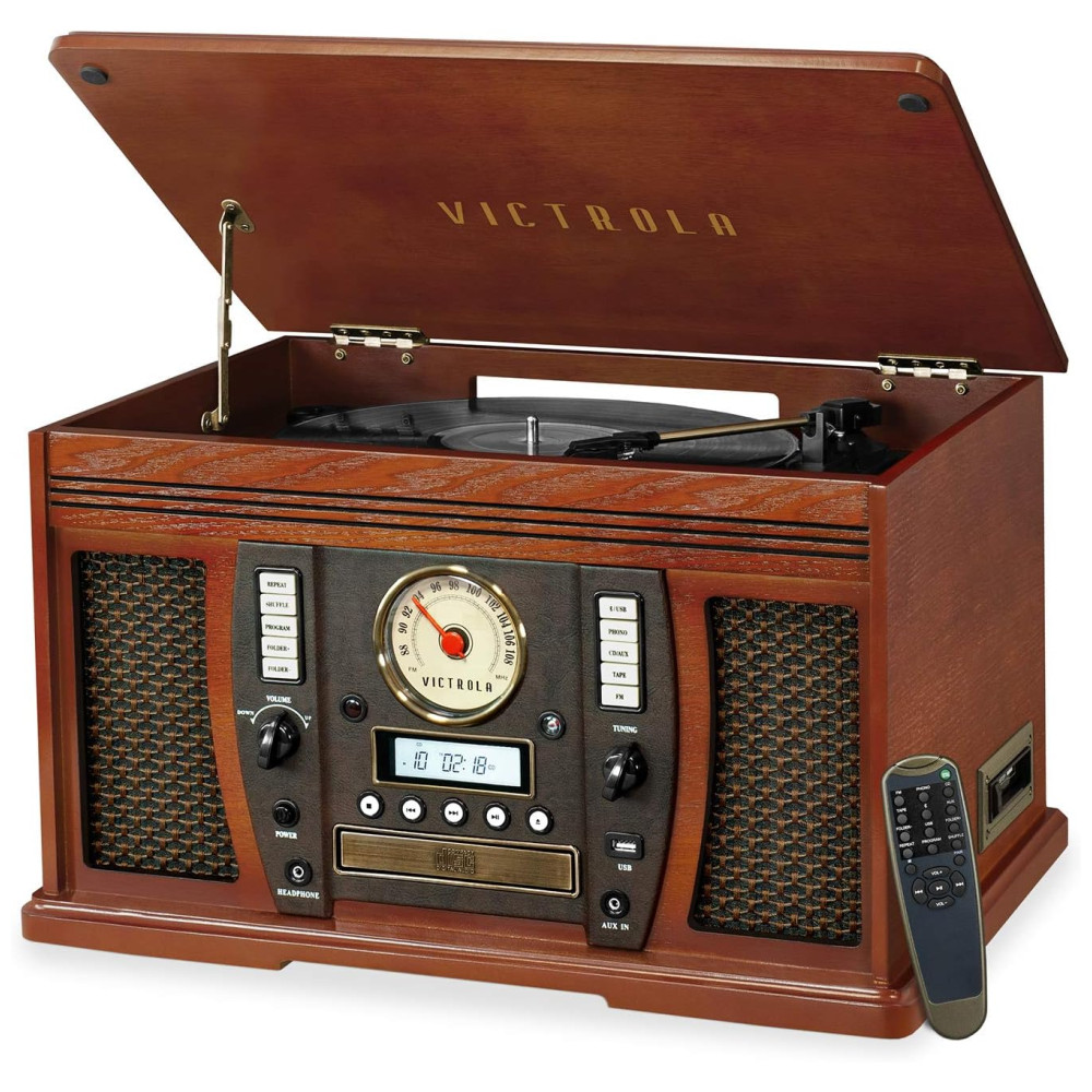 Este toca-discos de madeira maciça Victrola Navigator 8 em 1 é uma excelente escolha para quem procura um aparelho repleto de recursos. Com seu design clássico nostálgico e tecnologia moderna, o Navigator possui um toca-discos de 3 velocidades, um CD Player, um toca-fitas e um rádio FM com sintonizador analógico. Além disso, o Bluetooth integrado permite a transmissão de músicas do seu tablet, smartphone ou MP3. Com entrada auxiliar de 3,5 mm, porta USB e fone de ouvido, o toca-discos oferece diversas possibilidades musicais. Construído em madeira real e com painéis frontais inteligentes, este elegante toca-discos retrô é um ótimo tema de conversa! O Aviator inclui alto-falantes integrados, um auxin de 3,5 mm, conector RCA e fone de ouvido.