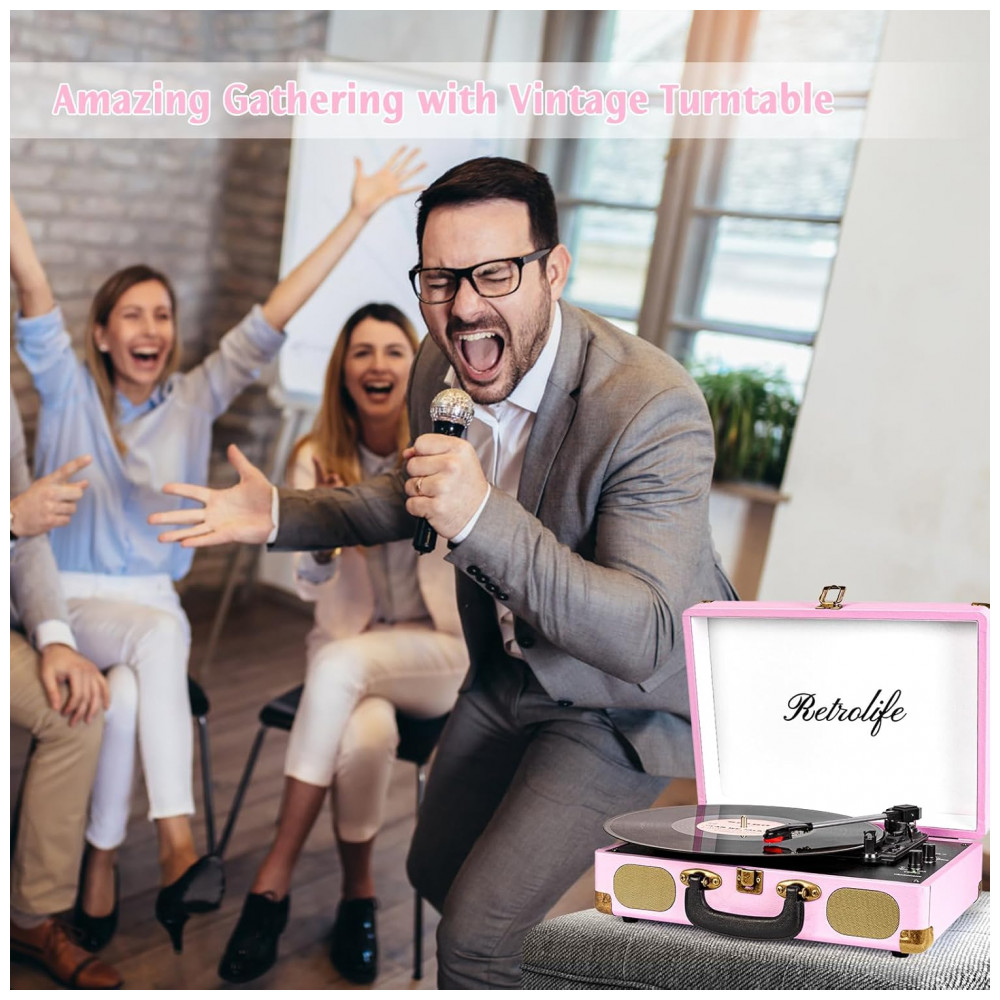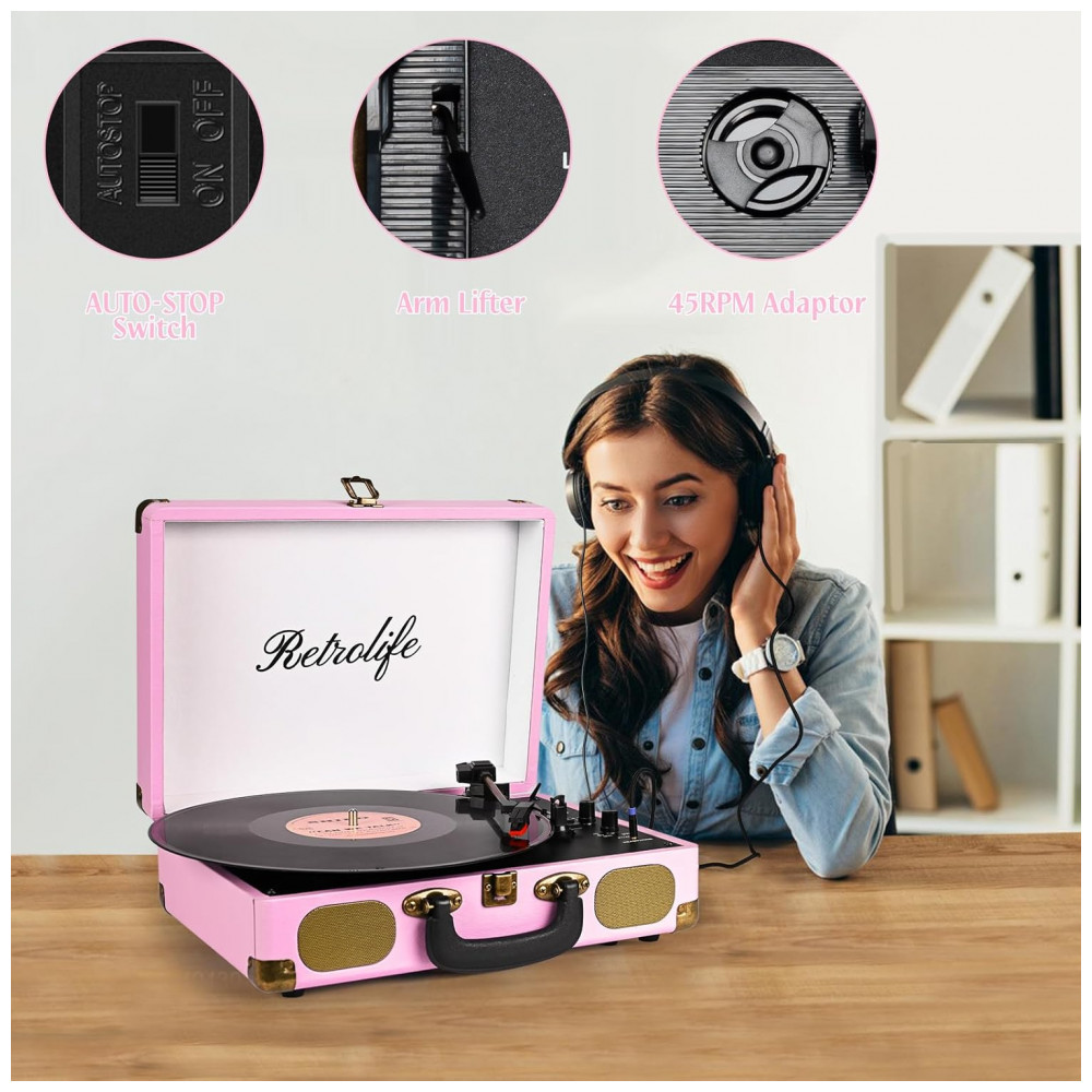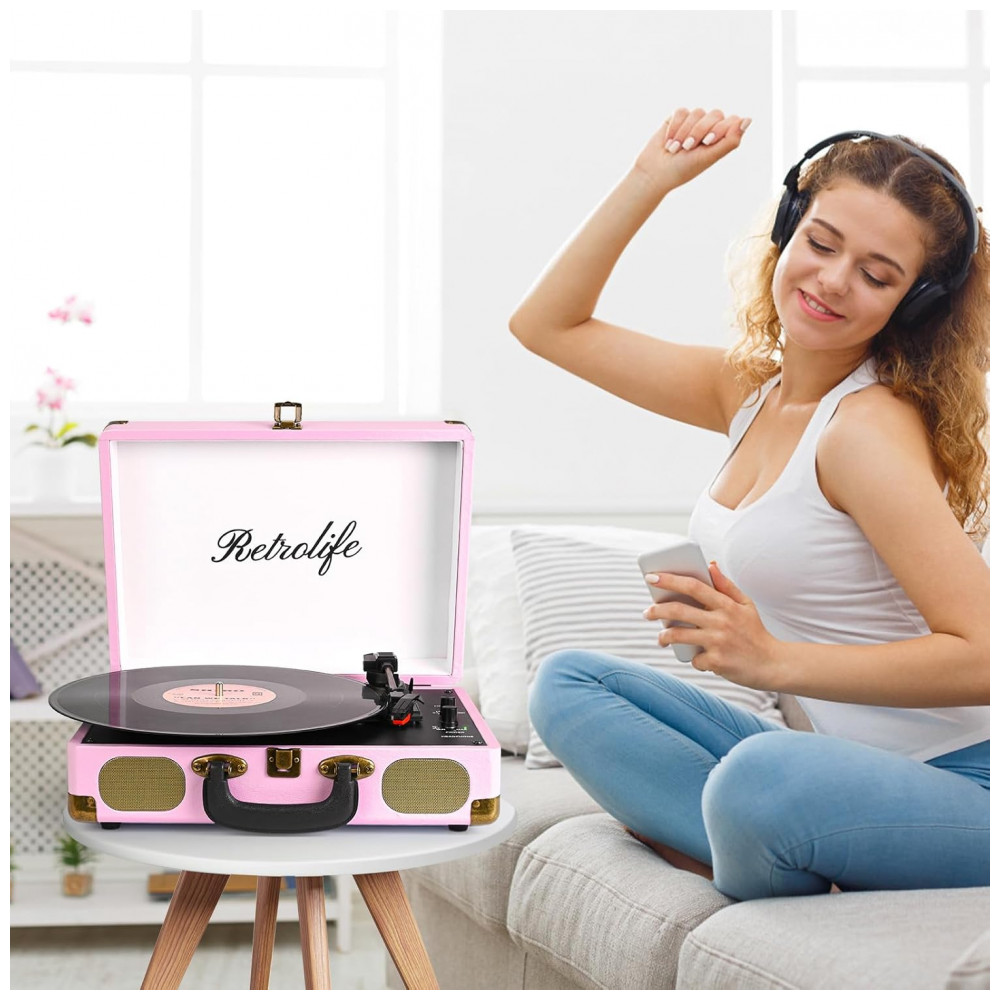 O Toca-discos de Vinil Retrolife é a combinação perfeita entre elementos modernos e vintage. Com design em couro sintético preto clássico, parafusos e grades de metal bronze retro, esta maleta portátil possui alça sólida para levar para onde quiser. Conecte-se e crie suas próprias memórias musicais com quatro opções de conexão. Transmita sua música digital via Bluetooth integrado, conecte alto-falantes externos através da saída RCA ou utilize a entrada AUX para dispositivos não Bluetooth. Aproveite a qualidade sonora aprimorada do sistema acionado por correia e do design AntiResonance. Fácil de configurar, não requer equipamentos extras e é ideal tanto para iniciantes quanto para entusiastas de vinil. Os Três Tamanhos e Velocidades de Reprodução permitem reproduzir discos de 7, 10 e 12 polegadas em velocidades de 33, 45 e 78 RPM. Com o botão de parada automática, ajuste rápido de modo e opções de Bluetooth, AUX e Phono, o toca-discos é perfeito para relaxar, festas e reuniões. Aproveite em seu quarto, sala ou escritório e desfrute de momentos musicais especiais.