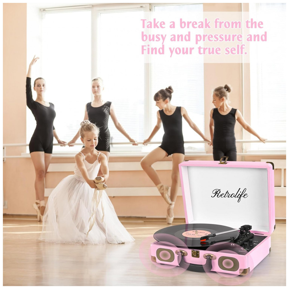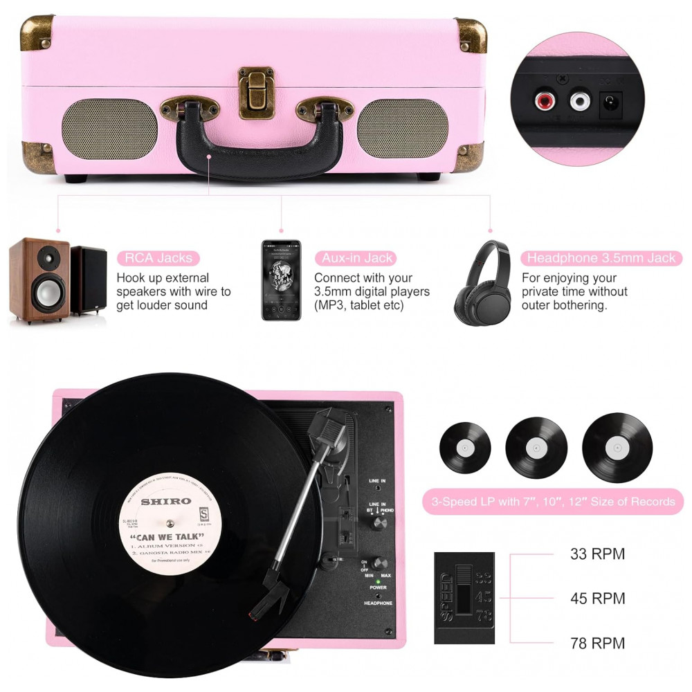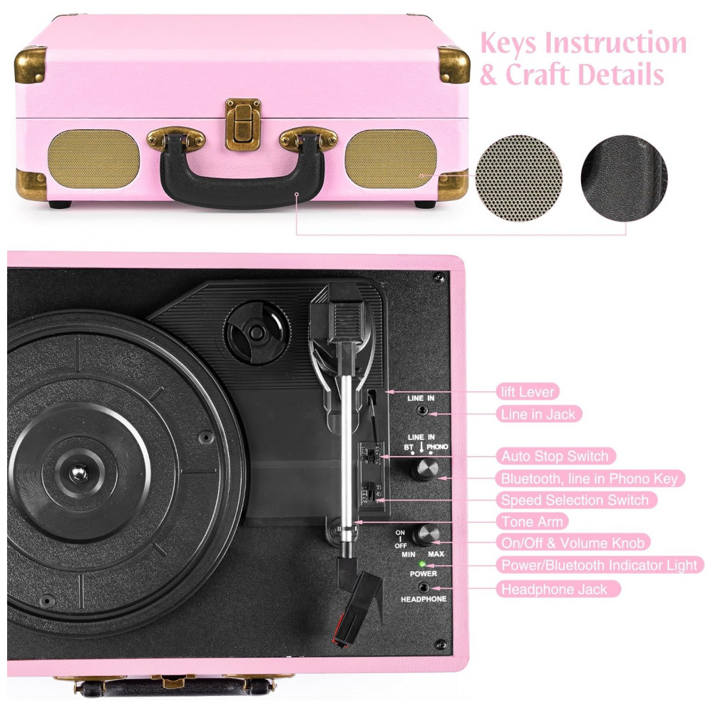 Toca-discos de Vinil 3 Velocidades com Bluetooth Maleta Portátil Alto-falantes Integrados Saída RCA Entrada AUX e Entrada para Fone de Ouvido