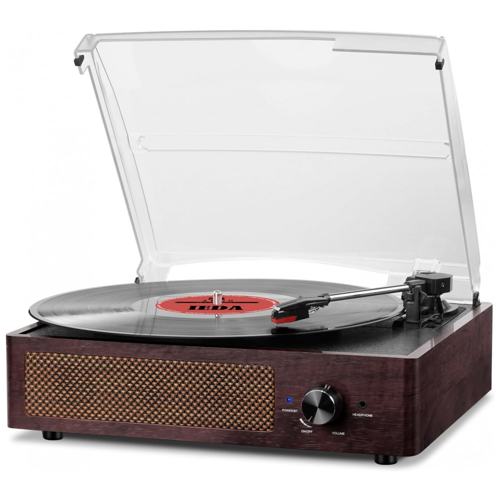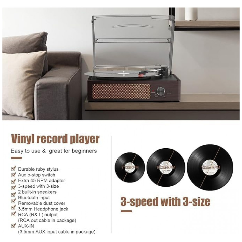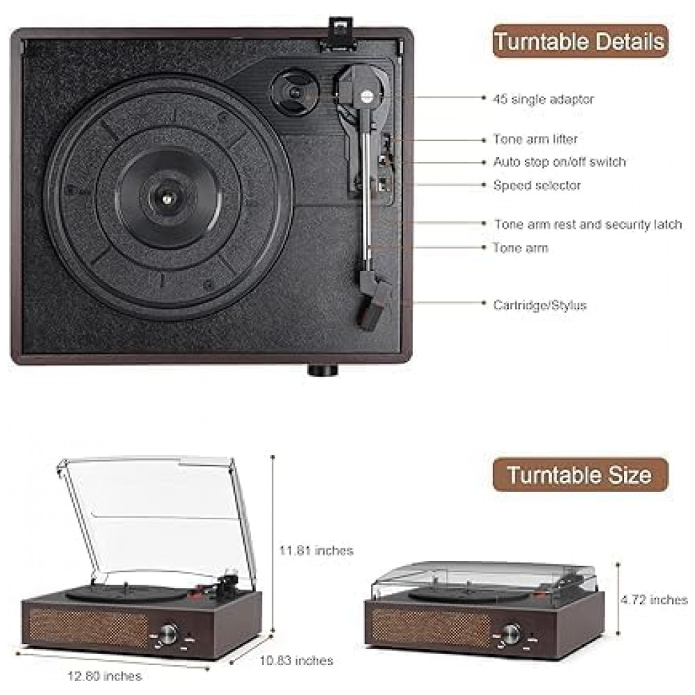 O Toca-Discos de Vinil de 3 Velocidades suporta 33 1/3 rpm, 45 rpm e 78 rpm. Ao posicionar um disco de vinil no toca-discos, incline suavemente em direção ao braço para garantir a reprodução adequada. Desfrute da conexão Bluetooth para reproduzir suas músicas favoritas de dispositivos compatíveis. Equipado com alto-falantes estéreo integrados, proporcionando uma reprodução de áudio de alta qualidade. A agulha de alta sensibilidade lê as informações de gravação de forma precisa. Possui entrada auxiliar de 3.5 mm e saída RCA para conexões versáteis. Seu design vintage em madeira natural, com tampa antipoeira removível e painel de conexão fácil de usar, não apenas oferece uma ótima experiência musical, mas também decora o ambiente com elegância e charme.