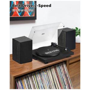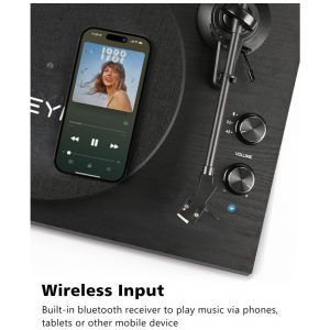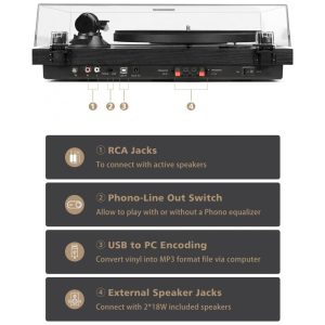Os alto-falantes estéreo HiFi para toca-discos de vinil vêm com alto-falantes de estante de 218W, que produzem um som de estúdio equilibrado com graves profundos, baixa distorção e qualidade incrível. O pré-amplificador integrado permite que você se conecte aos seus alto-falantes ou sistema estéreo via conectores RCA. Os toca-discos para vinil com alto-falantes incluem cápsula magnética e agulha de alta qualidade, reproduzindo detalhes e realismo encontrados em discos, produzindo áudio rico, quente e com excelente clareza de som. Transmissão sem fio e gravação via USB – permite ouvir discos via smartphone, tablet, computador ou outros dispositivos compatíveis. Suporta codificação USB para PC, convertendo discos de vinil em arquivos digitais MP3 via computador e reprodução. Toca-discos Premium – Contrapeso ajustável, essencial para qualquer toca-discos clássico, permite ajuste independente e preciso da força de rastreamento da agulha. Prato de ferro produz massa inercial uniforme, juntamente com o braço de tom de alumínio equilibrado estaticamente, reduzindo significativamente as vibrações do toca-discos. Aparência de Madeira Natural – Após uma instalação simples, este toca-discos vintage acionado por correia com 2 velocidades de 33 1/3 e 45 RPM combinará perfeitamente com seus móveis. Não ocuparão muito espaço na sala e não entrarão em conflito com o restante da decoração de sua casa.