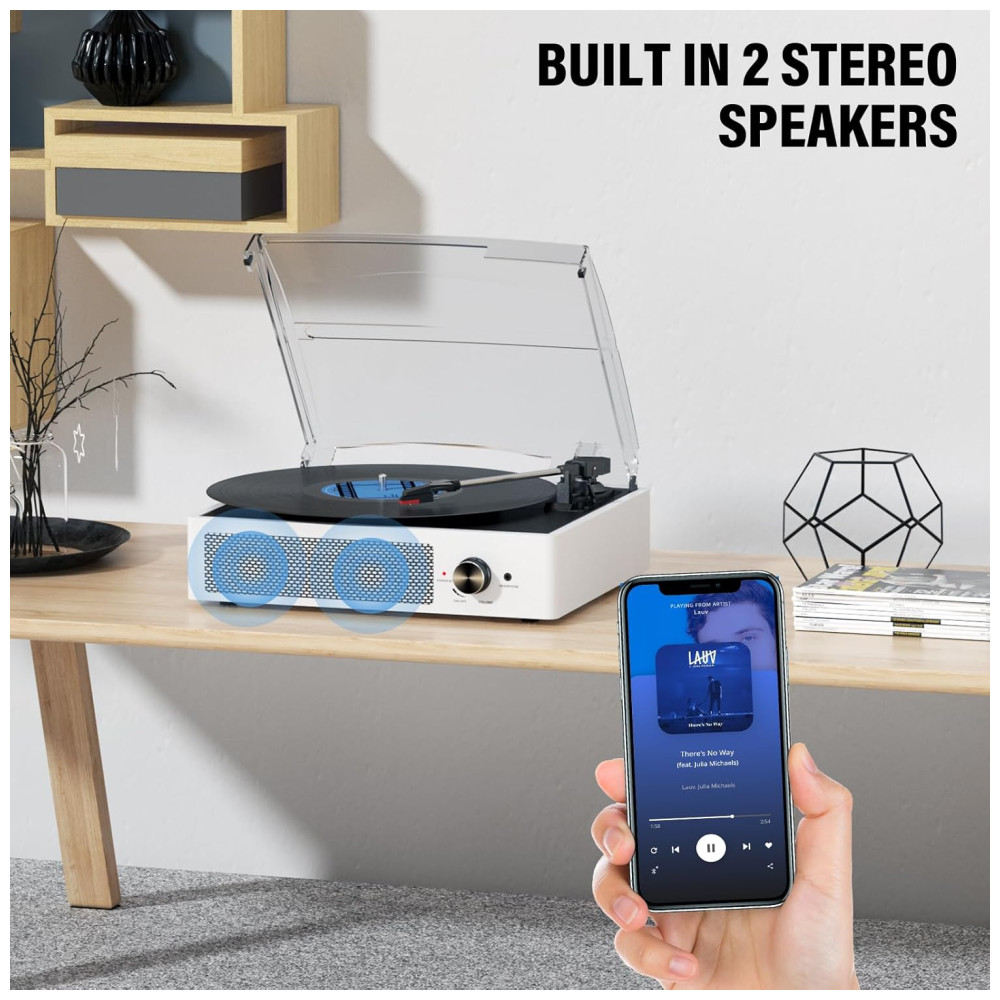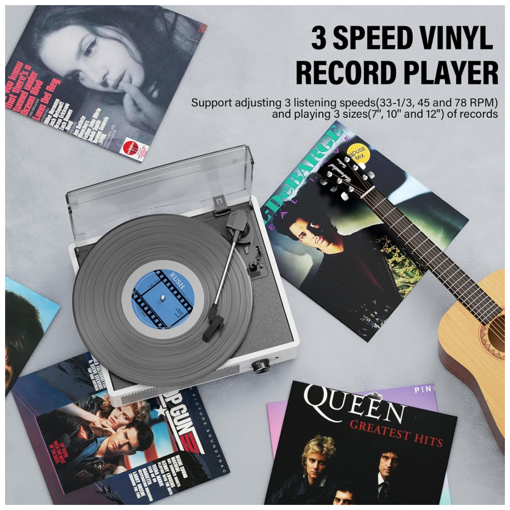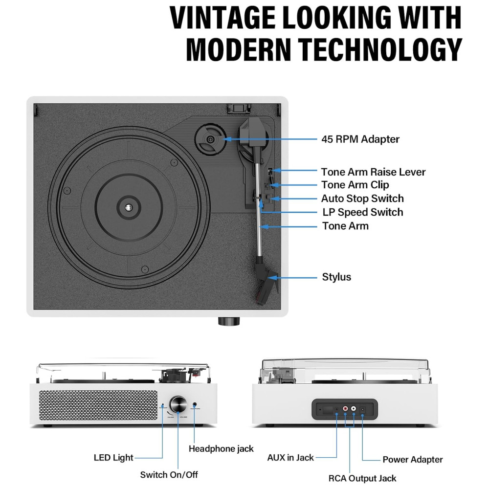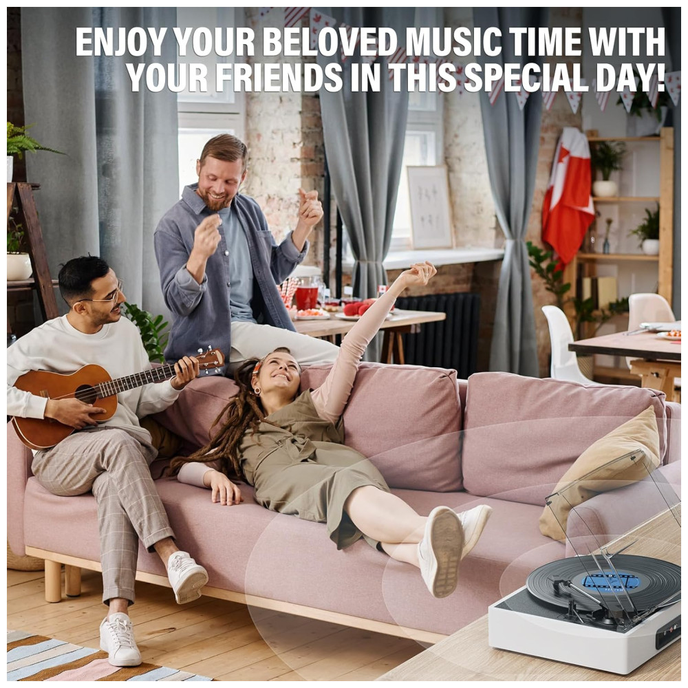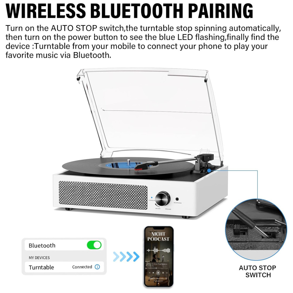 Desfrute de uma experiência musical completa com o Toca-discos All-in-One com entrada Bluetooth, entrada de áudio AUX, saída de linha RCA e entrada para fone de ouvido. Possui alto-falantes estéreo embutidos, transmissão sem fio via Bluetooth para reprodução de músicas do smartphone, moda e conveniência. Reproduza música diretamente via AUX ou ouça em particular com fones de ouvido. Conecte alto-falantes externos com RCA para melhor qualidade de som e liberte sua paixão musical! Sistema Antivibração Acionado por Correia: A base do toca-discos adota um sistema antivibração acionado por correia, que combina molas e correia para reduzir efetivamente a vibração e melhorar a qualidade do som. A tampa contra poeira removível protege seus discos de vinil contra danos e impede a entrada de poeira. Sua aparência texturizada e única se encaixa perfeitamente em qualquer ambiente. Toca-discos de Vinil com Bluetooth: Conecte-se a qualquer dispositivo com Bluetooth, como celulares, tablets e computadores, e reproduza áudio MP3 do smartphone através do alto-falante embutido. A transmissão via Bluetooth é estável e rápida, permitindo que você desfrute livremente de ótima música. Toca-discos Portátil: Crie uma atmosfera acolhedora durante encontros familiares. Pode ajudá-lo a relaxar quando estiver sozinho. Mesmo quando não estiver em uso, pode se tornar uma das decorações de alta qualidade da sua casa. Como presente, pode fazer o destinatário sentir o seu carinho. Toca-discos Retro Estiloso: O toca-discos combina perfeitamente moda e retrô, fácil de usar, especialmente indicado para iniciantes. Adota um design de toca-discos de três velocidades: 33, 45, 78 RPM, suporta discos de vinil,operação simples e suave, permitindo que você desfrute de sua coleção de músicas. DICA: Ao colocar um disco de vinil no toca-discos, incline levemente em direção ao braço para garantir a reprodução adequada.