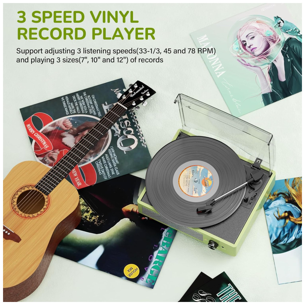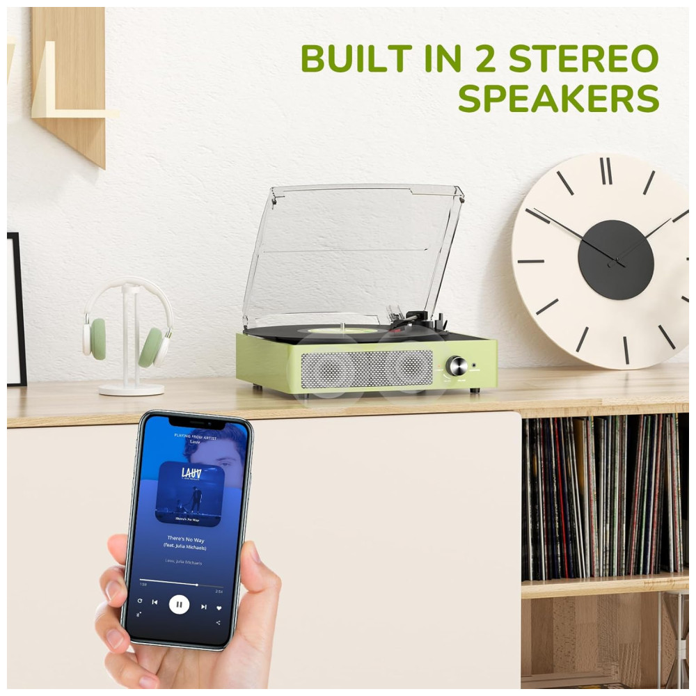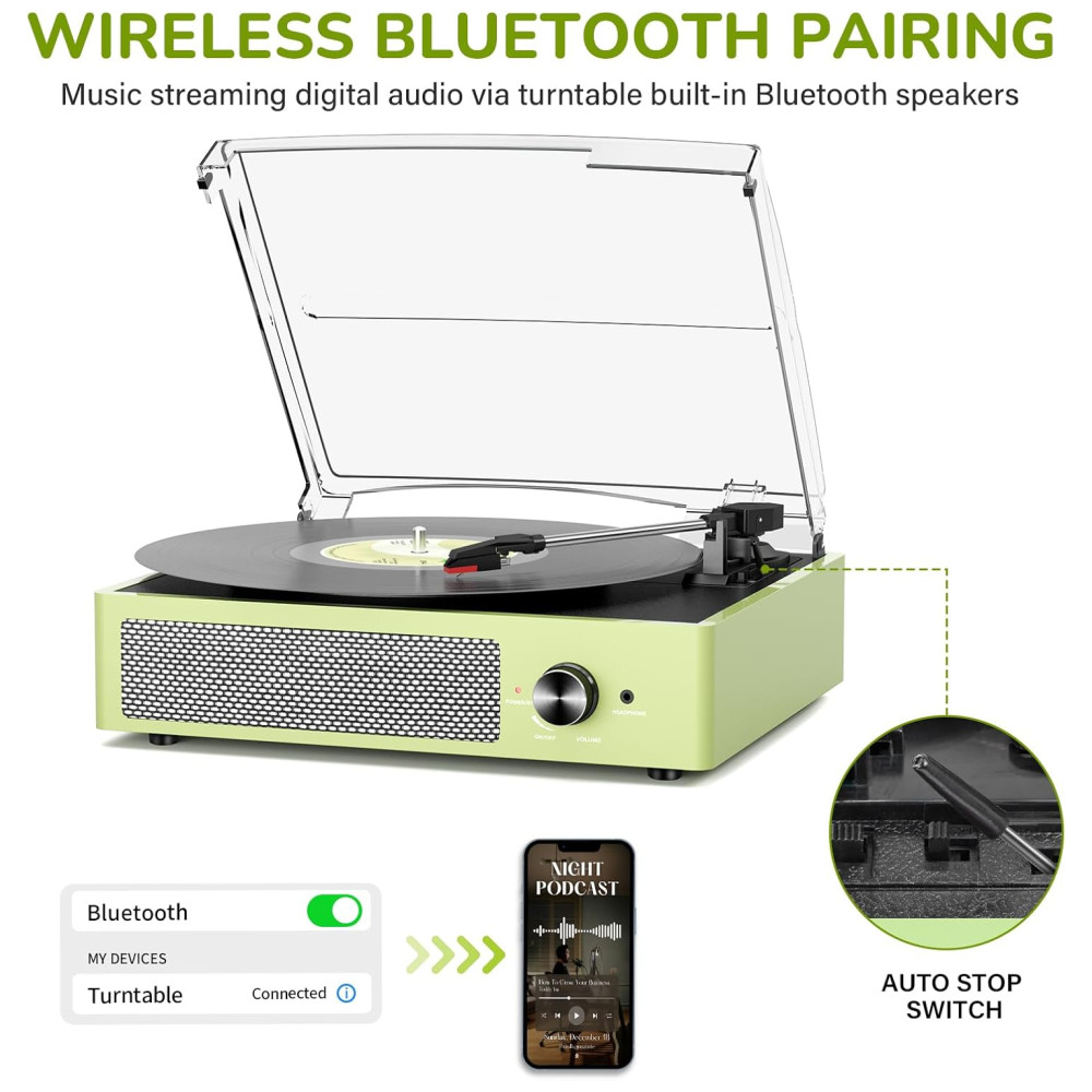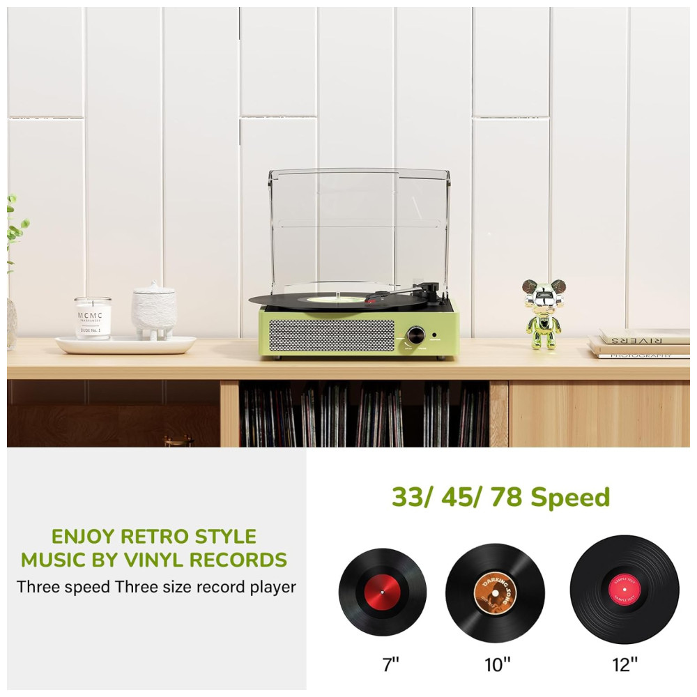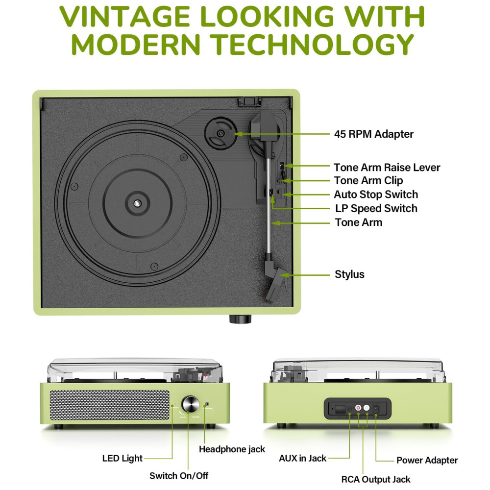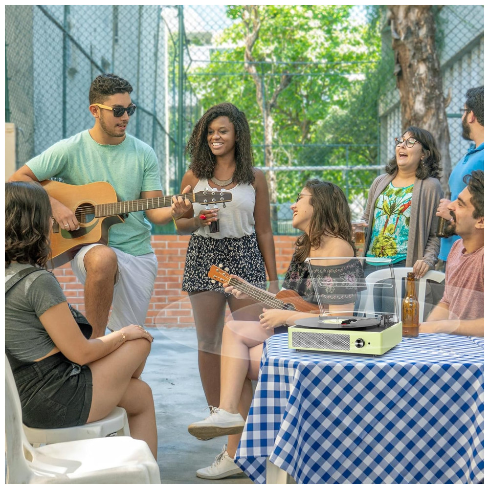 O Toca-Discos All-in-One com entrada Bluetooth, entrada de áudio AUX, saída de linha RCA e entrada para fone de ouvido satisfaz facilmente suas múltiplas experiências musicais. Possui alto-falantes estéreo embutidos, transmissão sem fio via Bluetooth para você desfrutar da música do seu smartphone de forma conveniente e fashion. Reproduza música diretamente via AUX ou ouça em particular com fones de ouvido. Conecte alto-falantes externos com RCA para melhor qualidade de som e liberte sua paixão musical!