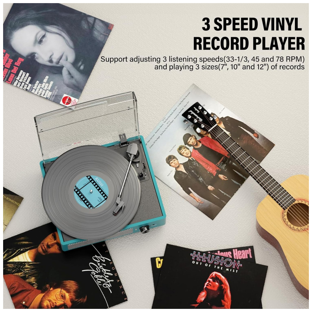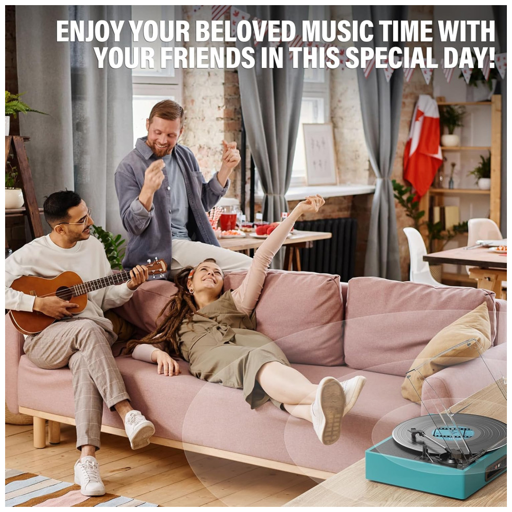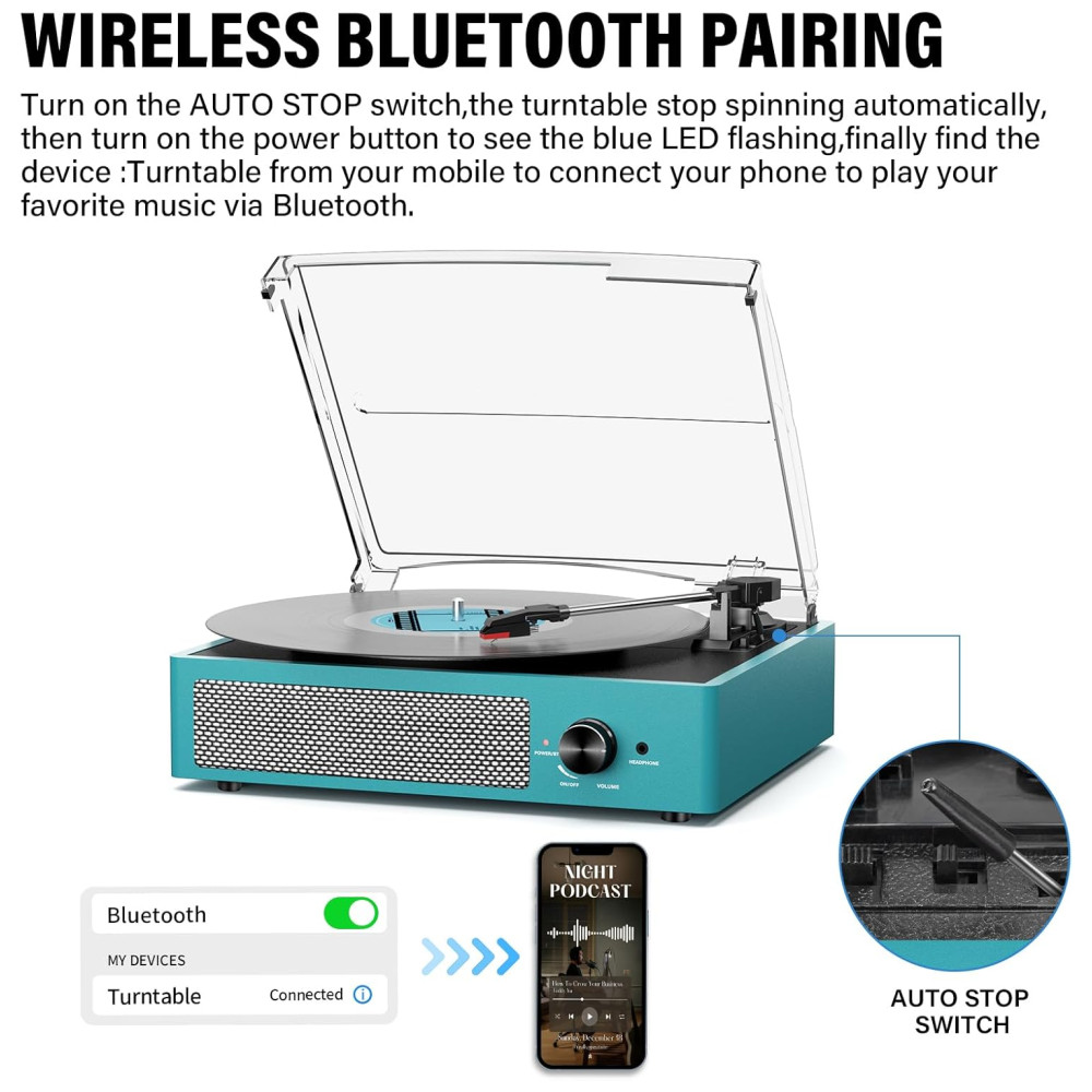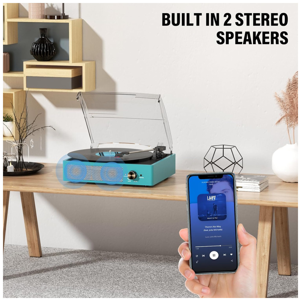 Aprecie sua coleção de vinis com estilo e conveniência com o Toca-discos All-in-One Bluetooth. Possui entrada Bluetooth, entrada de áudio AUX, saída de linha RCA e saída para fones de ouvido, atendendo facilmente suas diferentes experiências musicais. Com alto-falantes estéreo embutidos, transmissão sem fio via Bluetooth, toque músicas do seu smartphone e desfrute de um som de alta qualidade. O sistema antivibração por correia reduz vibrações, melhorando a qualidade do som. Conecte-se via Bluetooth a dispositivos compatíveis e transmita sua música preferida. Um presente sofisticado, perfeito para criar atmosfera em encontros familiares ou relaxar sozinho.
