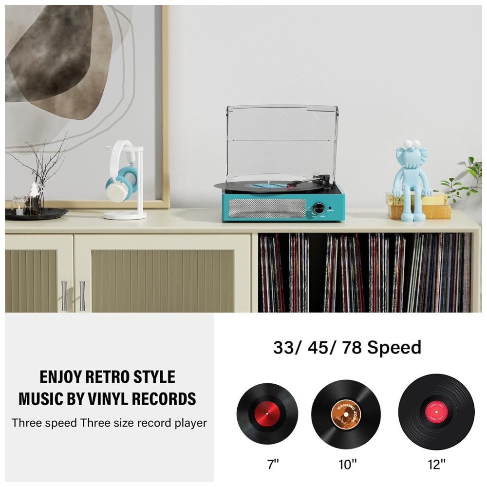 Característica Especial: Recepção e Reprodução Bluetooth, Toca-discos de 3 Velocidades para 3 Tamanhos, Entradas Auxiliar e para Fone, Saída RCA para outros sistemas de som, 2 alto-falantes embutidos e adaptador 45 RPM incluído