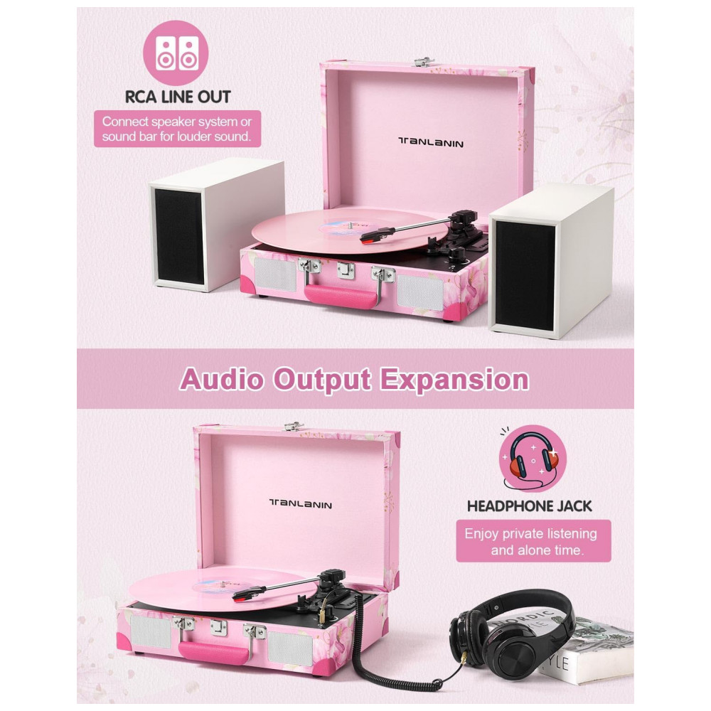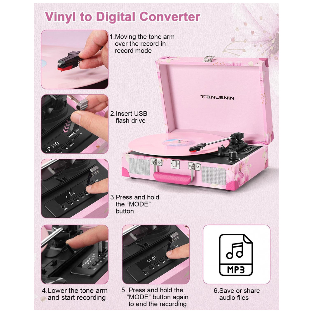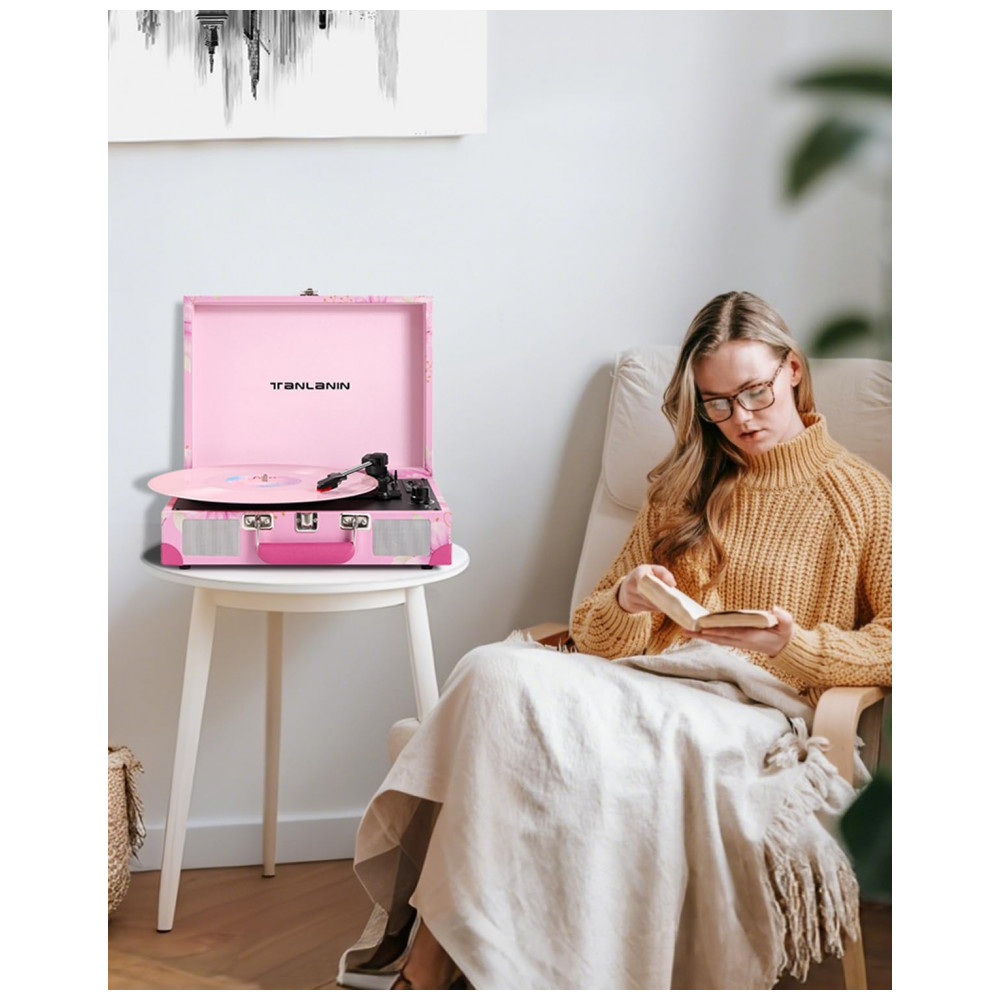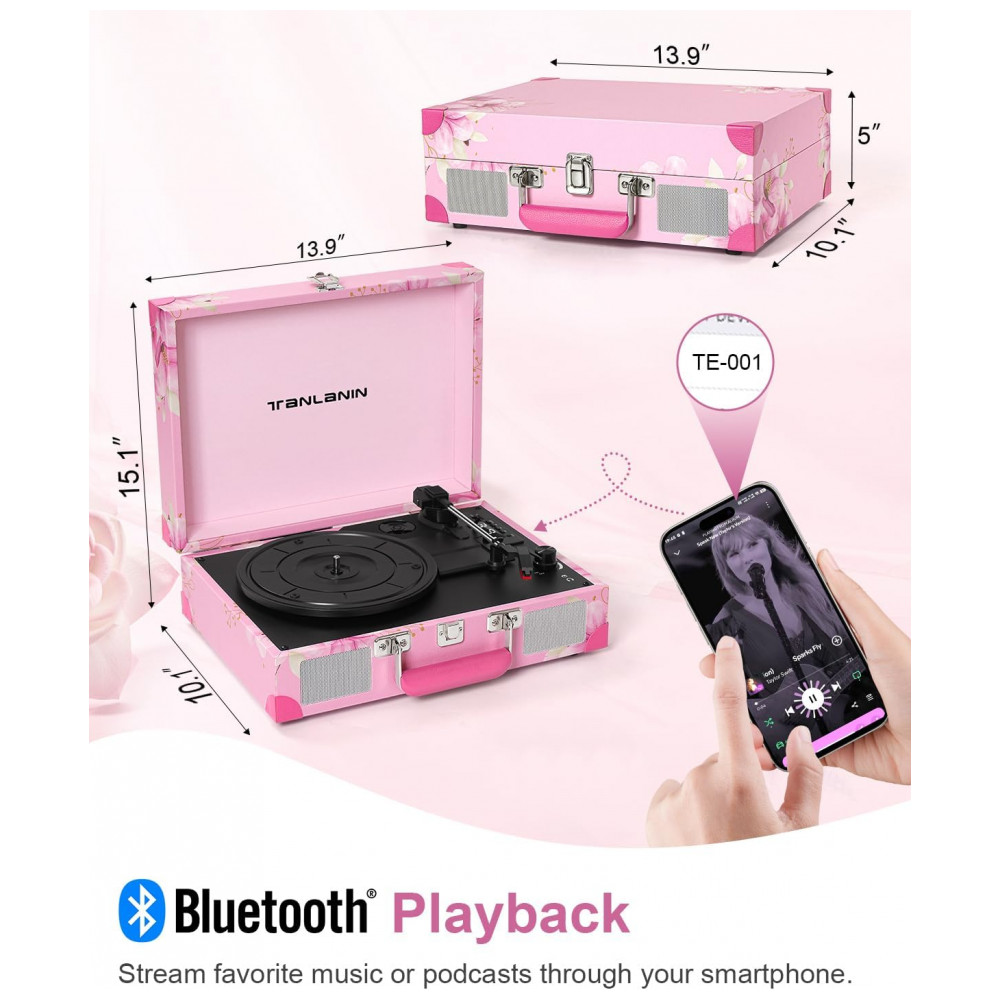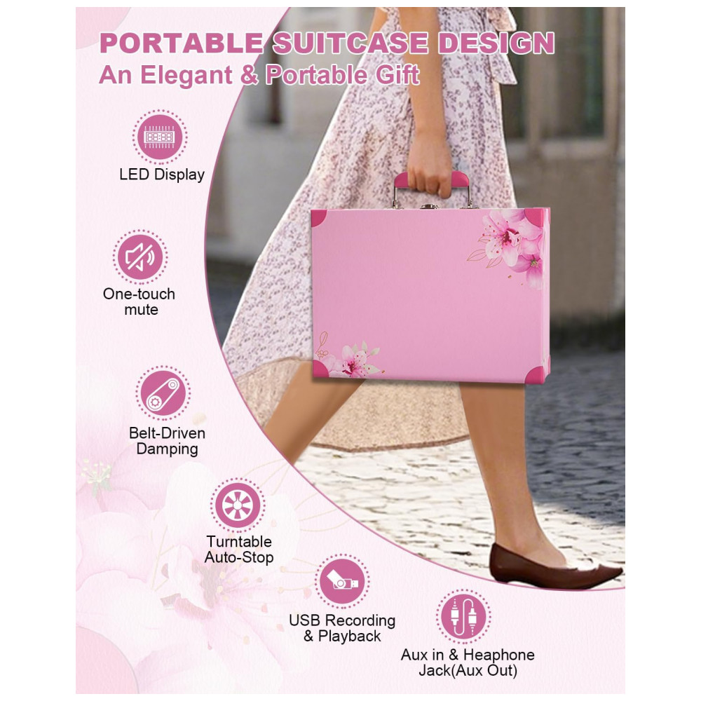 Aprecie a nostalgia com o Toca-discos de Vinil em uma maleta de couro rosa com flores, resistente e pronta para viagens. Com display LED amigável para iniciantes, é ideal para presentear amantes de vinil ou decorar sua casa. Grave suas músicas favoritas em alta qualidade, sem a necessidade de dispositivos externos. Controle de Velocidade Preciso, Proteção de Parada Automática e Conectividade Estendida com Bluetooth 5.0 e entrada AUX para reprodução sem fio ou com fio. Aproveite suas músicas em diversos dispositivos e sistemas de áudio.