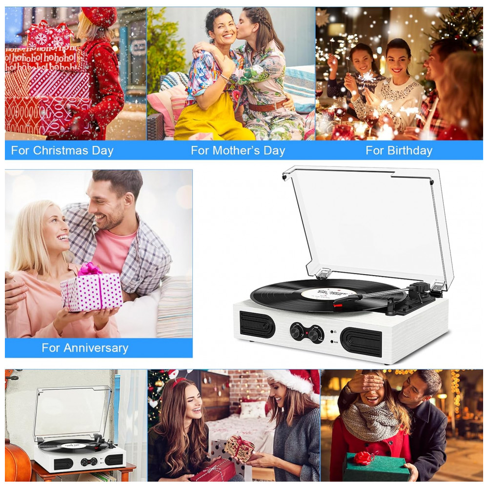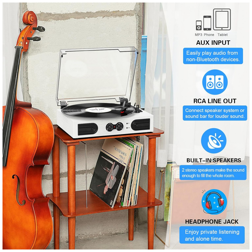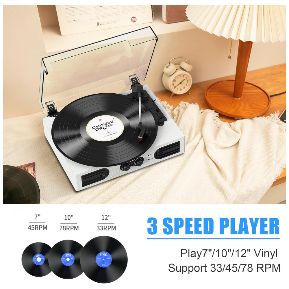 4 O toca discos branco tem 2 alto falantes estéreo integrados, uma base de correia atualizada com amortecedores de suspensão de mola e quatro pés de borracha para reduzir a vibração do motor e melhorar a qualidade do som.