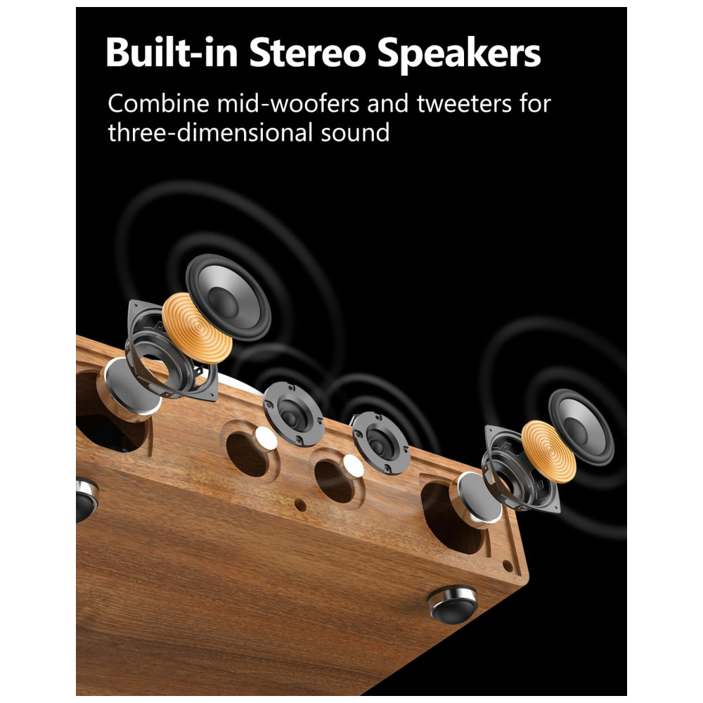 Desfrute de um som de estúdio natural e bem equilibrado com graves potentes graças aos 4 alto-falantes estéreo integrados – 2 tweeters de seda e 2 midbass speakers. A cápsula magnética e o braço de tom estático equilibrado reproduzem com fidelidade os detalhes dos discos, proporcionando áudio rico, quente e com excelente clareza sonora. O design de madeira natural e a luz ambiente quente criam uma atmosfera única e elegante. Além disso, a conectividade Bluetooth permite reproduzir músicas de forma wireless. Um presente perfeito para os amantes de música.