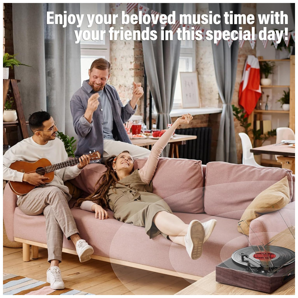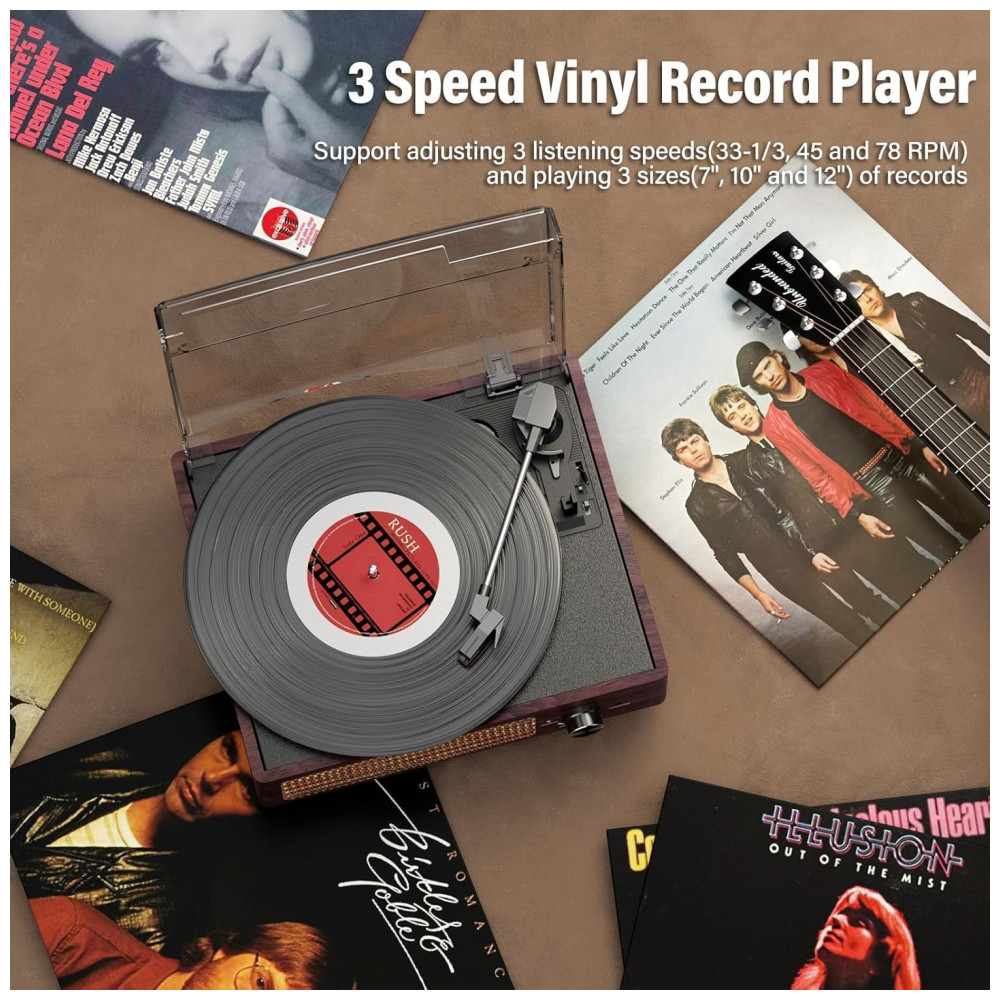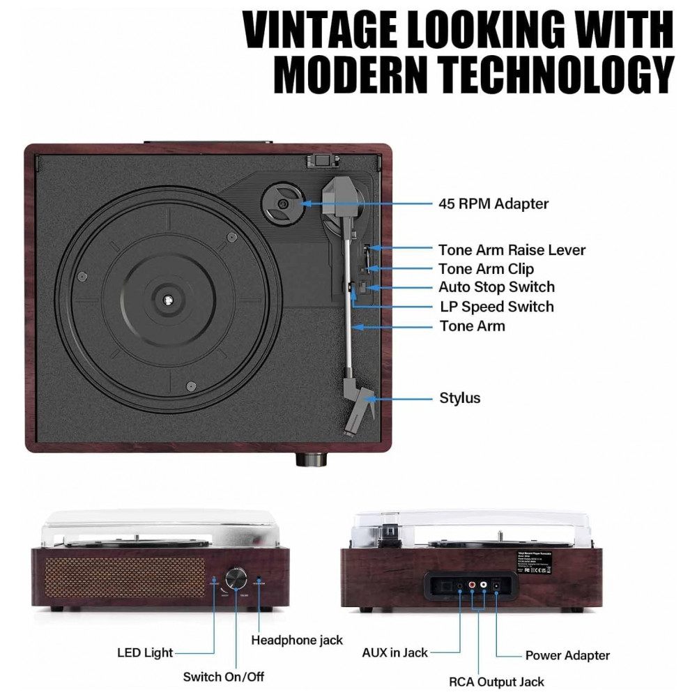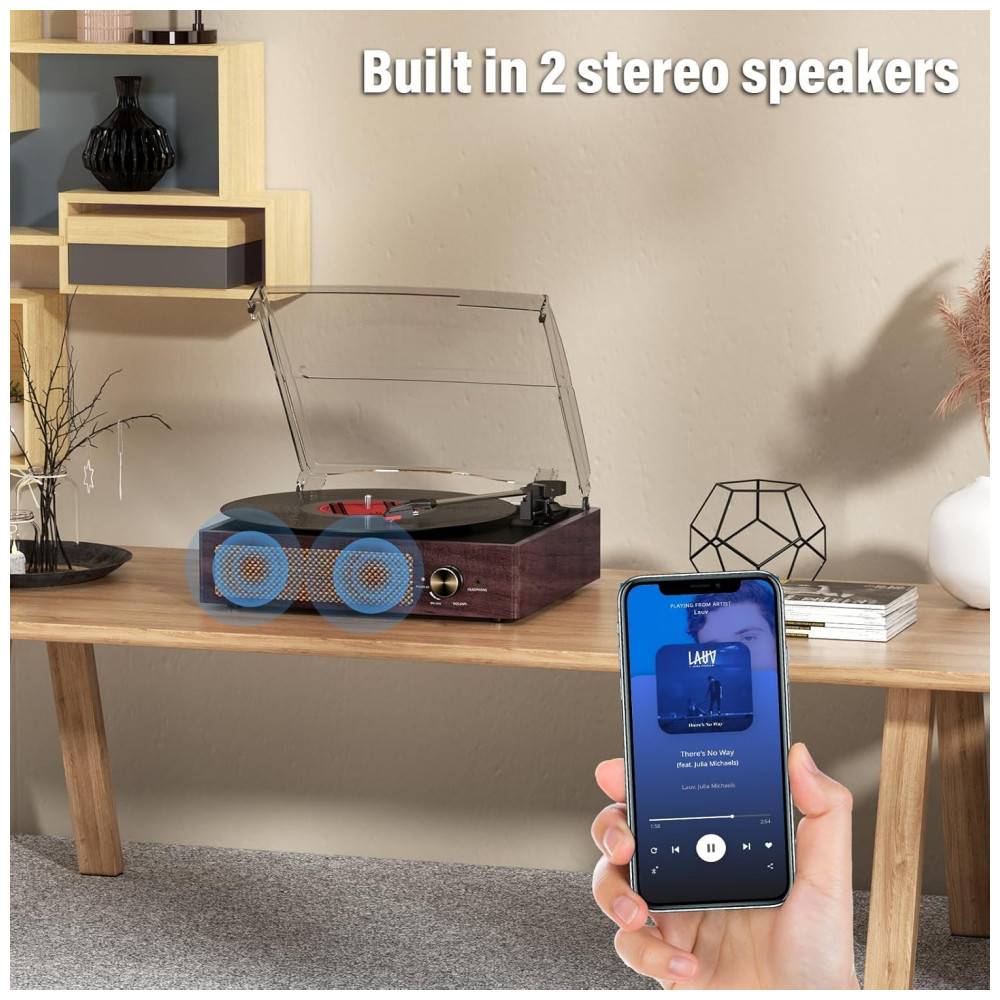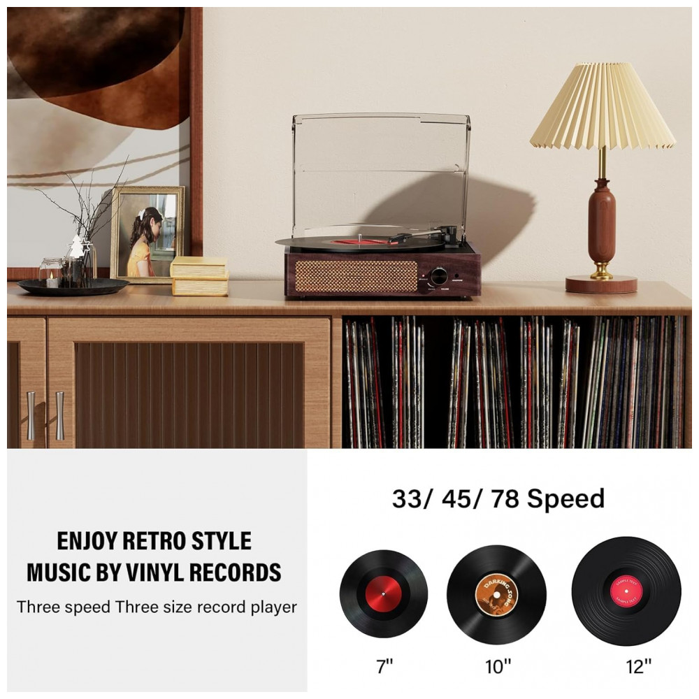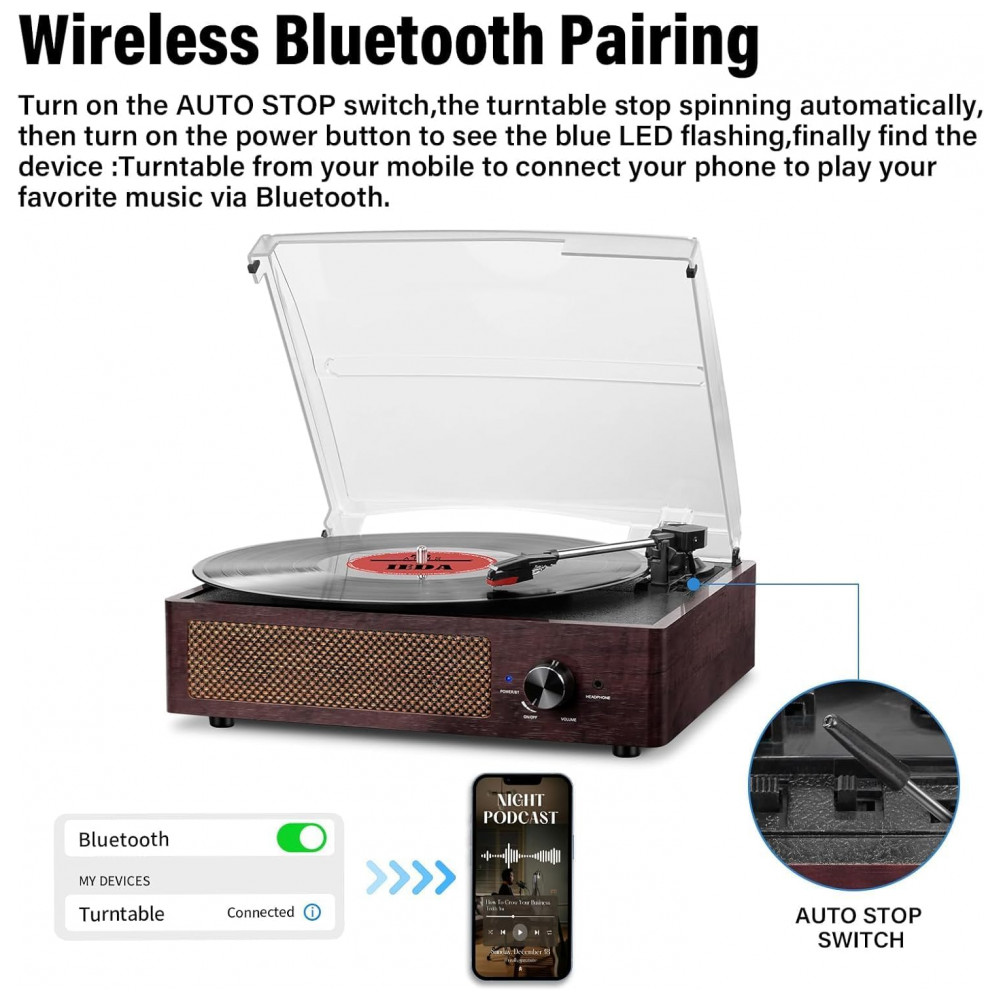O Toca-discos All-in-one com entrada Bluetooth, entrada de áudio AUX, saída de linha RCA e saída para fone de ouvido. Possui 2 alto-falantes estéreo embutidos com tecnologia Bluetooth para ouvir músicas elegantemente do seu smartphone. Utilize a entrada Auxiliar para reproduzir diretamente suas músicas ou aproveite o tempo com fones de ouvido. Para um som melhor ou mais alto, conecte um alto-falante externo via cabo RCA. Fácil de usar, configuração e operação simples, ideal para amantes de vinil. Possui três velocidades de reprodução – 33, 45, 78 RPM, reproduzindo todos os seus discos de vinil de 7″, 10″ e 12″. Ao colocar um disco de vinil de 12 polegadas no toca-discos, incline suavemente em direção ao braço para garantir a reprodução adequada. Com receptor Bluetooth integrado e 2 alto-falantes estéreo, você pode ouvir suas músicas favoritas do seu dispositivo compatível com Bluetooth, como smartphones, com facilidade. Design portátil que cria uma atmosfera acolhedora em encontros familiares e ajuda a relaxar quando você está sozinho. Mesmo sem uso, pode ser uma das decorações premium da casa. Com design retrô, possui uma tampa removível para proteger vinil e prato do toca-discos. Você pode fechar a tampa para proteger e manter a poeira longe. A bela textura exterior se encaixa perfeitamente em qualquer ambiente.