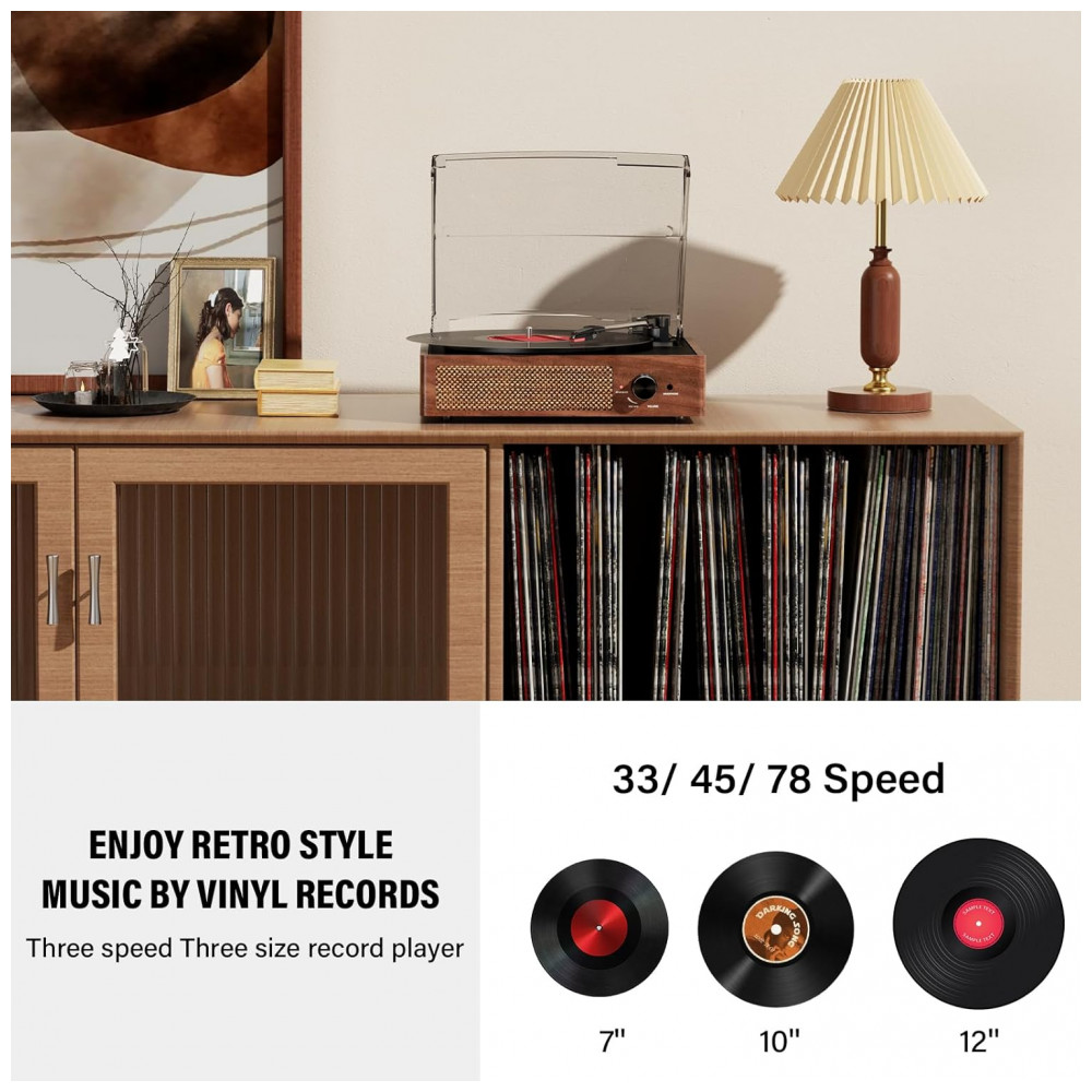 Toca-discos de Vinil com Receptor Bluetooth Integrado e 2 Alto-falantes Estéreo – Portátil de 3 Velocidades e 3 Tamanhos para Entretenimentocotsoco