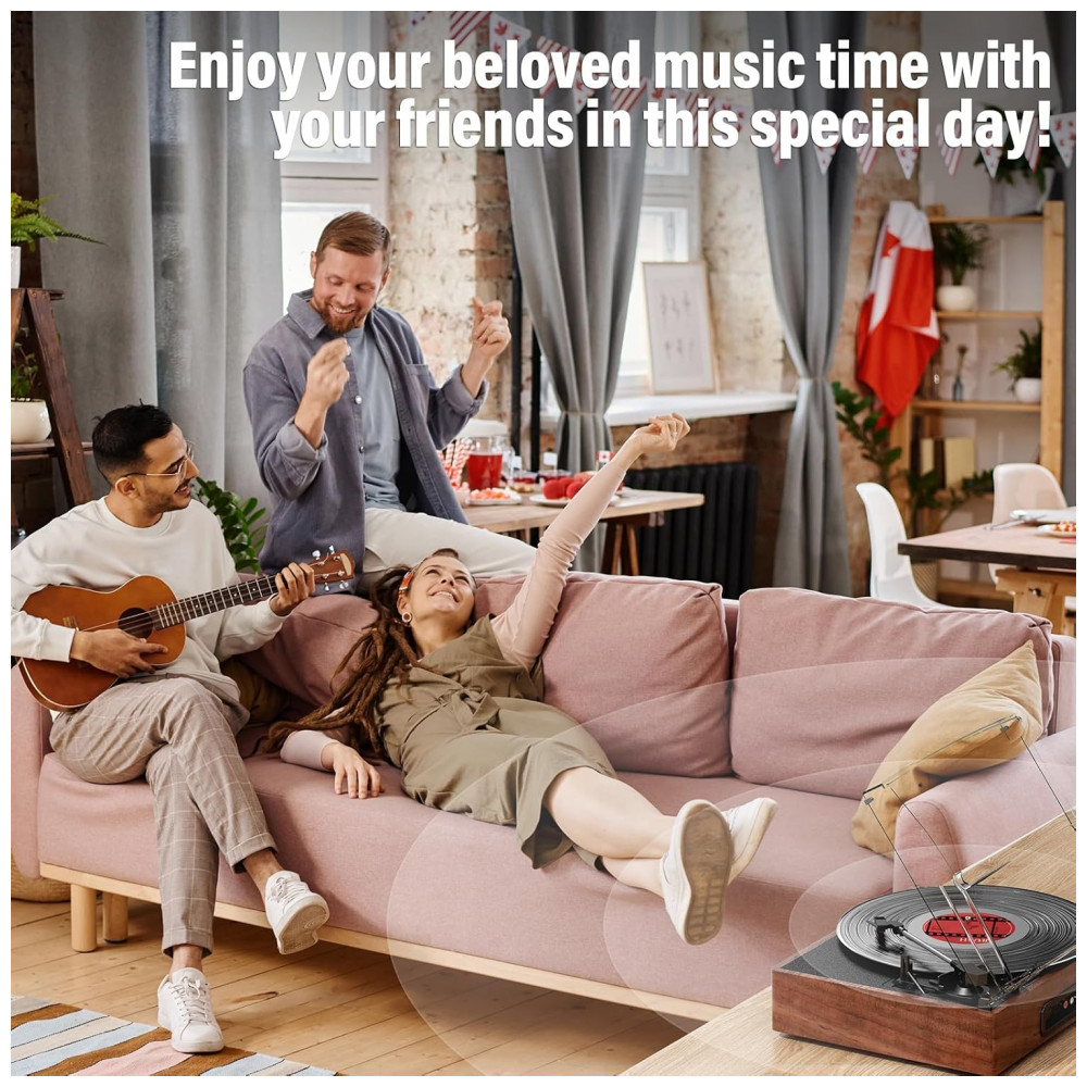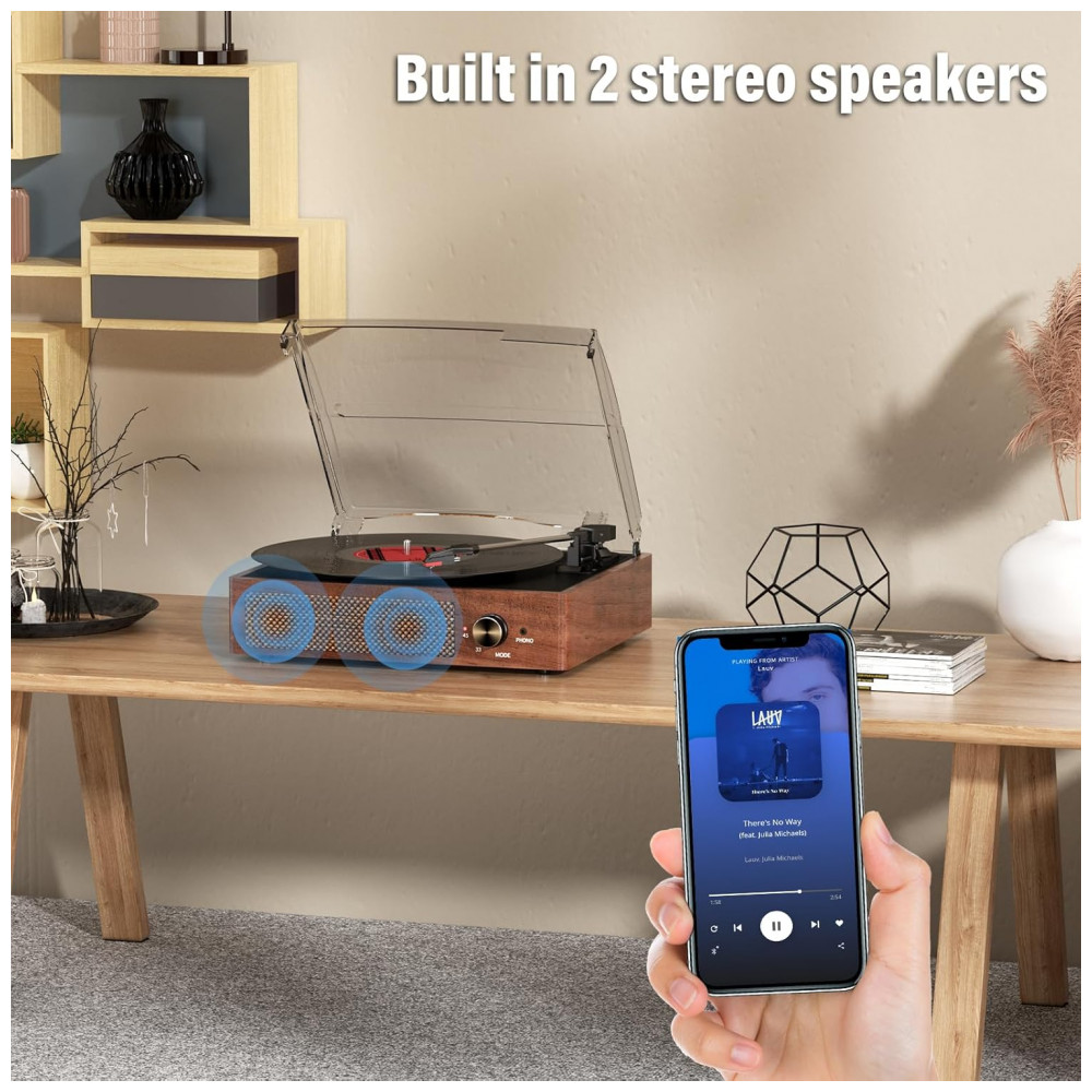 Este toca-discos tudo-em-um possui entrada Bluetooth, entrada de áudio AUX, saída de linha RCA e entrada para fones de ouvido. Com 2 alto-falantes estéreo embutidos e tecnologia sem fio Bluetooth, você pode ouvir música elegantemente do seu smartphone. Use a entrada Aux para reproduzir diretamente a música ou aproveite com fones de ouvido. Para um som melhor, conecte um alto-falante externo via cabo RCA. Fácil de usar e configurar, é ideal para os amantes de vinil. Reproduz a 33, 45 e 78 RPM em todos os seus discos de vinil de 7″, 10″ e 12″. O toca-discos possui receptor Bluetooth integrado e 2 alto-falantes estéreo, permitindo ouvir música do seu dispositivo Bluetooth compatível, como smartphone. Basta conectar via Bluetooth e reproduzir. Crie uma atmosfera aconchegante em reuniões familiares ou relaxe quando estiver sozinho. Mesmo sem uso, é uma peça de decoração premium para a casa. Com design retrô e tampa removível para proteção do vinil e do prato do toca-discos, este toca-discos portátil é uma peça perfeita para qualquer ambiente.