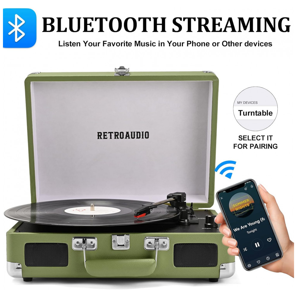 Toca-discos de Vinil Portátil Bluetooth 3 Velocidades em Maleta Verde Oliva RetroAudio