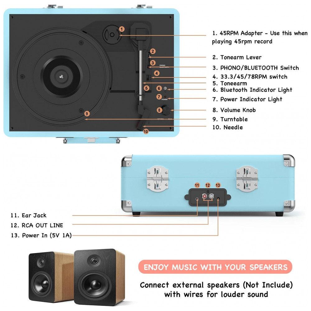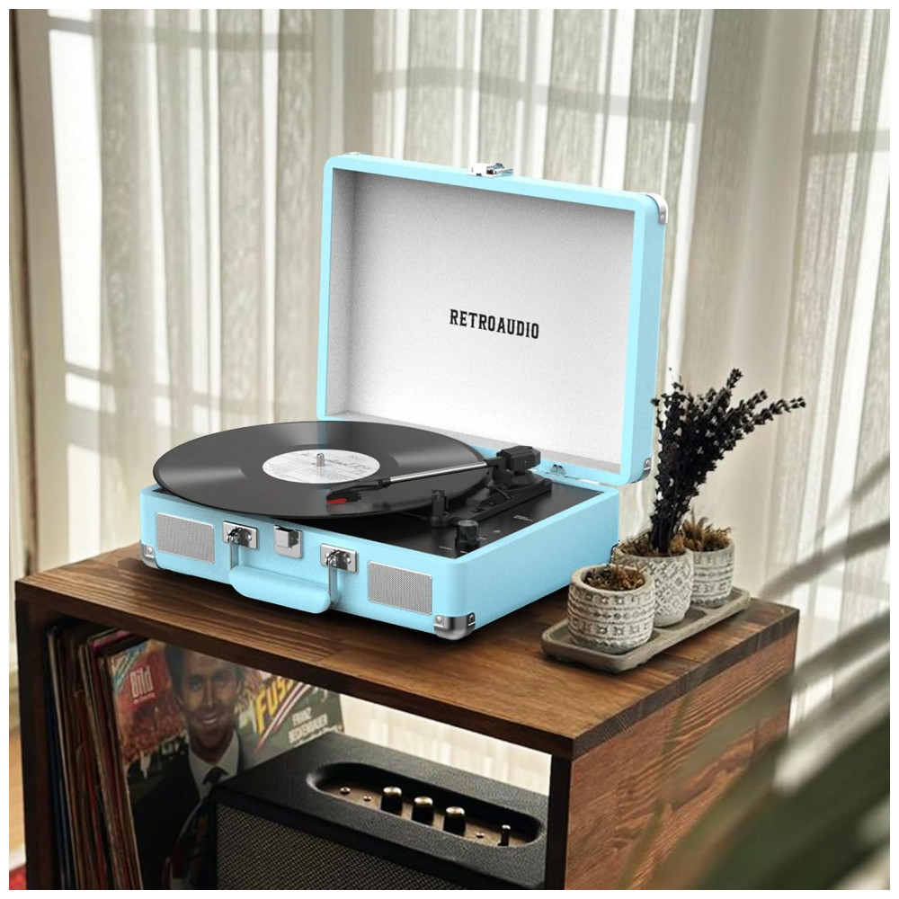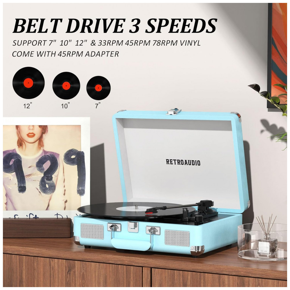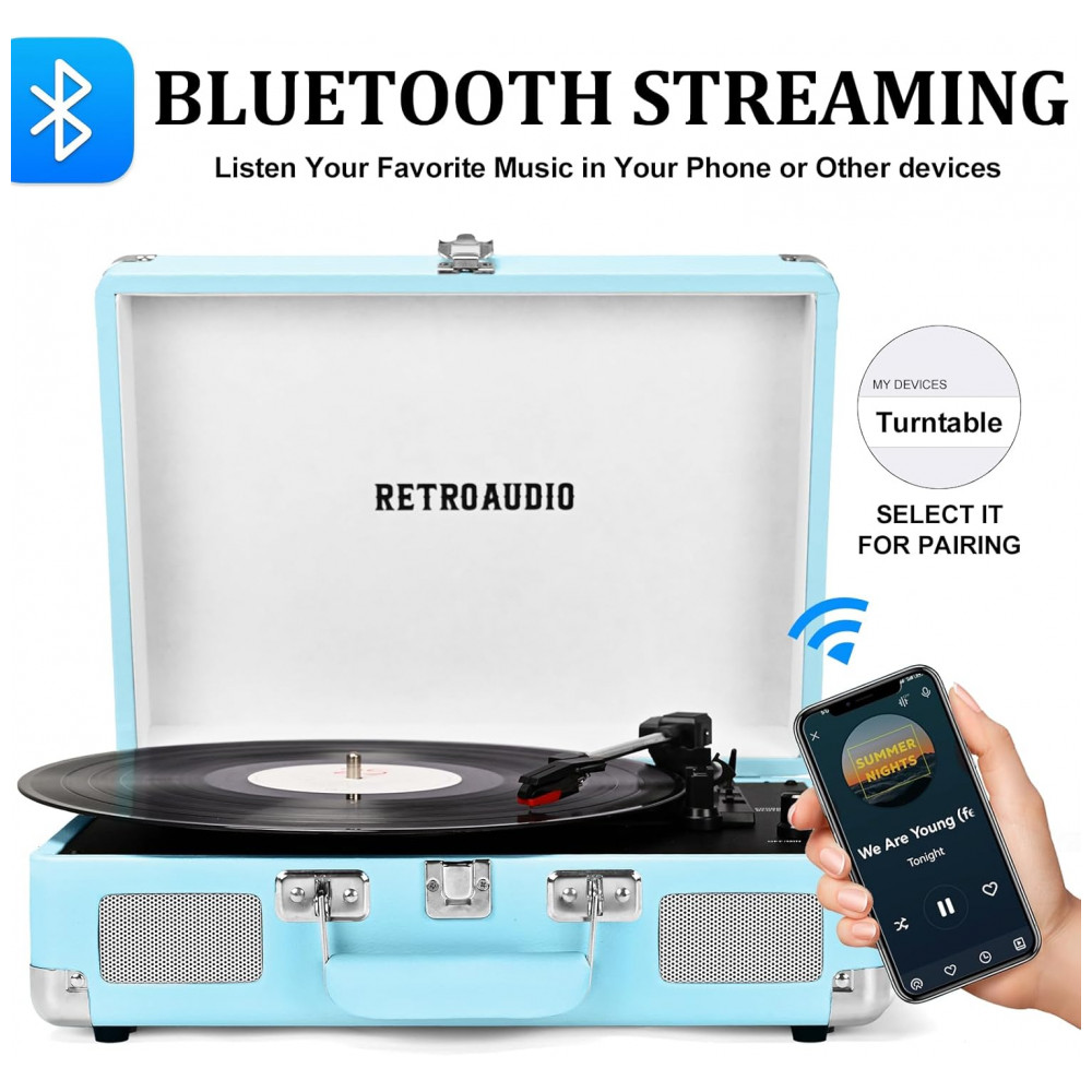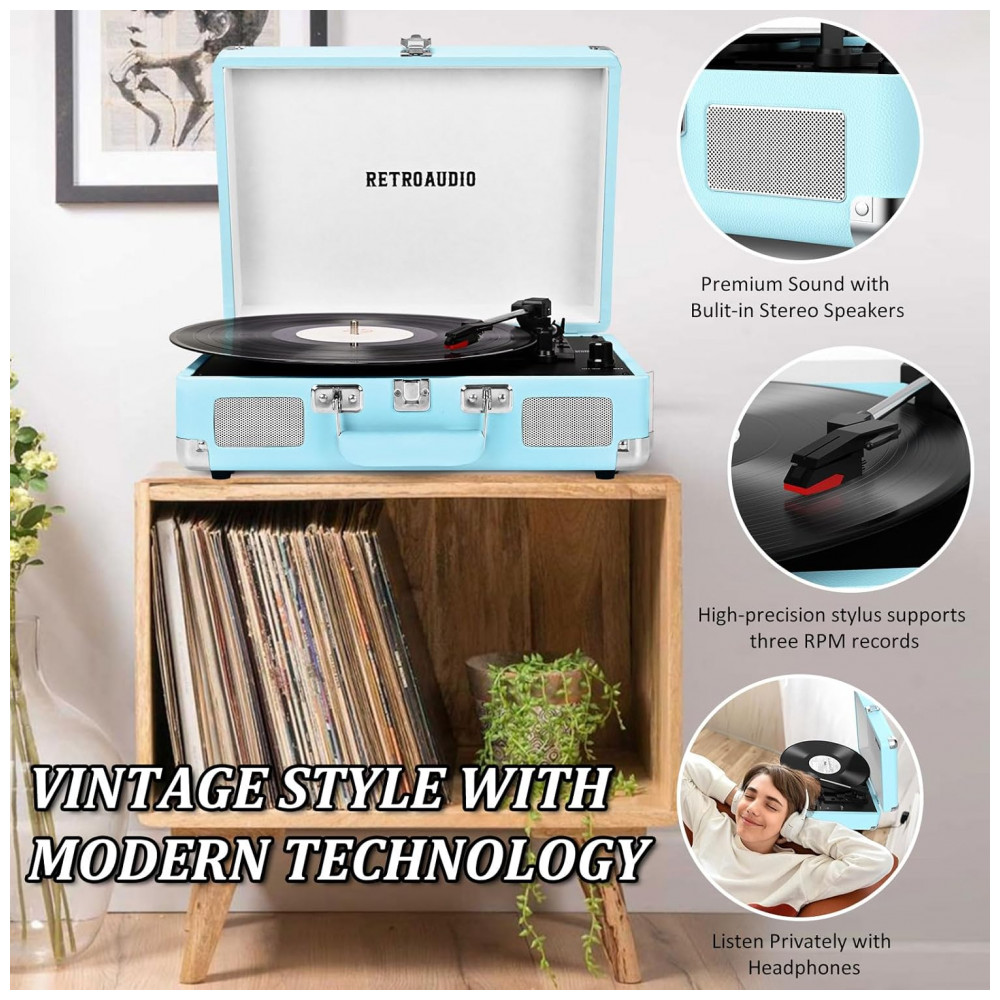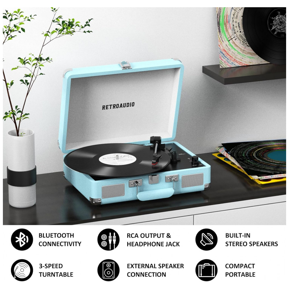 Toca-discos de Vinil Portátil Bluetooth de 3 Velocidades em Maleta com Alto-falantes Estéreo Embutidos – RetroAudio