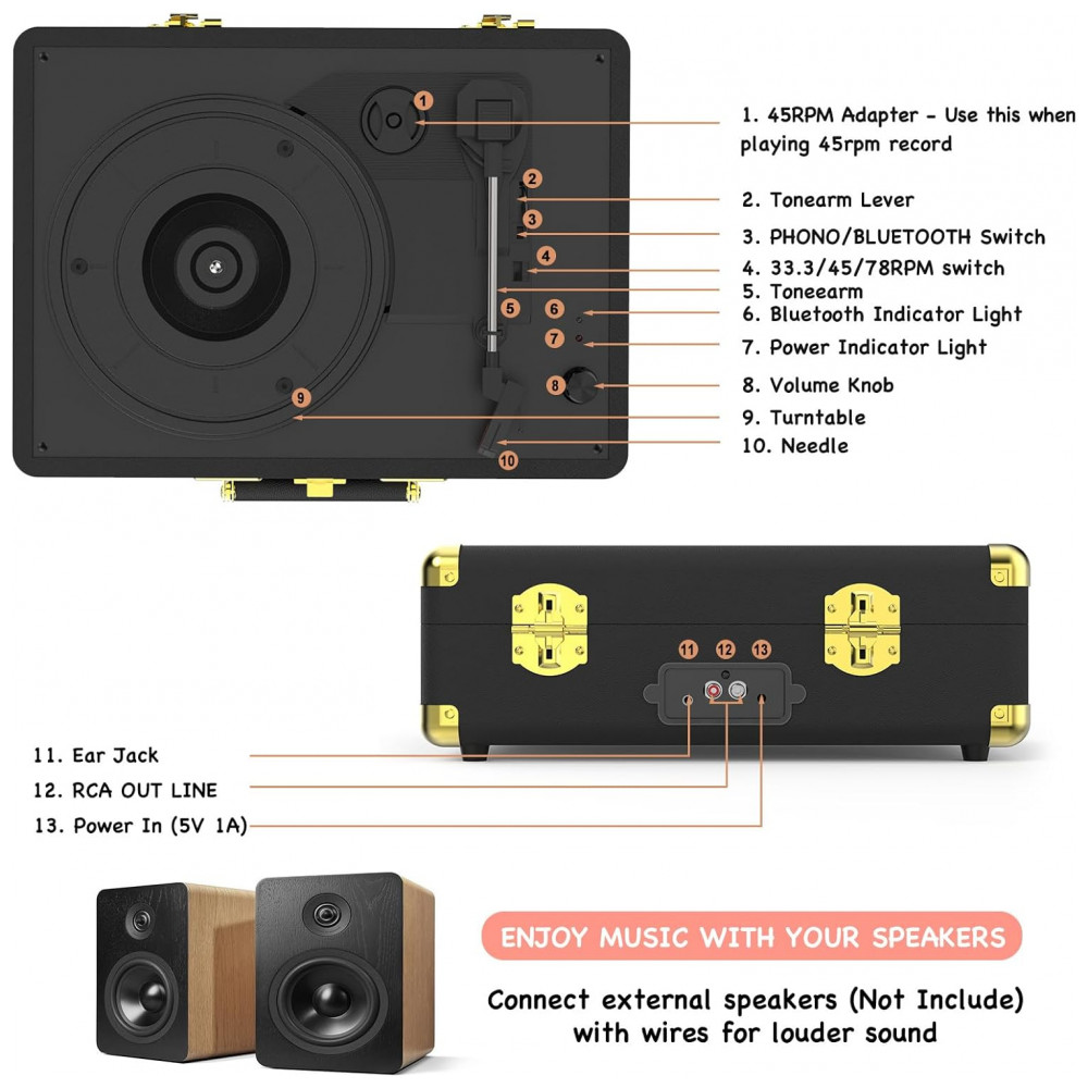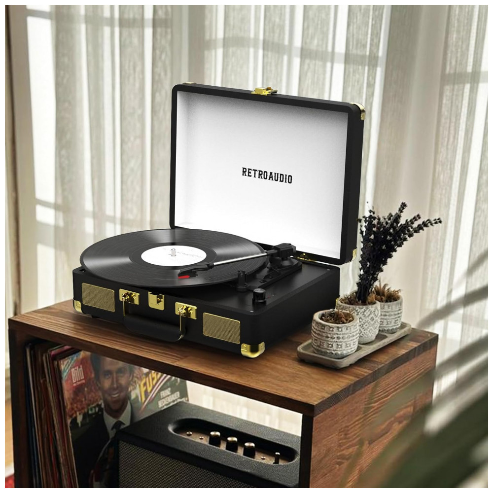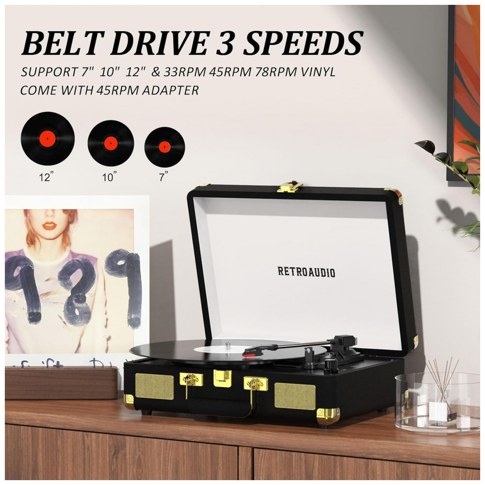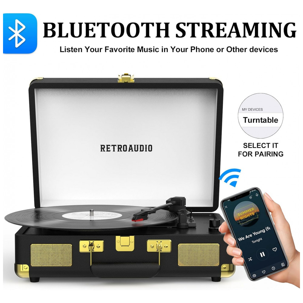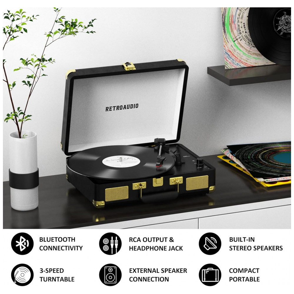 Toca-discos de Vinil Portátil Retro com Bluetooth 3 Velocidades em Maleta Alto-falantes Estéreo Embutidos Saída RCA – RetroAudio