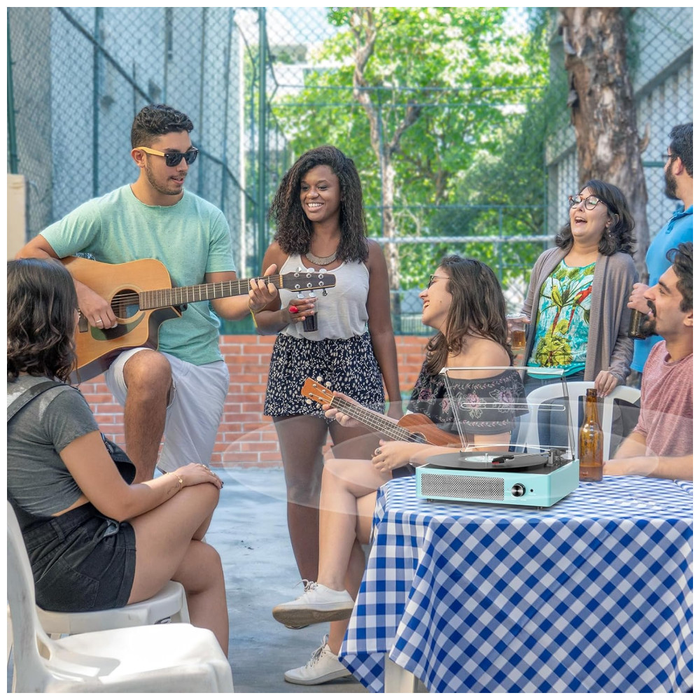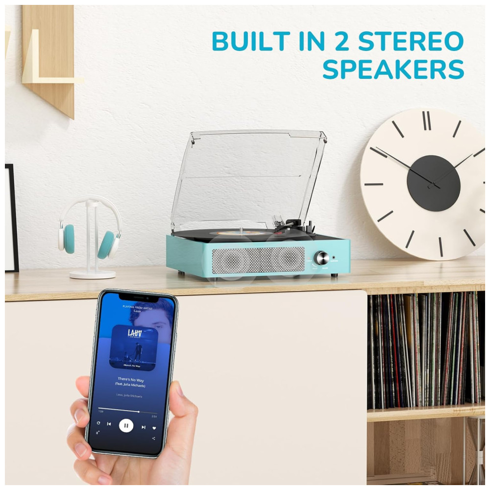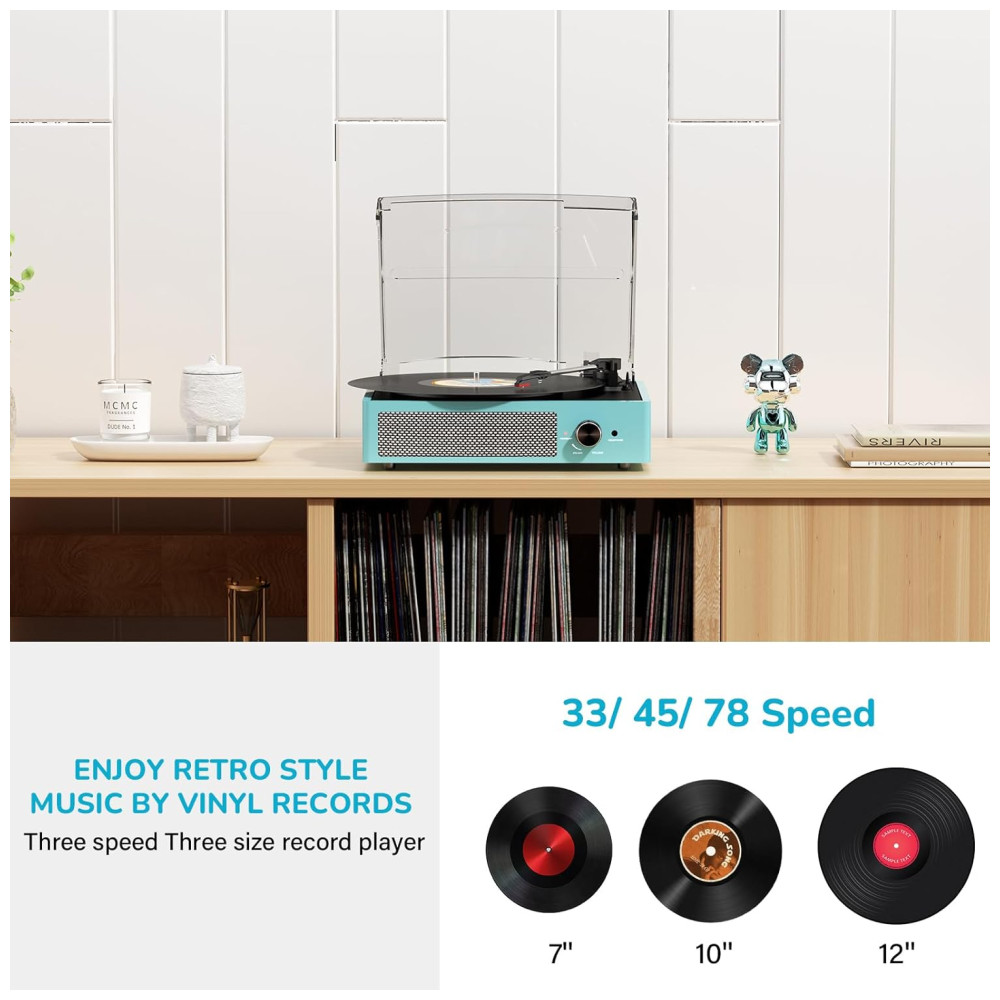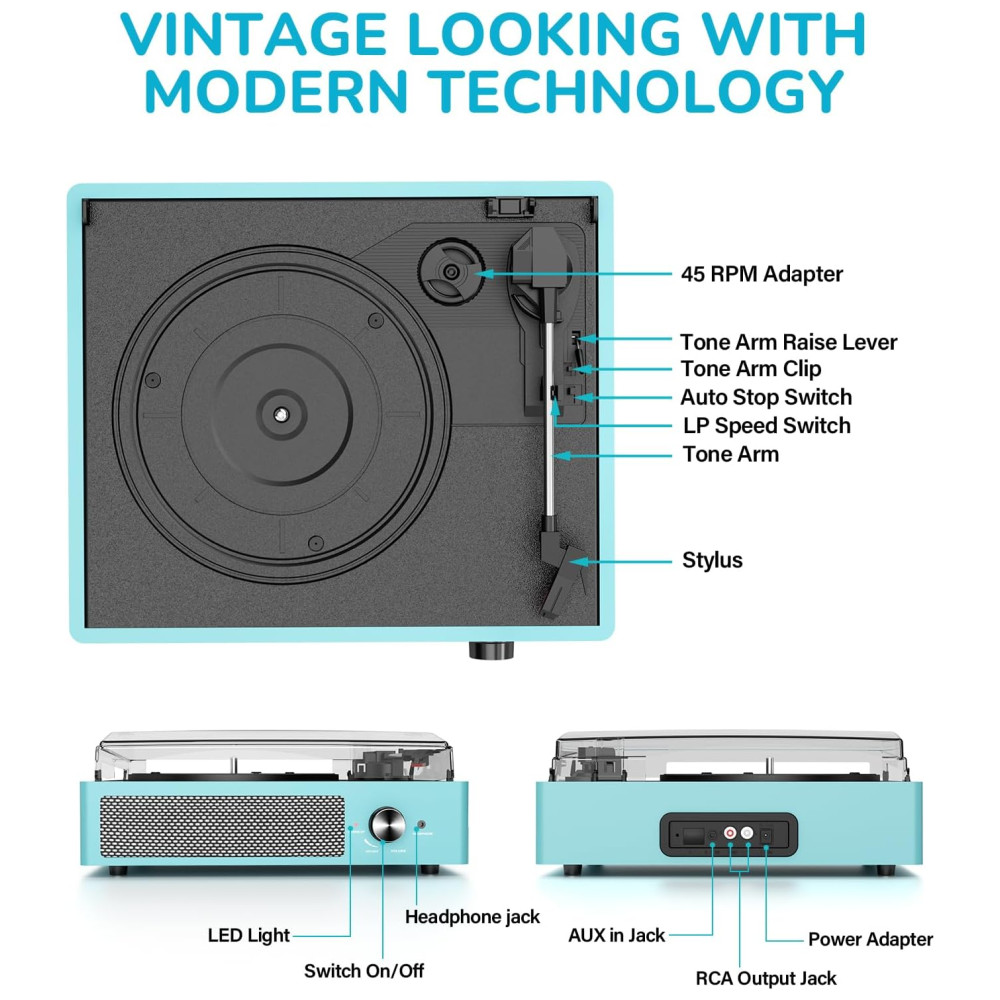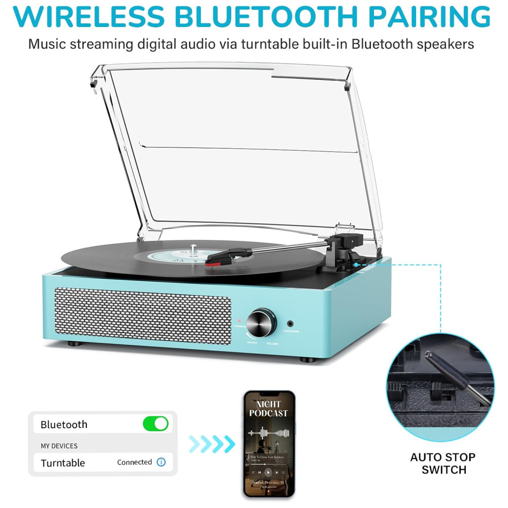 Toca-discos de Vinil Vintage com Bluetooth 2 Alto-falantes 3 Velocidades Entrada AUX Saída RCA Fone de Ouvido – Azul Céu