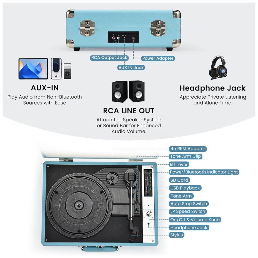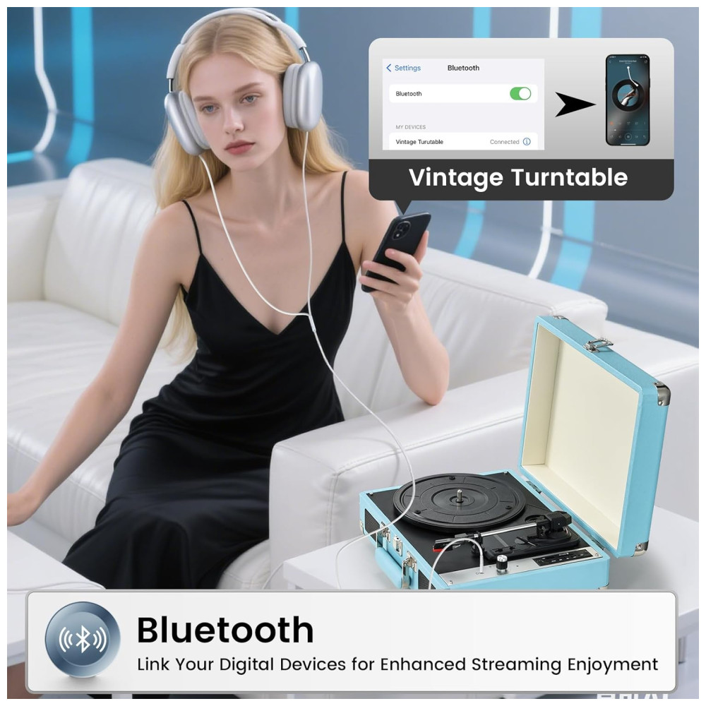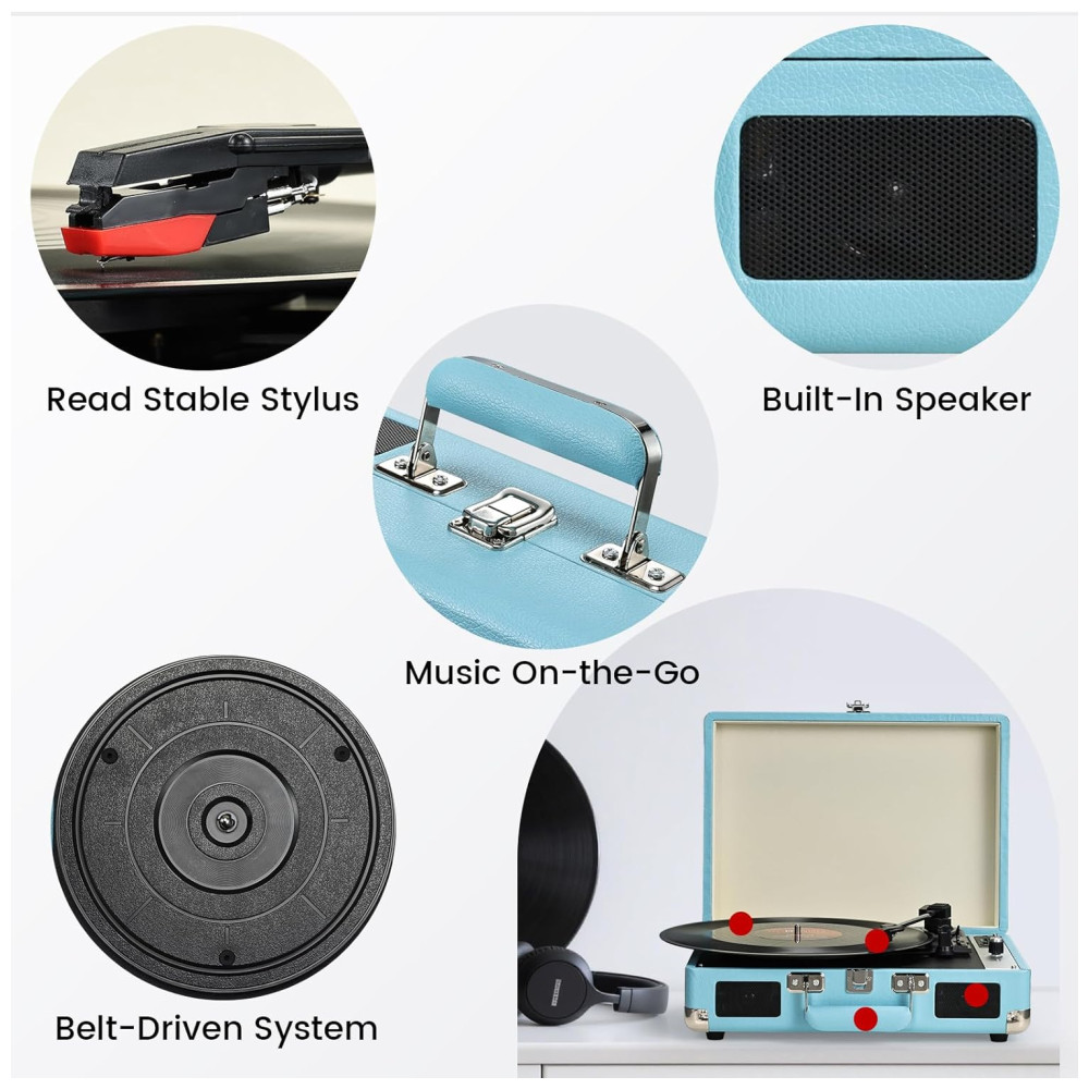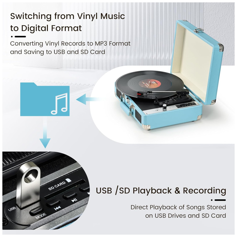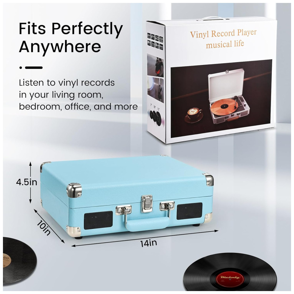 Toca-discos Hododou Vinyl Record Player Portátil com Bluetooth 3 Velocidades e Gravação USB – Alto-falantes Integrados – Azul