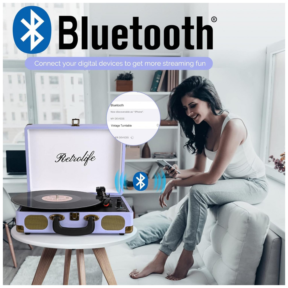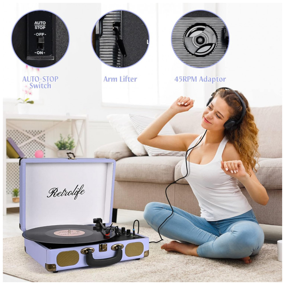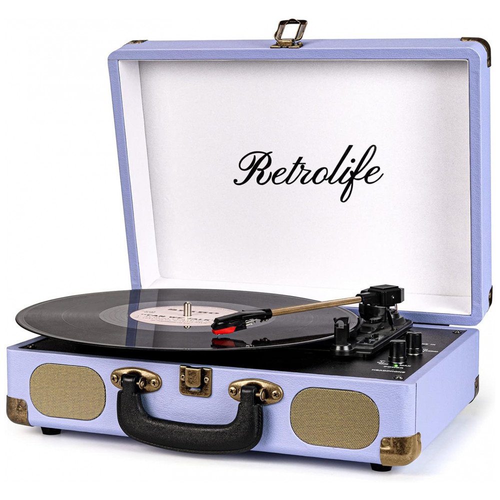 Toca-Discos Portátil Retrolife 3 Velocidades Bluetooth em Maleta com Alto-falantes Integrados Saída RCA Entrada AUX e Conector para Fone de Ouvido –
