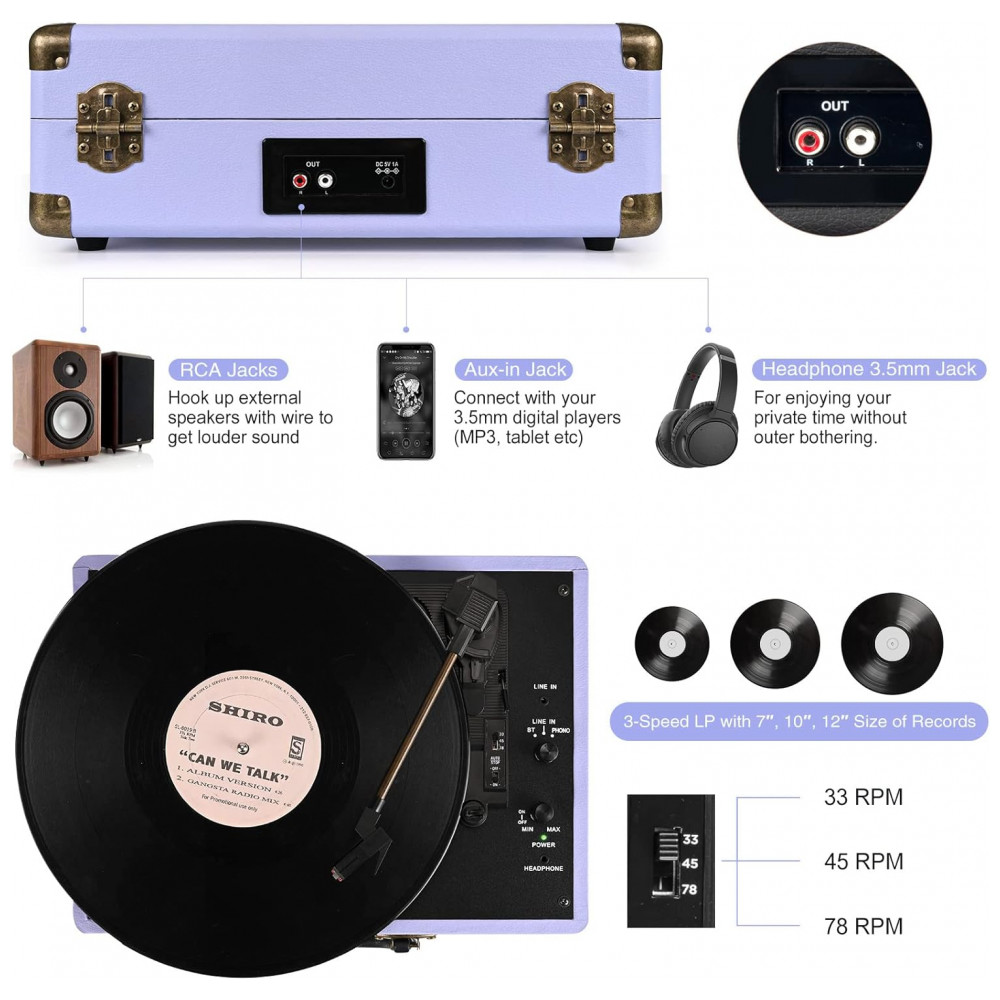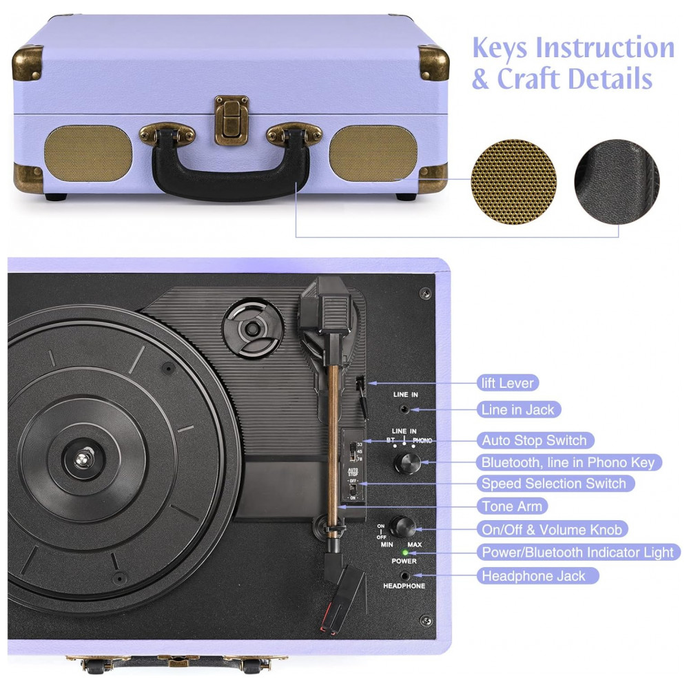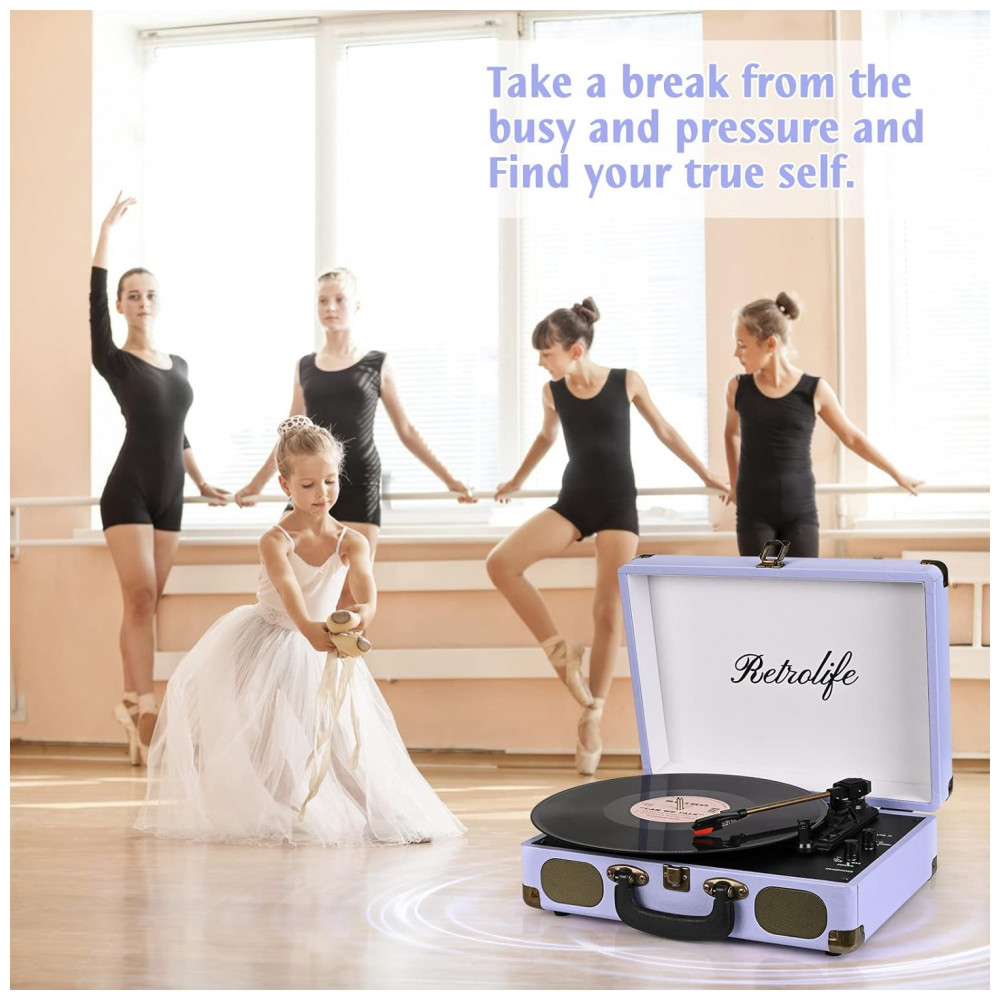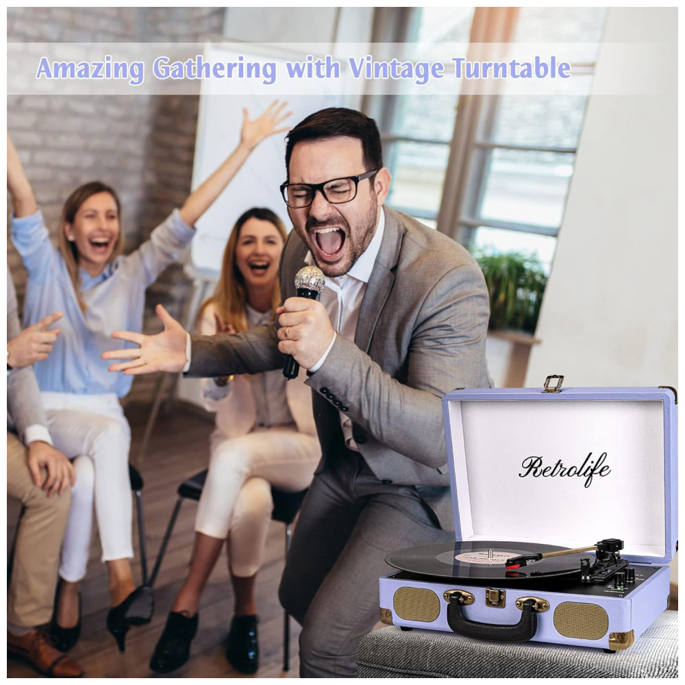 Toca-Discos Portátil Retrolife 3 Velocidades Bluetooth em Maleta com Alto-falantes Integrados Saída RCA Entrada AUX e Conector para Fone de Ouvido –