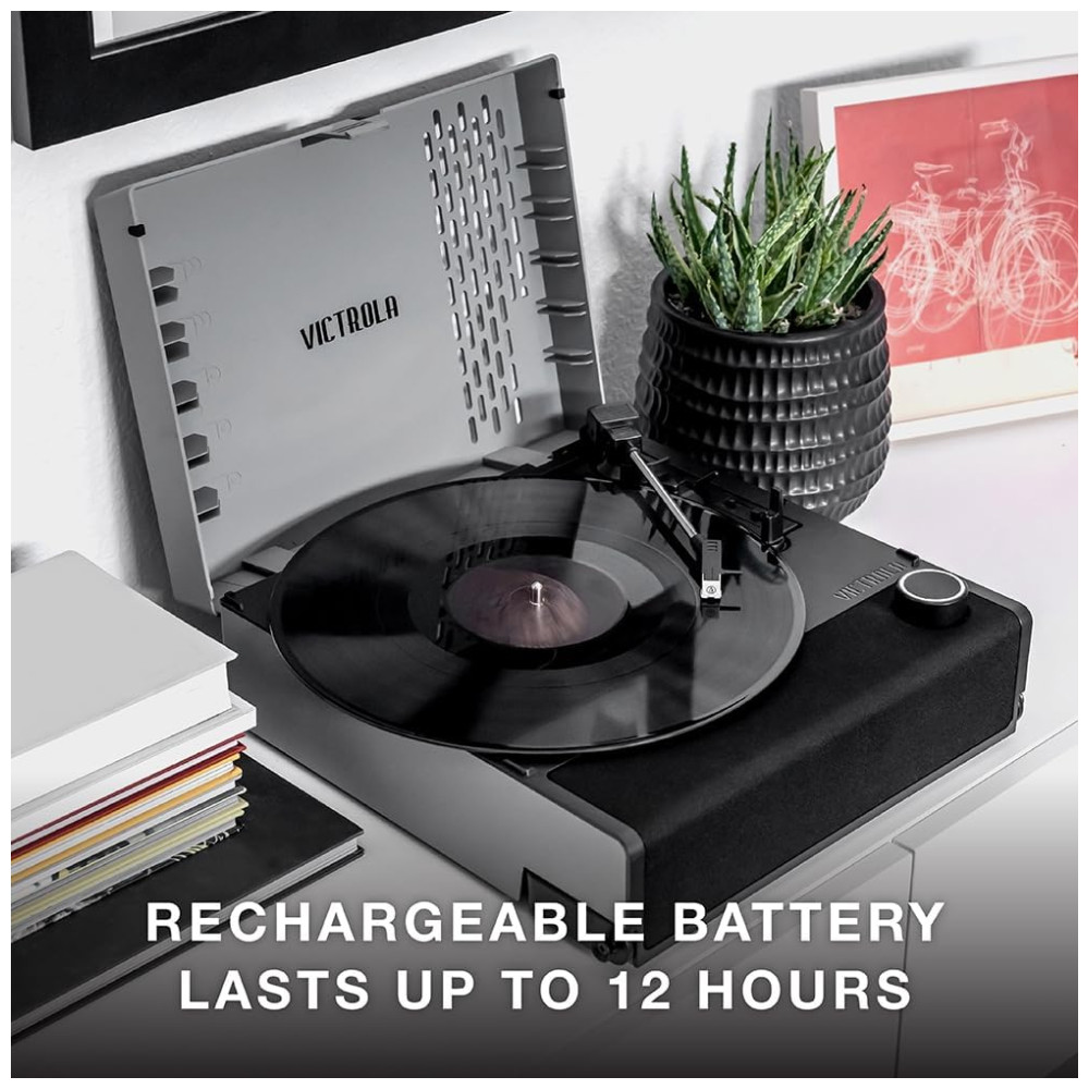 O Victrola Revolution GO é um toca-discos premium com design moderno e funcionalidades que se adequam ao seu estilo de vida. Com uma bateria recarregável integrada de 12 horas de reprodução, você pode levá-lo para onde quiser, seja em casa, na casa de um amigo ou na loja de discos local. Os alto-falantes estéreo integrados oferecem um som rico e completo, mas caso precise de mais volume, a tecnologia Vinyl Stream Bluetooth permite que você conecte o toca-discos ao seu alto-falante favorito. Se preferir mais privacidade, basta conectar seus fones de ouvido Bluetooth. O cartucho magnético AudioTechnica premium proporciona excelente reprodução de som e o gabinete de som proprietário e base flutuante evitam vibrações nos alto-falantes e no braço de tom. O Revolution GO possui 3 velocidades de 13, 45 e 78 RPM e um adaptador de 45, permitindo que você ouça qualquer tipo de vinil. Além disso, a tampa removível funciona como um suporte de vinil para até 5 discos. Com o Revolution GO, você pode seguir seu próprio caminho e com estilo.