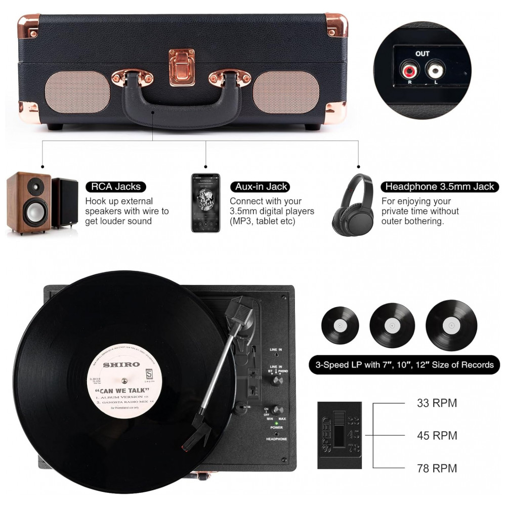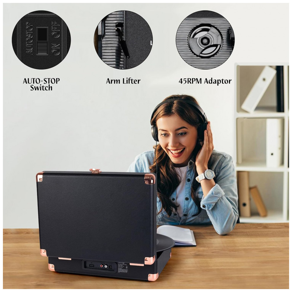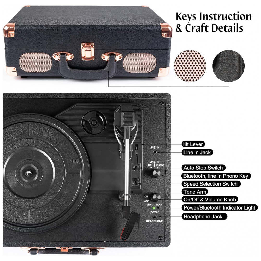Desfrute de quatro opções de conexão disponíveis: transmita áudio digital via Bluetooth embutido no toca-discos. Conecte alto-falantes externos através da saída RCA ou entrada Aux-in para dispositivos sem Bluetooth, como MP3. Você também pode usar seus fones de ouvido para ouvir em privacidade. Com capacidade para discos de 7, 10 e 12 polegadas e 3 velocidades de reprodução, esse toca-discos beltdriven combina um design antiressonância para proporcionar melhor qualidade de som. Configure facilmente em minutos, ideal para iniciantes e entusiastas de vinil. O toca-discos retro em formato de maleta combina elementos modernos e vintage, com detalhes clássicos em couro PU preto e parafusos de metal bronze. Possui alça resistente para ser levado a todos os lugares. Inclui botões úteis, como o interruptor de parada automática e a alternância de modo Bluetooth/Aux-in/Phono. Perfeito para relaxar, festas e eventos.
