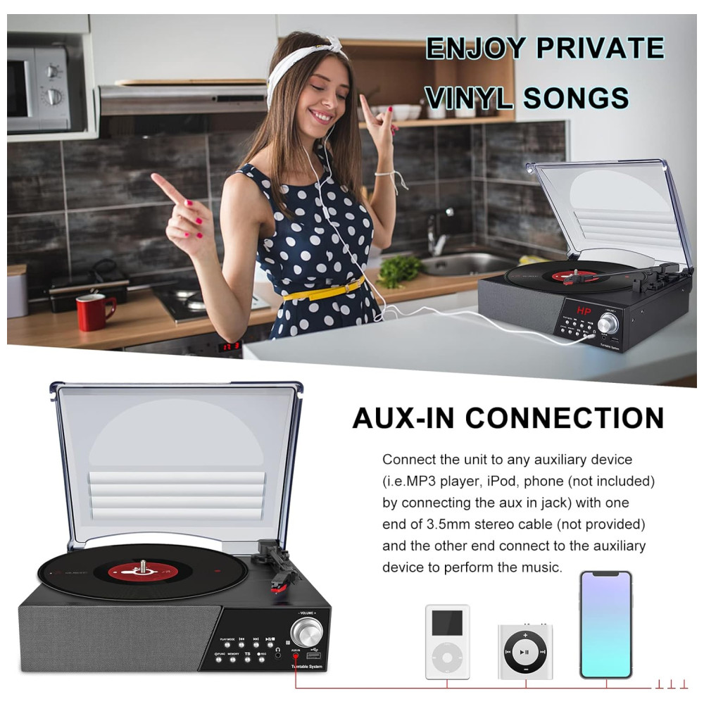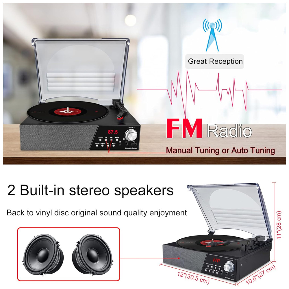 Mesas giratórias de 3 velocidades O toca discos suporta velocidades de reprodução de 33, 45, 78 RPM com 3 tamanhos de discos de vinil de 17,25 e 30 centímetros. Inclui adaptador de 45 RPM para reproduzir o disco de vinil de 17 centimetros. Quando a parada automática é ativada, ela para automaticamente no final da gravação