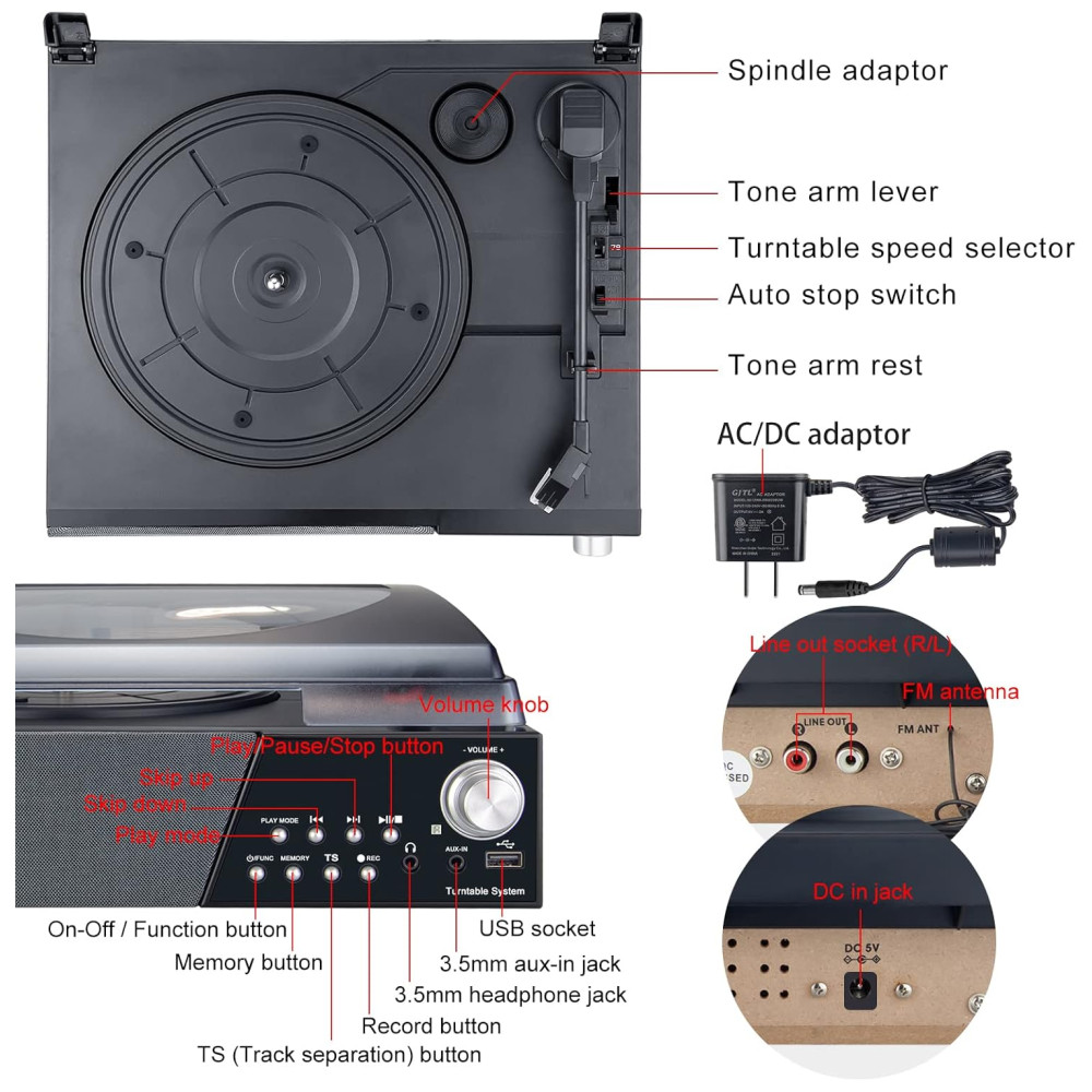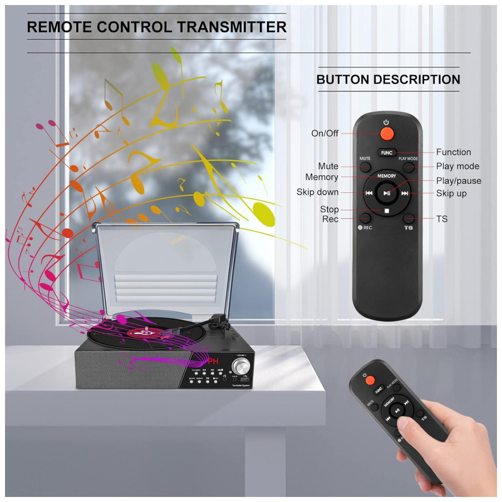 Recodificação de vinil para MP3 com controle remoto Converte vinil para o formato MP3 e zena em uma unidade flash USB para levar a qualquer lugar para ouvir. Através do botão TS, você pode separar a música de gravação em pastas. O toca discos com controle remoto facilita toda a sua operação.