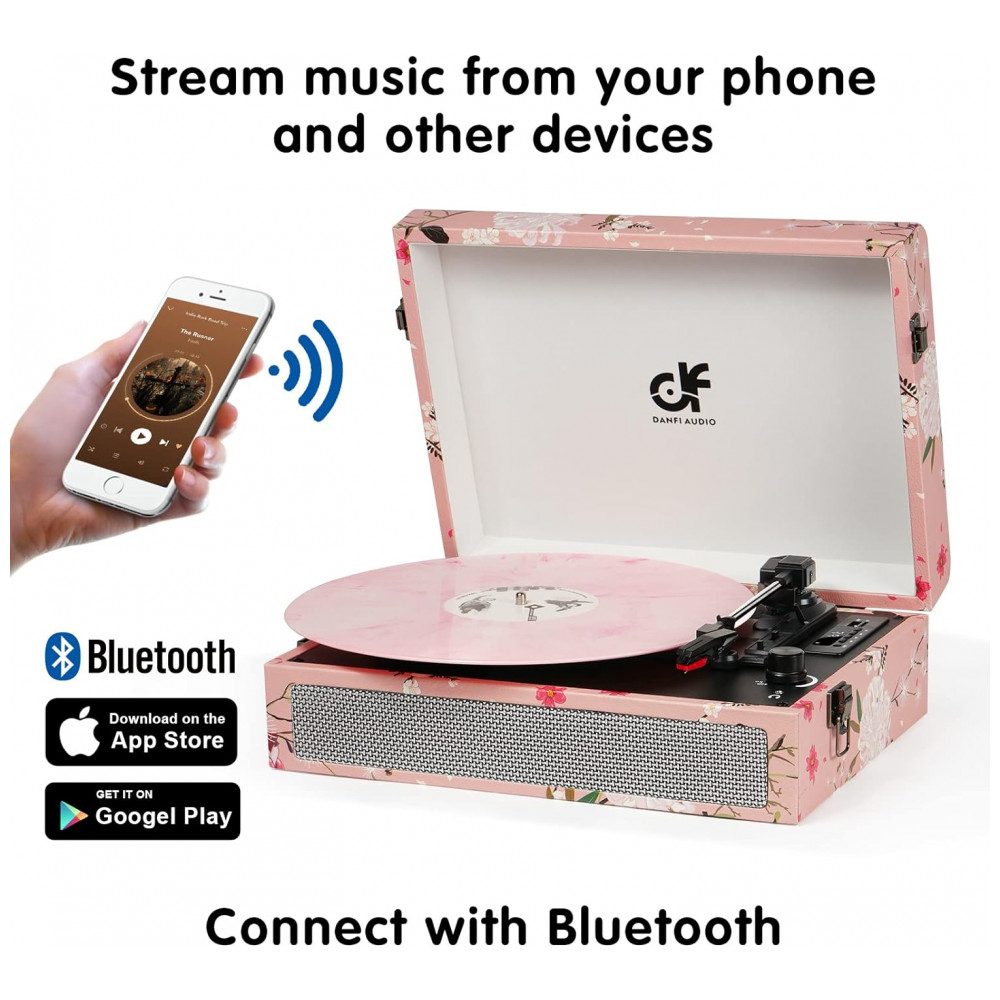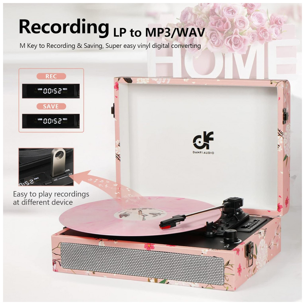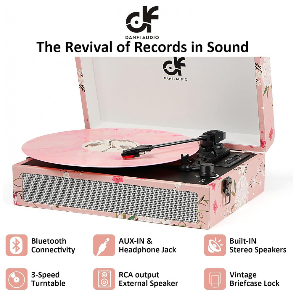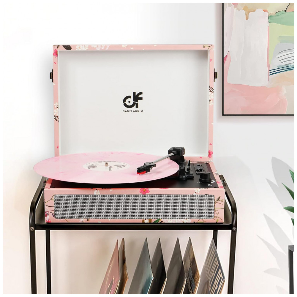 Toca Discos Retro 3 Velocidades com Bluetooth USB e Alto Falantes Embutidos DANFI ÁUDIO DF TE012PK Rosa