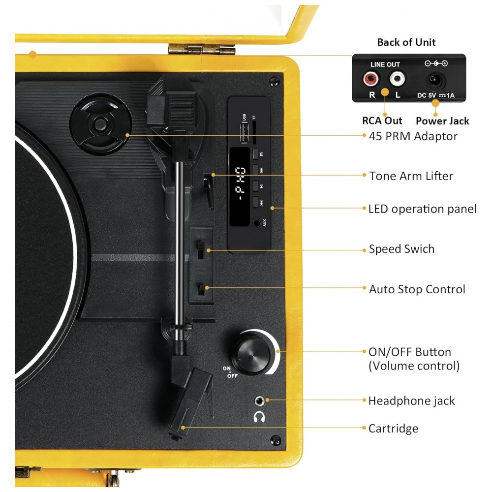 PERFEITO COMO PRESENTE Este toca discos amarelo tem um visual vintage brilhante, vai animá lo enquanto você olhar para ele. Fácil de configurar e o painel de exibição LED garante que qualquer um de seus amigos ou familiares possa usá lo facilmente. Melhor para entretenimento e decoração de casa, o toca discos acessível é um presente ideal para amantes de música em vinil, iniciantes e entusiastas do vintage