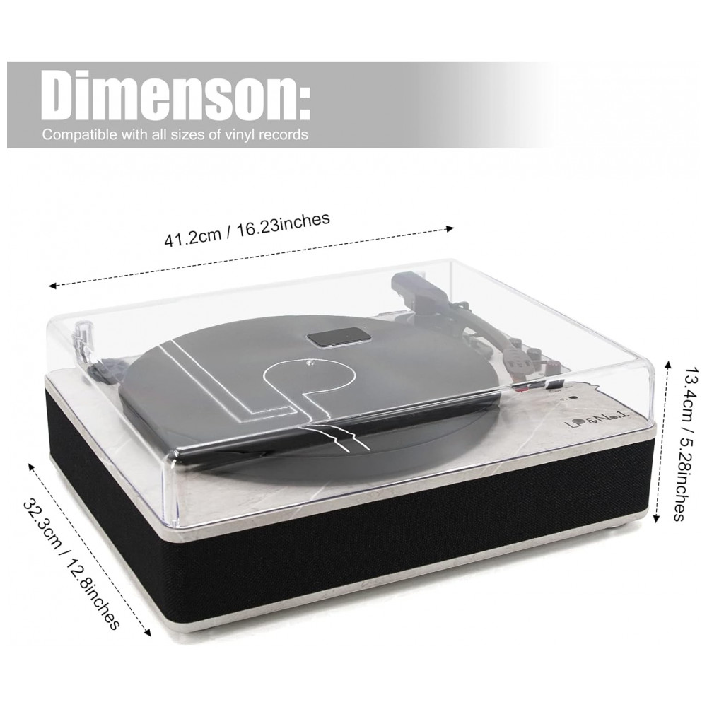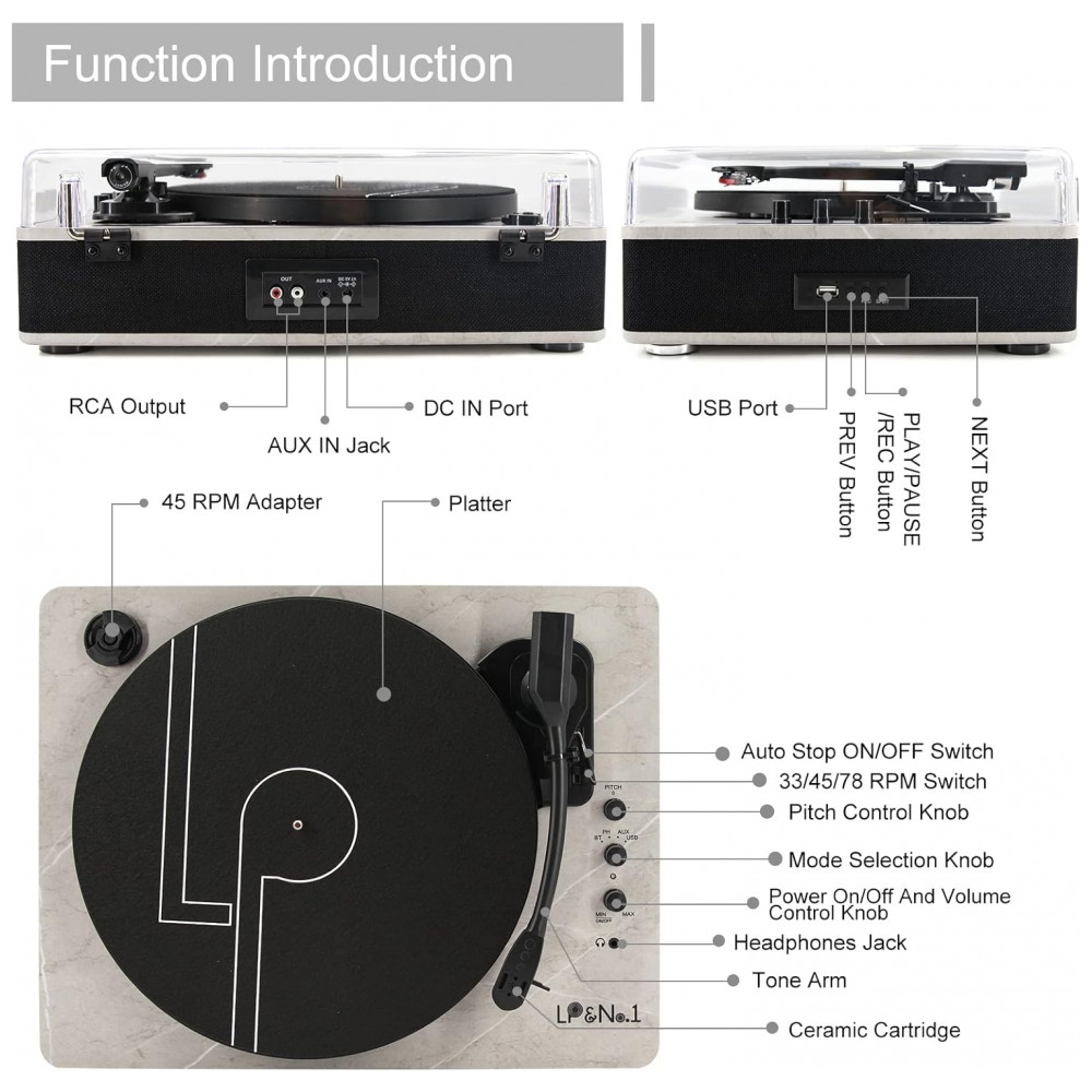 Toca discos LP versátil Saída RCA para conexão com alto falante externo, fone de ouvido para ouvir em particular. A base giratória é equipada com uma mola para fornecer absorção de choque e melhorar a qualidade do som. A capa de poeira facilmente removível protege seus discos de vinil contra danos