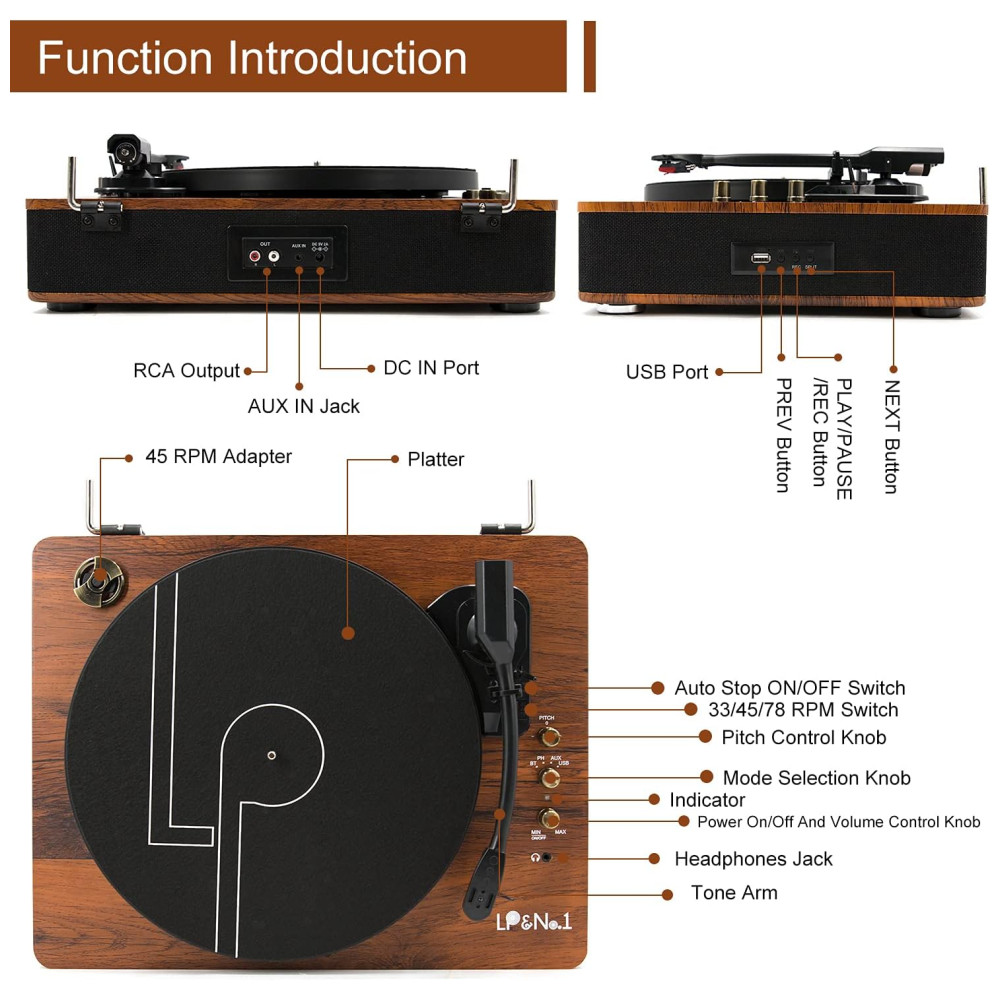 Você pode digitalizar seus queridos discos de vinil diretamente para arquivos MP3 na unidade USB através da conexão USB. Nenhum computador ou software necessário. Unidade flash USB ou entrada auxiliar de 3, por meio de nossos alto falantes embutidos. A saída de áudio. RCA permite que o toca discos se conecte a alto falantes externos para um som ainda maior, e o fone de ouvido permite que você desfrute de uma audição privada