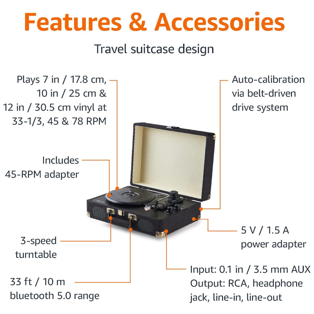 Estojo portátil com mala estilo vintage inclui adaptador de 45 RPM, adaptador de energia 5V, 1,5A