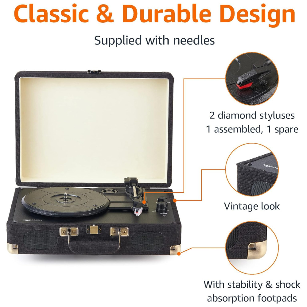 Toca discos portátil de 3 velocidades para reprodução de discos de vinil Configurações de velocidade de 33 1, 3, 45 e 78 RPM funciona com tamanhos de LP de vinil de 17,78, 25,4 e 30,48 centímetros.
