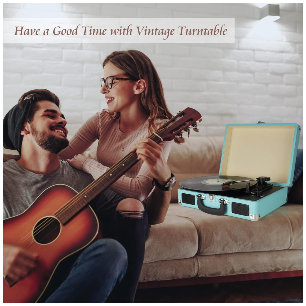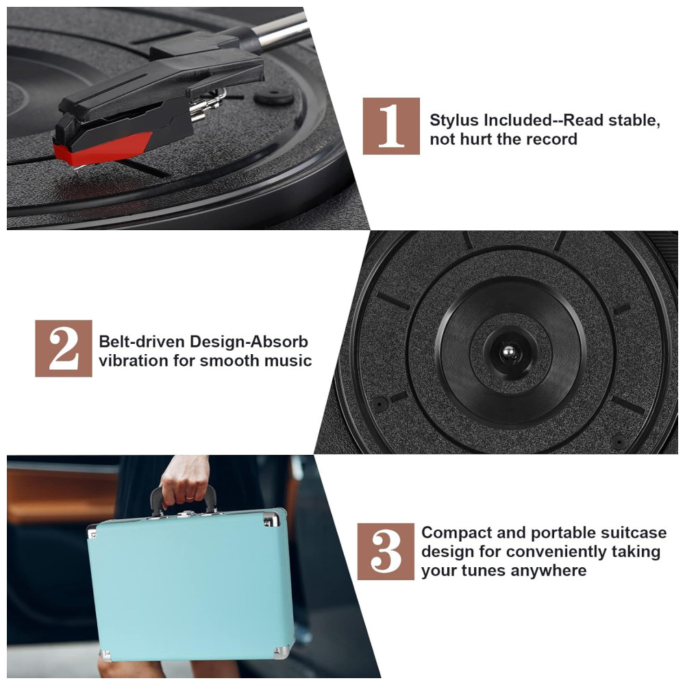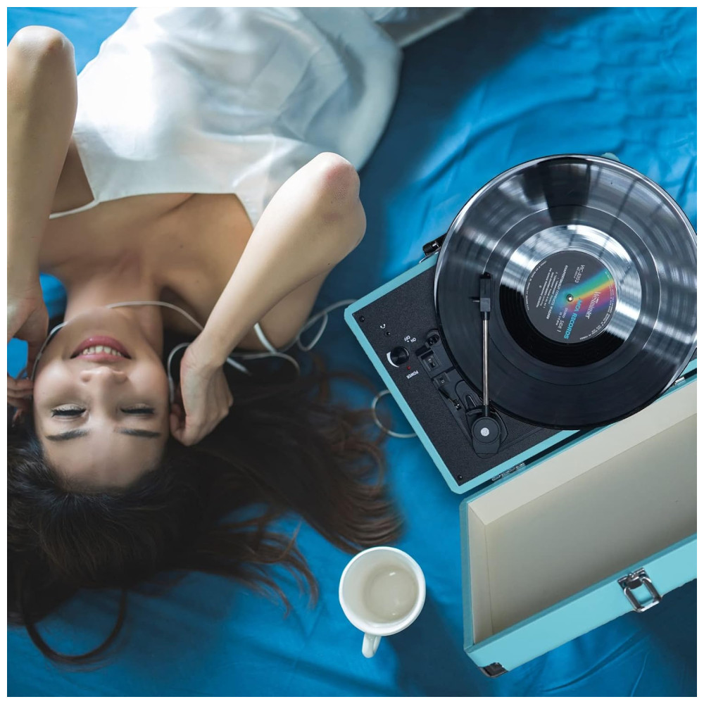 Reviva a nostalgia da música com estilo vintage usando este toca-discos em maleta. Seu design clássico de maleta e recursos modernos permitem que você desfrute da música de forma retrô. Com opções de conexão variadas, é possível transmitir música através dos alto-falantes estéreo embutidos ou conectar outros dispositivos via saída RCA ou entrada auxiliar. Com 3 velocidades diferentes, você pode reproduzir discos a 33, 45 e 78 RPM. Este toca-discos de correia antiga oferece pés de isolamento que evitam vibrações, garantindo qualidade sonora premium. Fácil de usar, não requer equipamentos extras. Com funções como controle de volume, botão liga/desliga automático e opção de usar fones de ouvido, este toca-discos é perfeito para iniciantes e amantes de vinil.