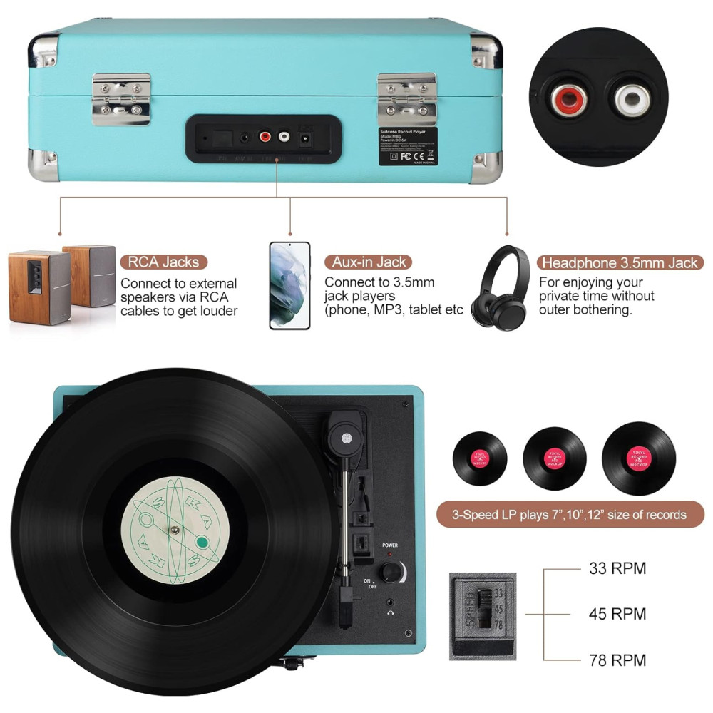 Toca-discos retrô portátil 3 velocidades alto-falantes integrados saída RCA entrada auxiliar perfeito para ouvir vinis com estilo. Kedok