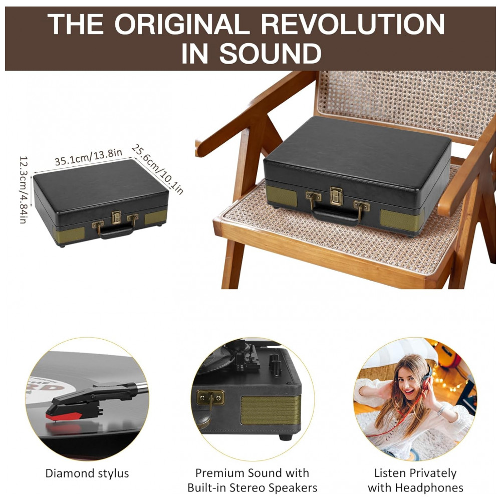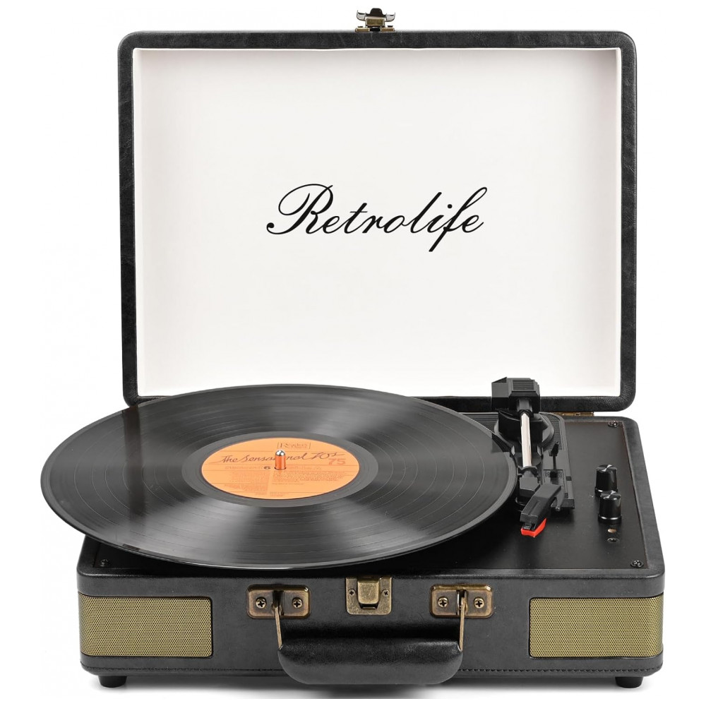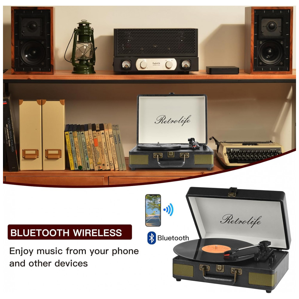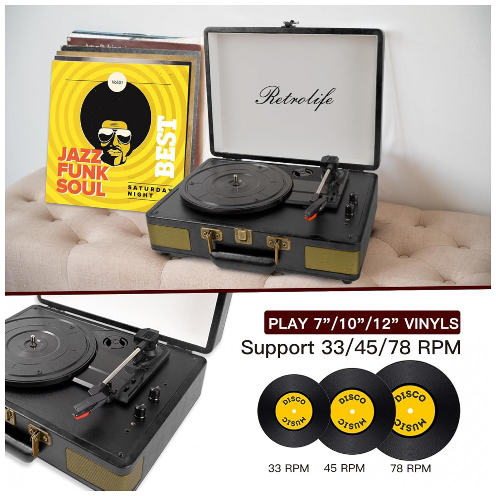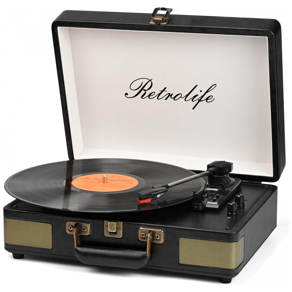 Toca-discos Retrolife 3 Velocidades Bluetooth Portátil em Maleta de Vinil com Alto-falantes Integrados Turntable Som Aprimorado Couro PU Vintage Preto