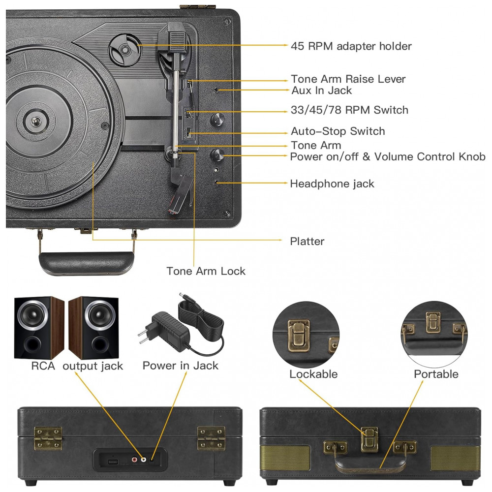 Desfrute de uma experiência musical nostálgica com o toca-discos Retrolife. Feito com material de alta qualidade em couro PU marrom clássico, possui um design flexível que combina o retro e o moderno. Com três velocidades (33 ⅓, 45, 78 RPM) e suporte para discos de vinil de 7, 10 e 12 polegadas, este toca-discos portátil oferece qualidade sonora premium. Reproduza sua música através dos alto-falantes Bluetooth integrados, conecte dispositivos externos, como smartphones, via RCA ou aproveite a função AutoStop que interrompe automaticamente a reprodução. Aproveite a versatilidade do AUXIN e RCA para expandir suas opções de áudio.