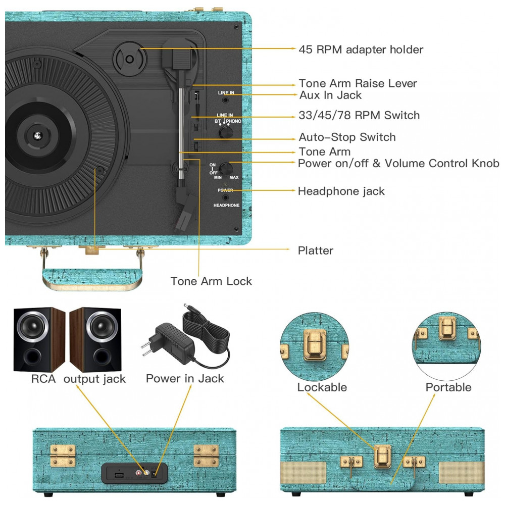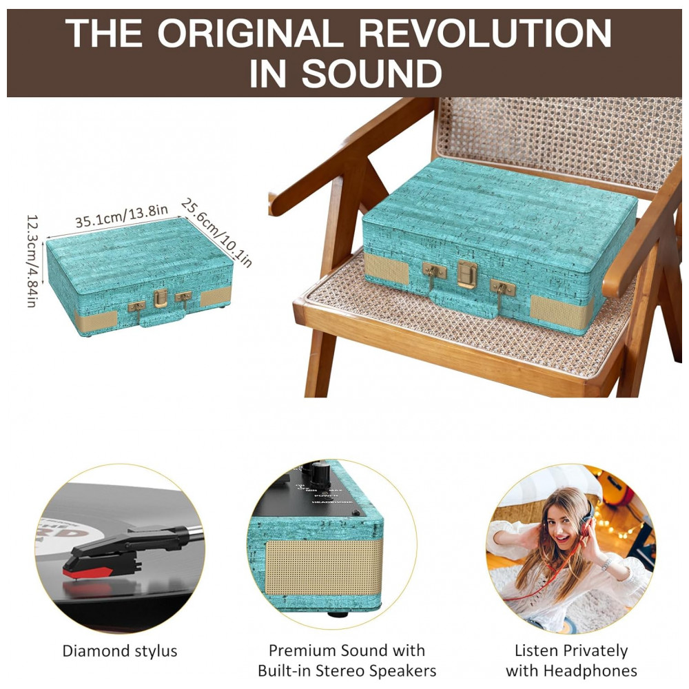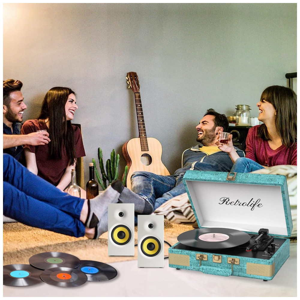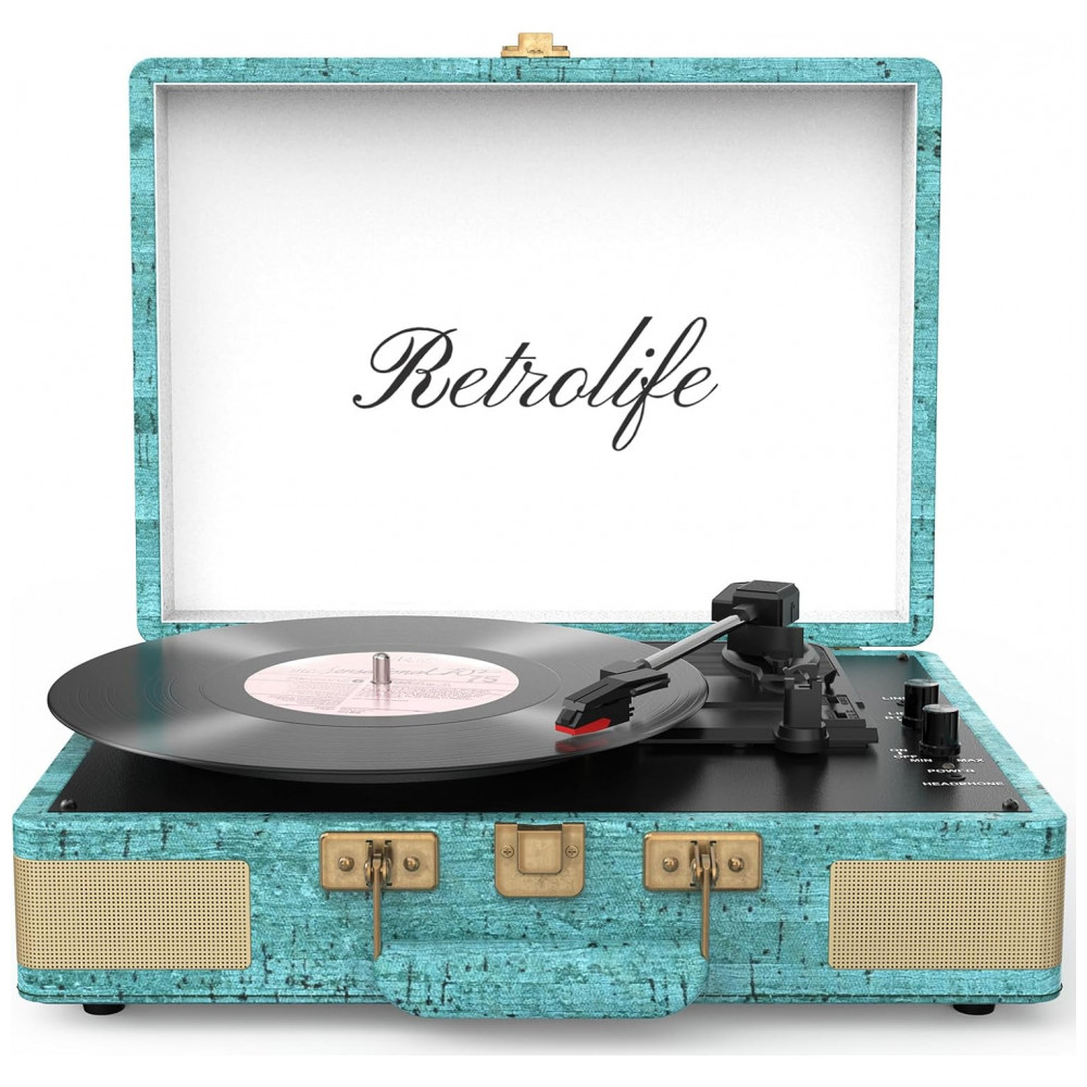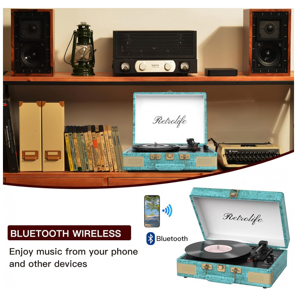 Toca-discos Retrolife 3 Velocidades Bluetooth Portátil Maleta Vinil com Alto-falantes Embutidos em Couro PU Azul Vintage