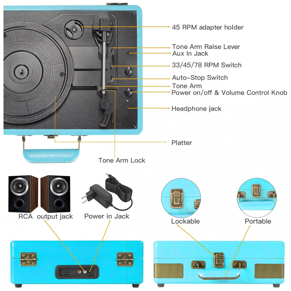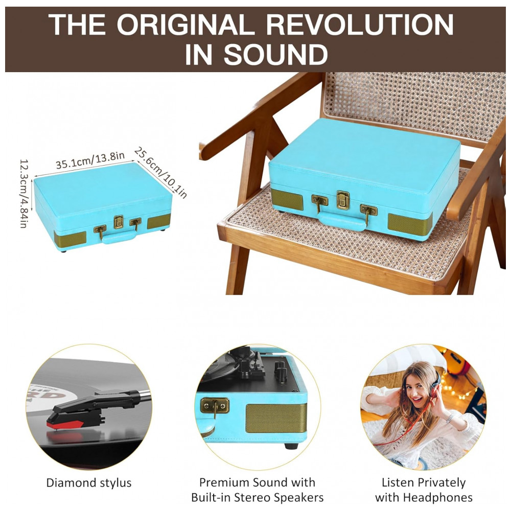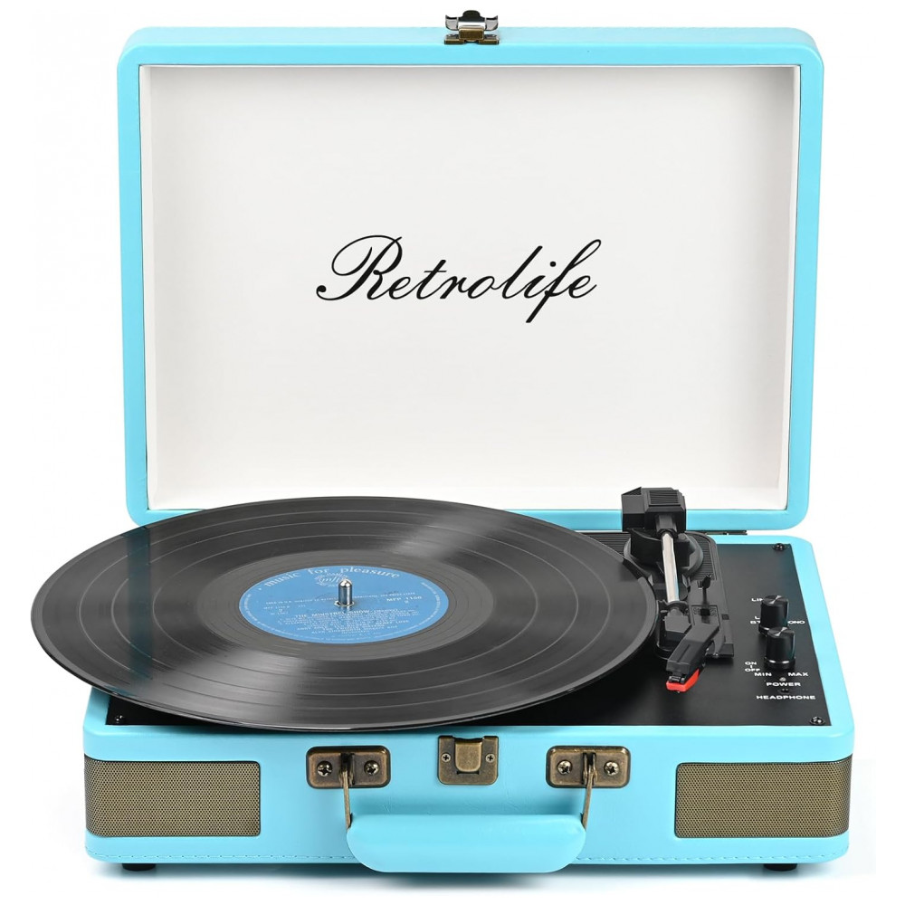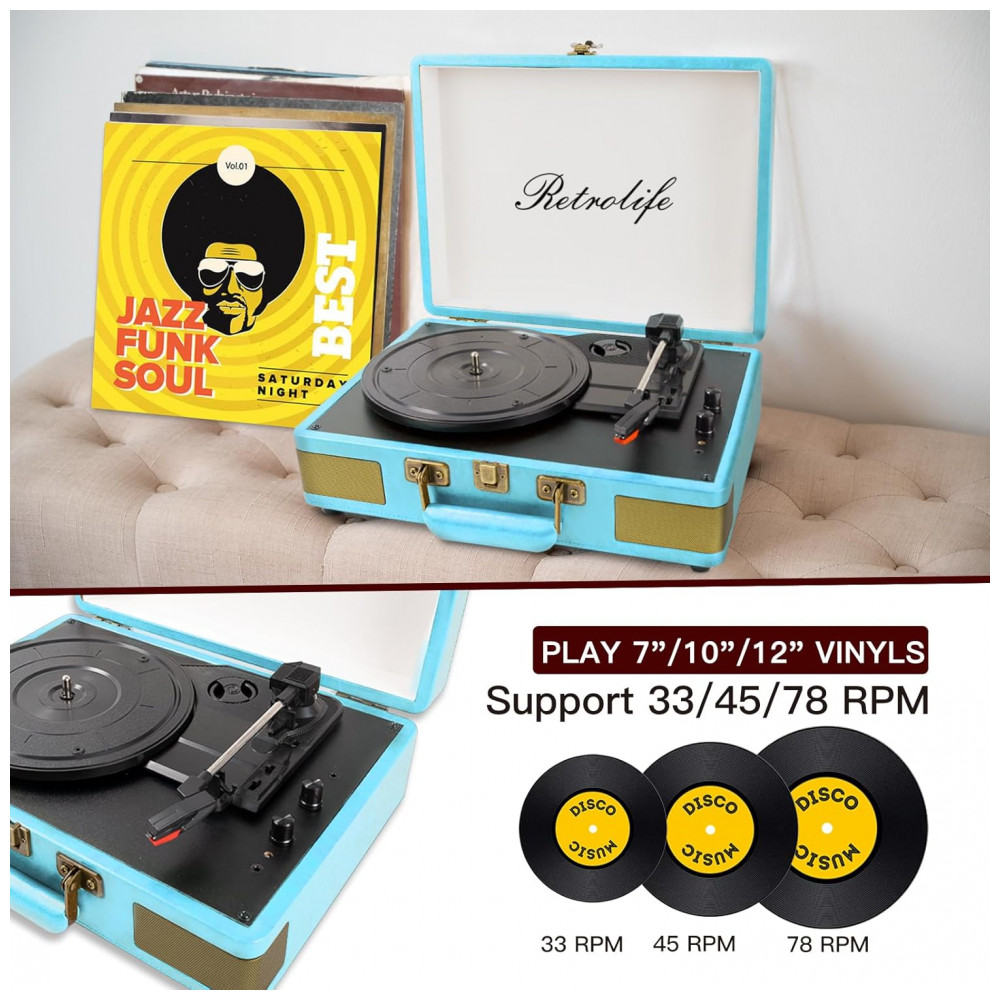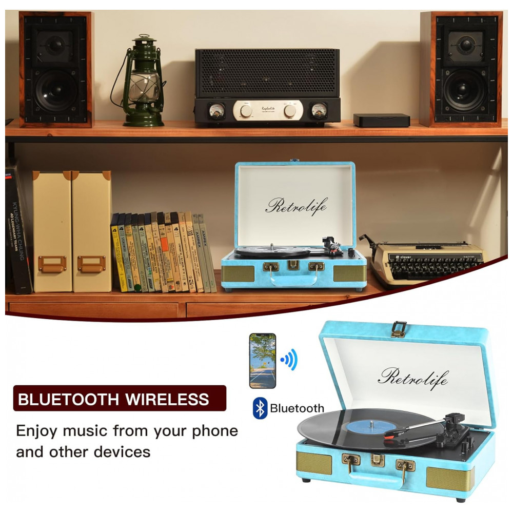 Toca-Discos Retrolife Bluetooth Portátil em Maleta de Vinil de 3 Velocidades com Alto-Falantes Integrados e Design Vintage em Couro PU