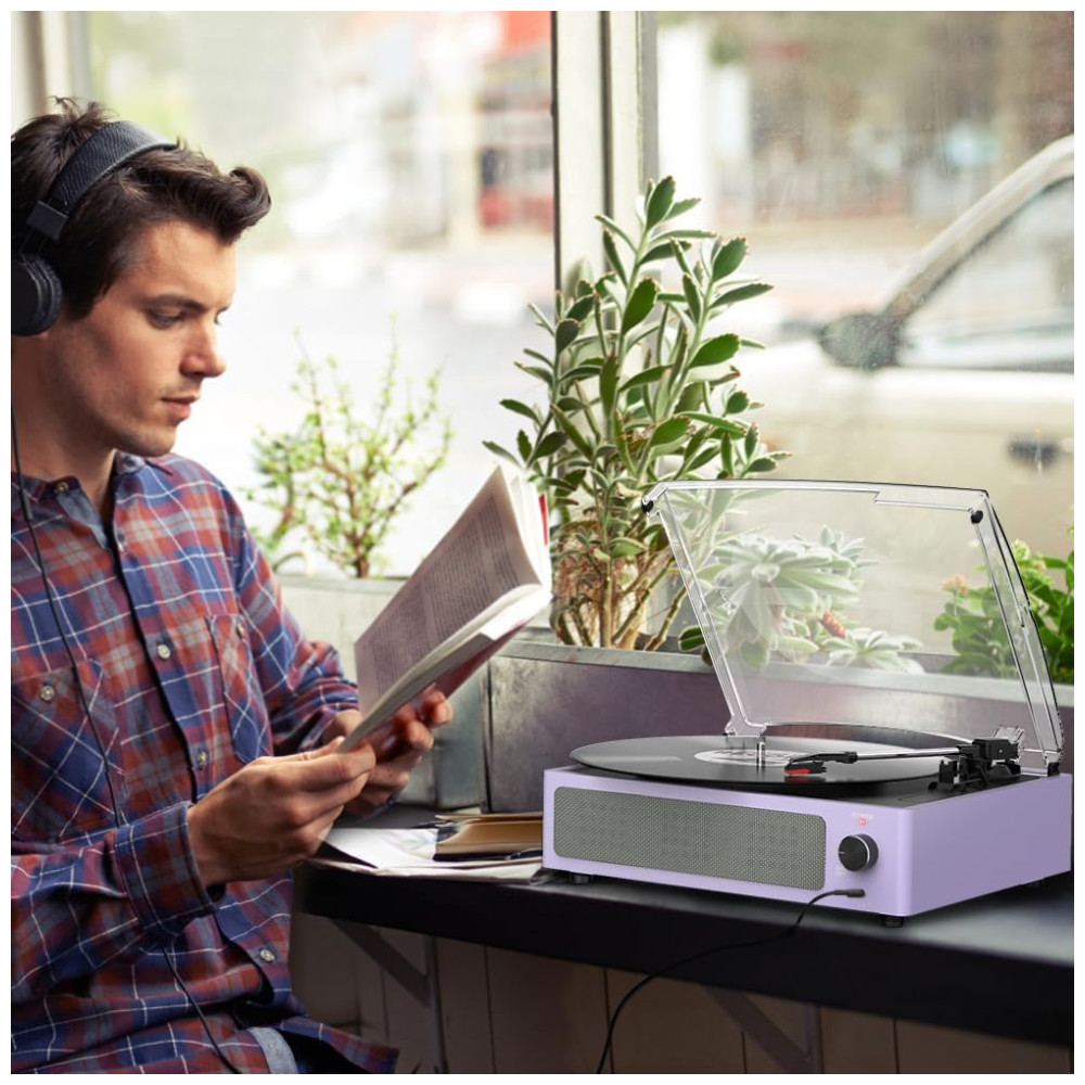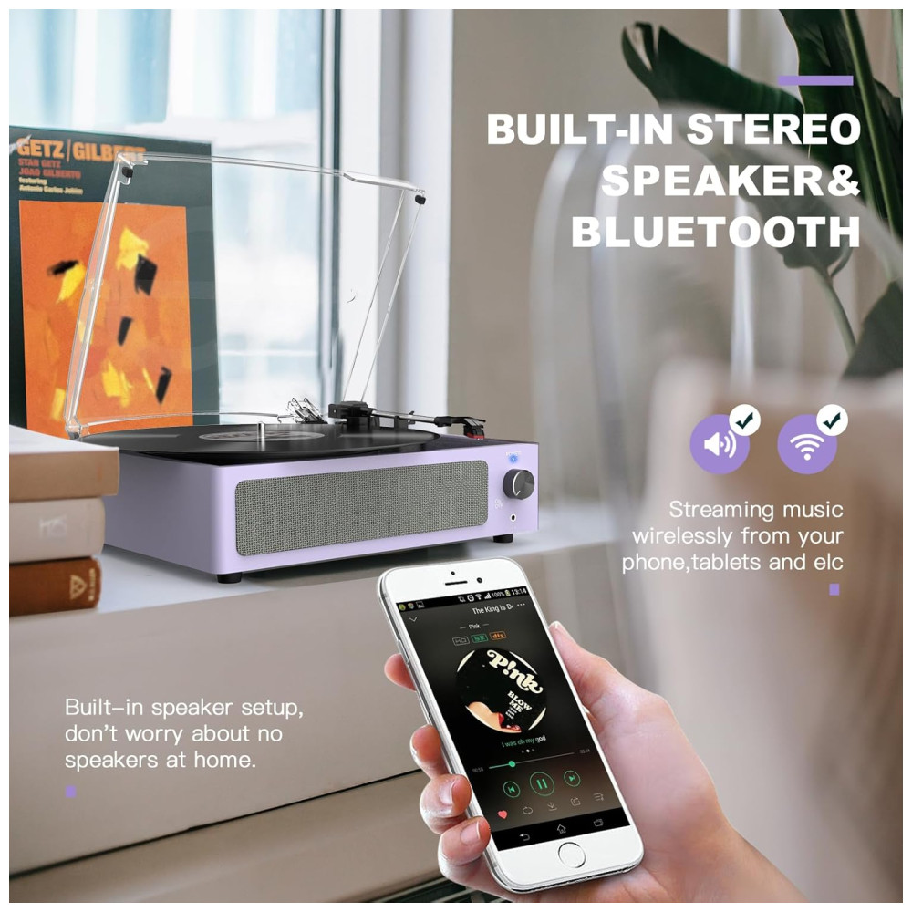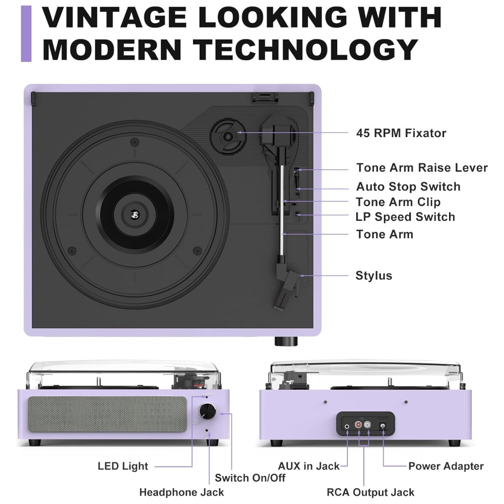 Toca-discos Vinil Novo WOCKODER – Design Elegante com Alto-falantes Integrados Bluetooth Três Velocidades Wireless Autostop Roxo Claro