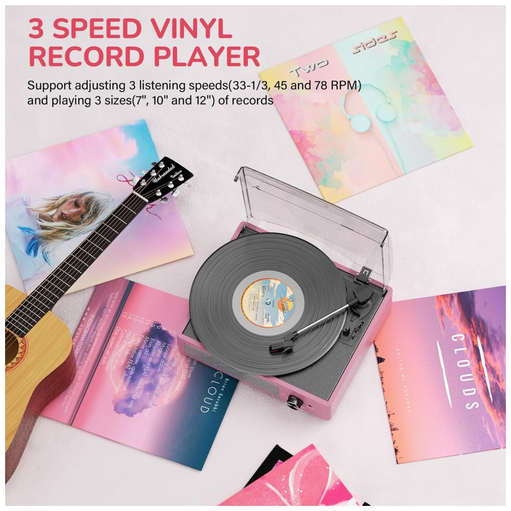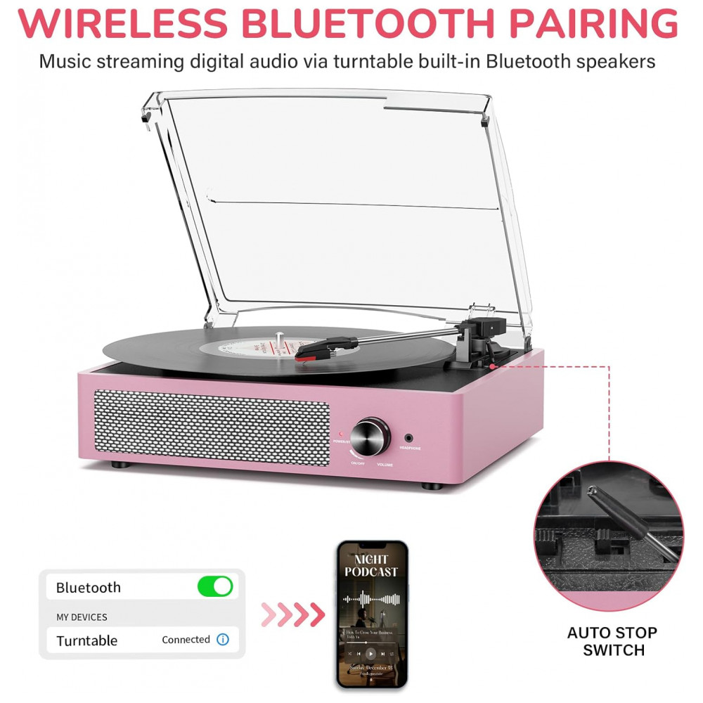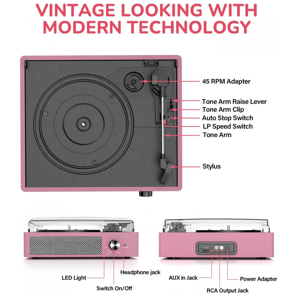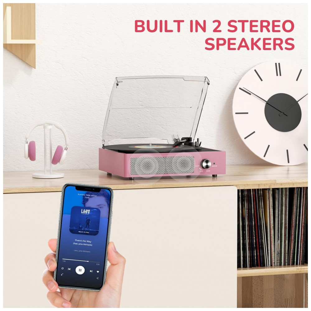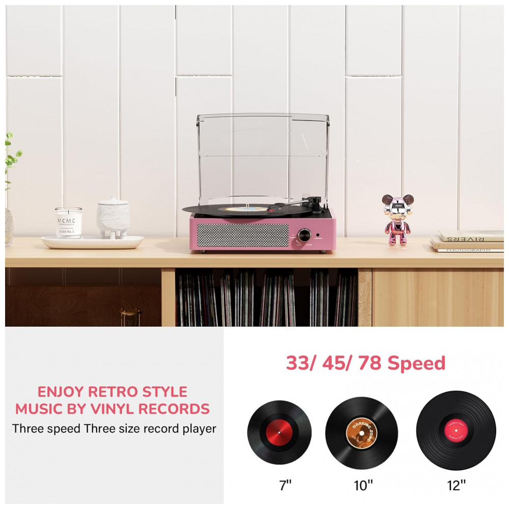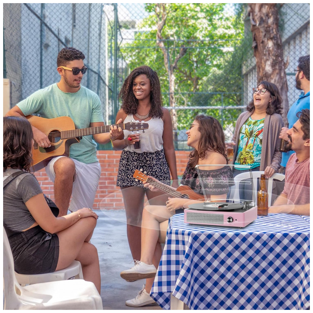 Reviva a nostalgia com este Toca-discos Vintage em Pink! Equipado com entrada Bluetooth, Auxiliar, RCA, saída de linha para fone de ouvido. Possui 2 alto-falantes estéreo embutidos e tecnologia Bluetooth para conexão com seu smartphone. Aproveite a entrada Auxiliar para reproduzir sua música diretamente ou relaxe ouvindo com fones de ouvido. Para um som melhor ou mais alto, conecte um alto-falante externo via cabo RCA. O toca-discos Belt Drive é fácil de usar, com operação simples e configuração rápida, sendo ideal para os amantes de vinil. Com três velocidades de reprodução (33, 45, 78 RPM), você poderá reproduzir todos os seus discos de vinil de 7″, 10″ e 12″. Tenha uma atmosfera acolhedora em reuniões familiares, momentos de relaxamento sozinho ou até mesmo como decoração premium em casa. Proteja seus vinis com a cobertura removível e desfrute do design retrô que se encaixa perfeitamente em qualquer ambiente.