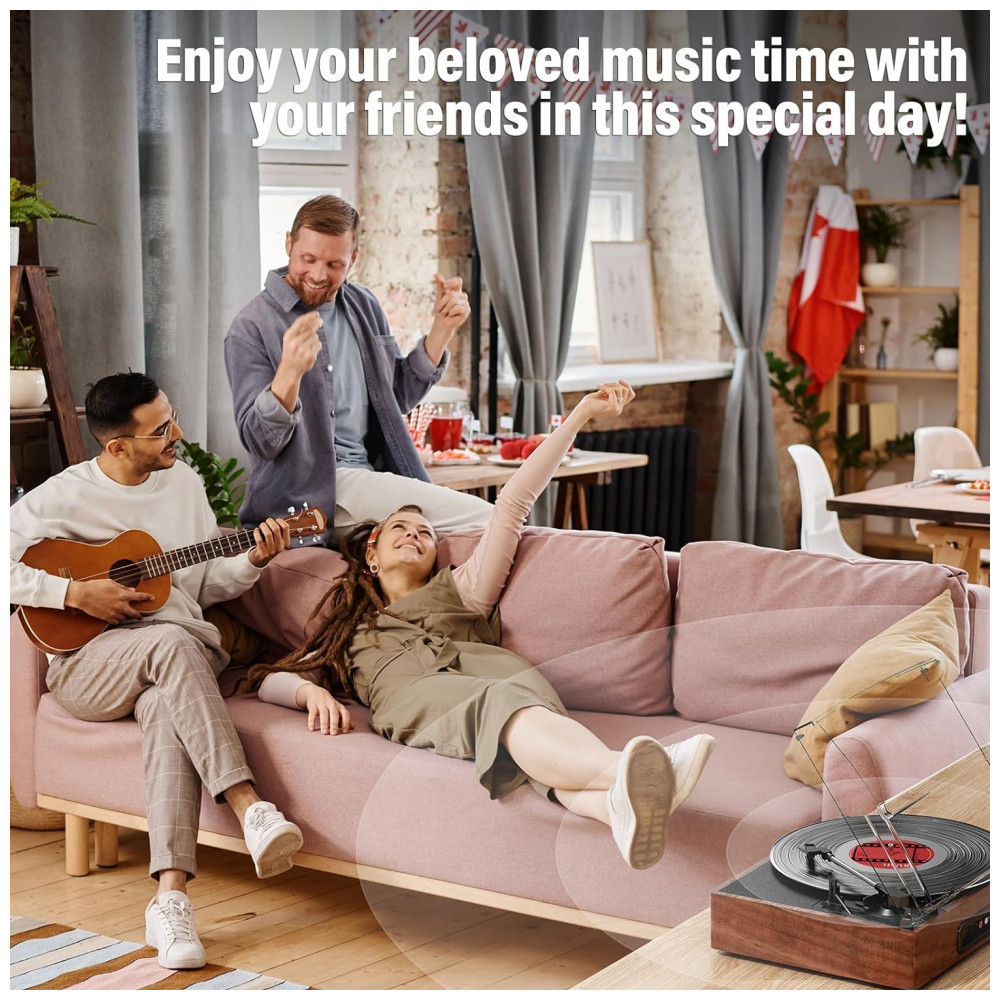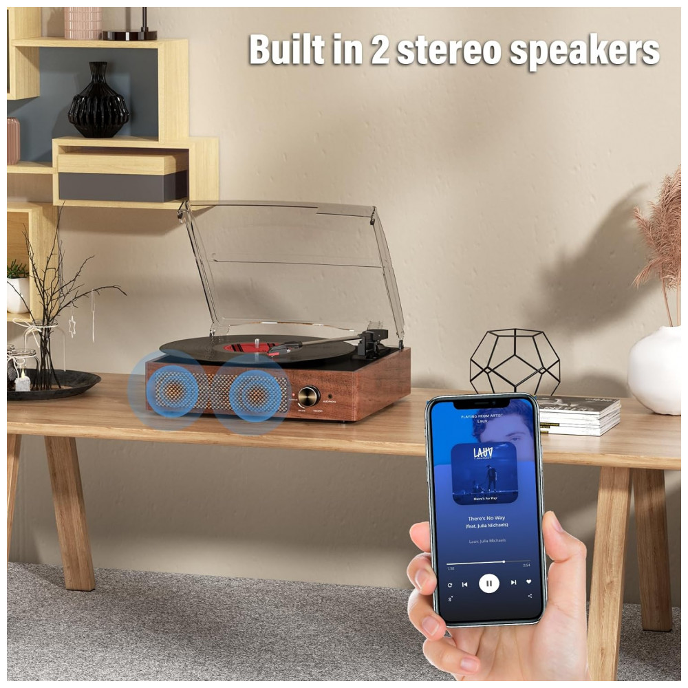 Com design pensado para os entusiastas de vinil, este toca-discos vintage possui alto-falantes estéreo embutidos que oferecem um som rico e claro, permitindo que você desfrute de seus discos a qualquer momento, sem equipamentos adicionais. Ele suporta tanto entrada AUX quanto saída RCA, e inclui os cabos necessários na embalagem. Use o cabo AUX incluído para conectar sem fio seu CD player, smartphone, reprodutor de mídia digital ou outras fontes de áudio. Para uma experiência sonora aprimorada ou mais alta, basta conectar alto-falantes externos usando o cabo de saída RCA fornecido. Também inclui uma entrada para fone de ouvido de 3,5mm para ouvir em privacidade. Com tecnologia Bluetooth, este toca-discos permite reproduzir facilmente músicas do seu smartphone, reprodutor de MP3, tablet ou qualquer outro dispositivo de áudio Bluetooth. O áudio é transmitido através dos dois alto-falantes estéreo embutidos, proporcionando som de alta qualidade e uma experiência de audição sem fio perfeita. O toca-discos com acionamento por correia e braço de tom semiautomático trabalham em harmonia para reduzir a vibração do motor, entregando uma qualidade de som mais rica, calorosa e autêntica. Suporta todas as três velocidades – 33, 45, 78 RPM – e tamanhos de discos de 17,78 cm, 25,40 cm e 30,48 cm, trazendo toda a sua coleção à vida. Dica profissional: Ao colocar um disco de vinil de 30,48 cm no toca-discos, incline-o levemente em direção ao braço de tom para garantir a reprodução correta. Com uma capa removível na parte superior para proteger vinis e a base do toca-discos, você pode fechar a tampa para afastar o pó. A bela aparência texturizada é perfeita para qualquer ambiente. Pronto para uso, perfeito para presentear: Com seu acabamento em madeira elegante e design intuitivo, este toca-discos é tanto um belo item de decoração quanto um reprodutor de música prático, tornando-o um presente inesquecível para amantes de música, novatos em vinil e entusiastas de design. Seja na sala de estar, quarto ou balcão de café, sua textura natural de madeira adiciona um toque de calor atemporal a qualquer espaço. Sua trilha sonora portátil para todas as ocasiões: Estabeleça um clima relaxante para uma tarde de fim de semana, anime um encontro familiar ou traga charme retrô para a decoração diária. Onde quer que a vida te leve, traga calor, nostalgia e estilo junto com você.