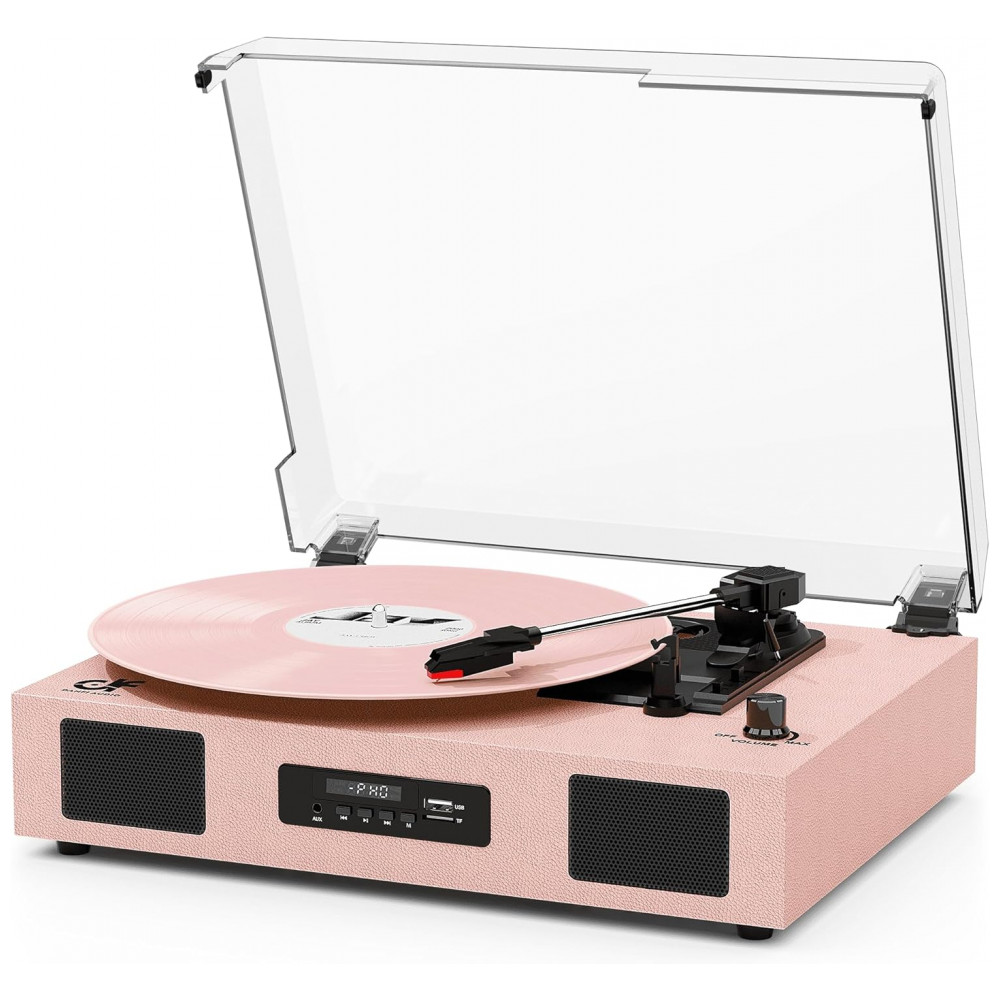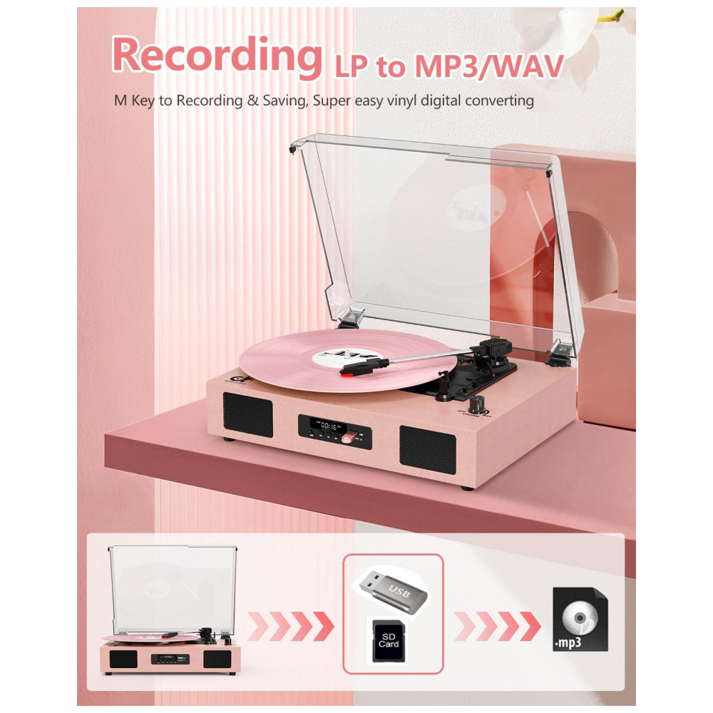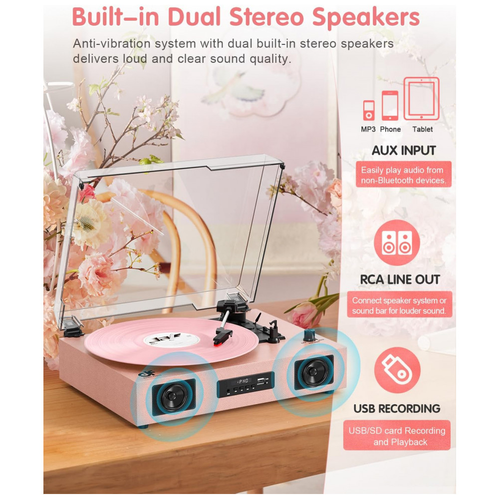 O Toca-Discos Versátil é fácil de usar, possui alto-falantes embutidos, tecnologia de EQ no Modo Bluetooth/USB e suporta reprodução de vinil em 3 velocidades, reprodução via Bluetooth, gravação e reprodução de vinil para USB/SD card, conexão de entrada AUX e saída de linha RCA. O sistema de toca-discos aprimorado conta com acionamento por correia e toca-discos de 3 velocidades 33, 45, 78 RPM para tocar todos os seus discos de vinil de 7″ 10″ 12″ desde álbuns recém-lançados até coleções dos anos 50, 60, 70 e 80. Utilize o elevador de braço para levantar e baixar a agulha suavemente no disco, sem pular. O Toca-Discos com Bluetooth possui alto-falantes estéreo embutidos, sem a necessidade de equipamento de áudio adicional, e o receptor Bluetooth permite transmitir música sem fio do seu smartphone, tablet ou outros dispositivos compatíveis com Bluetooth. A porta USB permite converter seus discos em formatos digitais para ouvir em players portáteis com capacidade de USB stick inferior a 64GB. Seu tamanho compacto e alimentação por USB DC 5V1A tornam-no perfeito para levá-lo para onde quiser. A função de Autoparagem para a rotação no final de um disco. Além disso, vem com uma capa removível transparente para proteger seus discos do pó. Seu design vintage e elegante combina com seu estilo e decoração. Ótimo presente para seus entes queridos no Dia dos Namorados, Dia das Mães, aniversários, Natal, aniversários e outras ocasiões especiais!