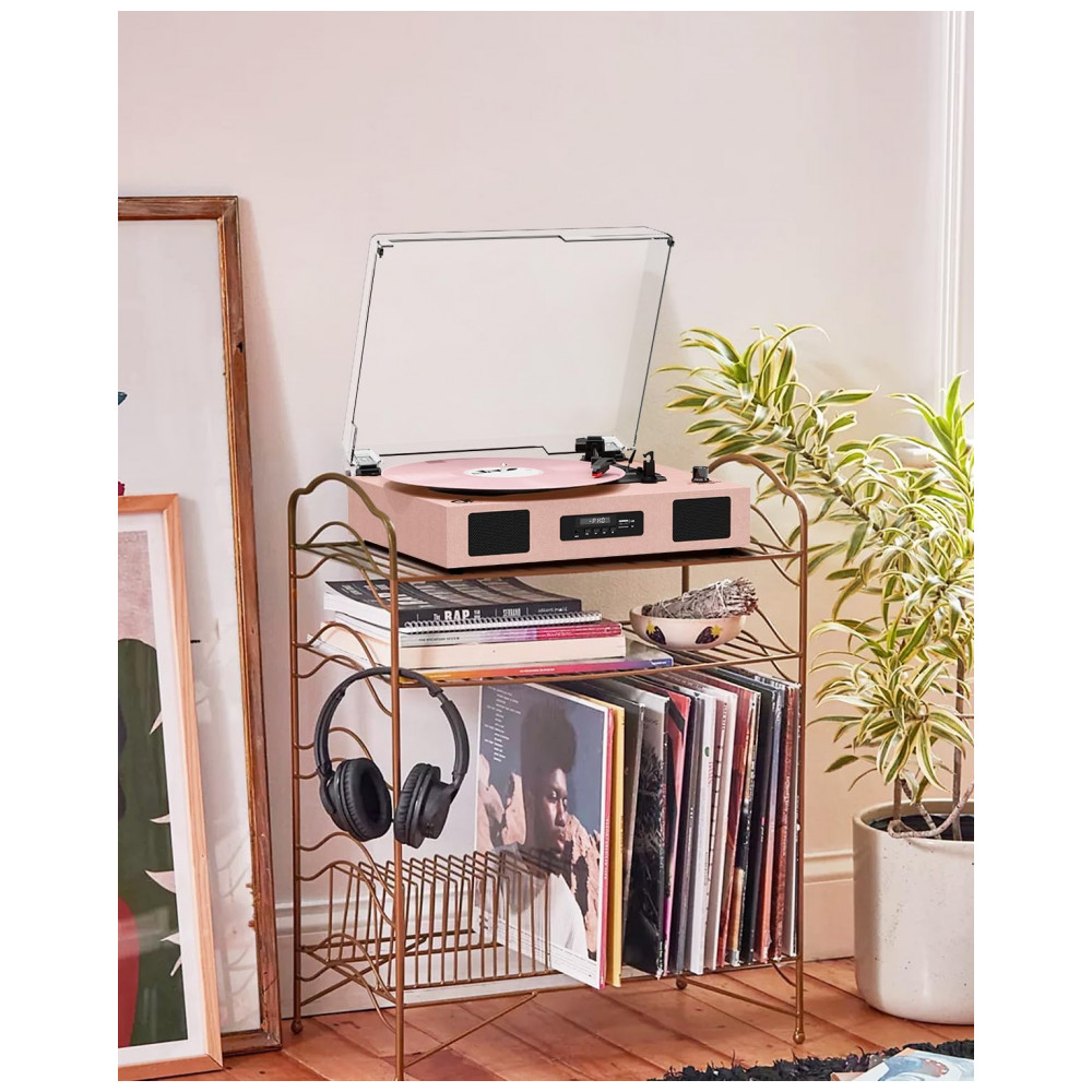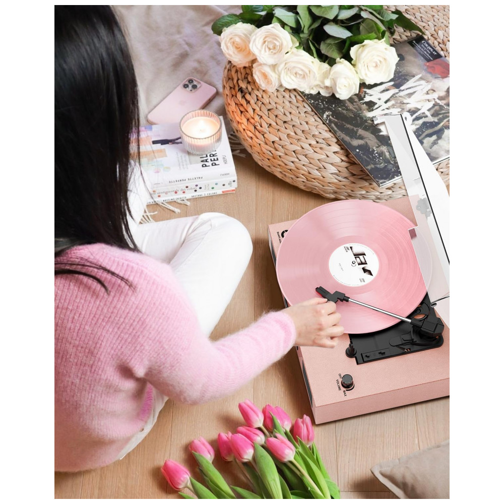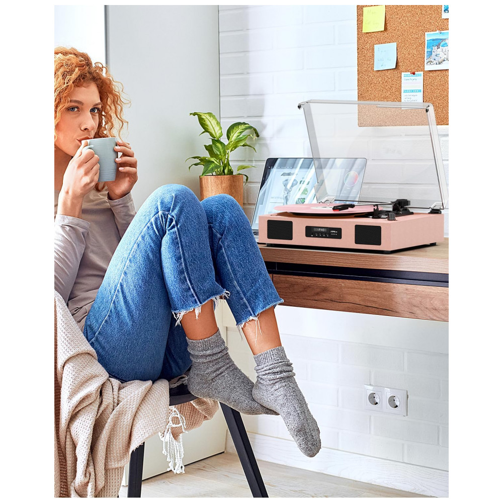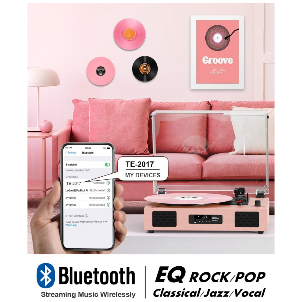 O Toca-Discos Versátil é fácil de usar, possui alto-falantes embutidos, tecnologia de EQ no Modo Bluetooth/USB e suporta reprodução de vinil em 3 velocidades, reprodução via Bluetooth, gravação e reprodução de vinil para USB/SD card, conexão de entrada AUX e saída de linha RCA. O sistema de toca-discos aprimorado conta com acionamento por correia e toca-discos de 3 velocidades 33, 45, 78 RPM para tocar todos os seus discos de vinil de 7″ 10″ 12″ desde álbuns recém-lançados até coleções dos anos 50, 60, 70 e 80. Utilize o elevador de braço para levantar e baixar a agulha suavemente no disco, sem pular. O Toca-Discos com Bluetooth possui alto-falantes estéreo embutidos, sem a necessidade de equipamento de áudio adicional, e o receptor Bluetooth permite transmitir música sem fio do seu smartphone, tablet ou outros dispositivos compatíveis com Bluetooth. A porta USB permite converter seus discos em formatos digitais para ouvir em players portáteis com capacidade de USB stick inferior a 64GB. Seu tamanho compacto e alimentação por USB DC 5V1A tornam-no perfeito para levá-lo para onde quiser. A função de Autoparagem para a rotação no final de um disco. Além disso, vem com uma capa removível transparente para proteger seus discos do pó. Seu design vintage e elegante combina com seu estilo e decoração. Ótimo presente para seus entes queridos no Dia dos Namorados, Dia das Mães, aniversários, Natal, aniversários e outras ocasiões especiais!