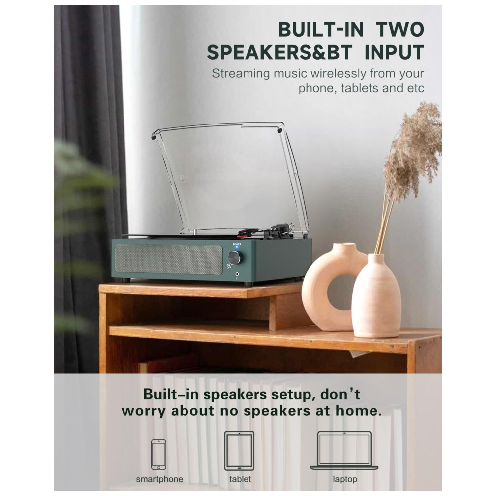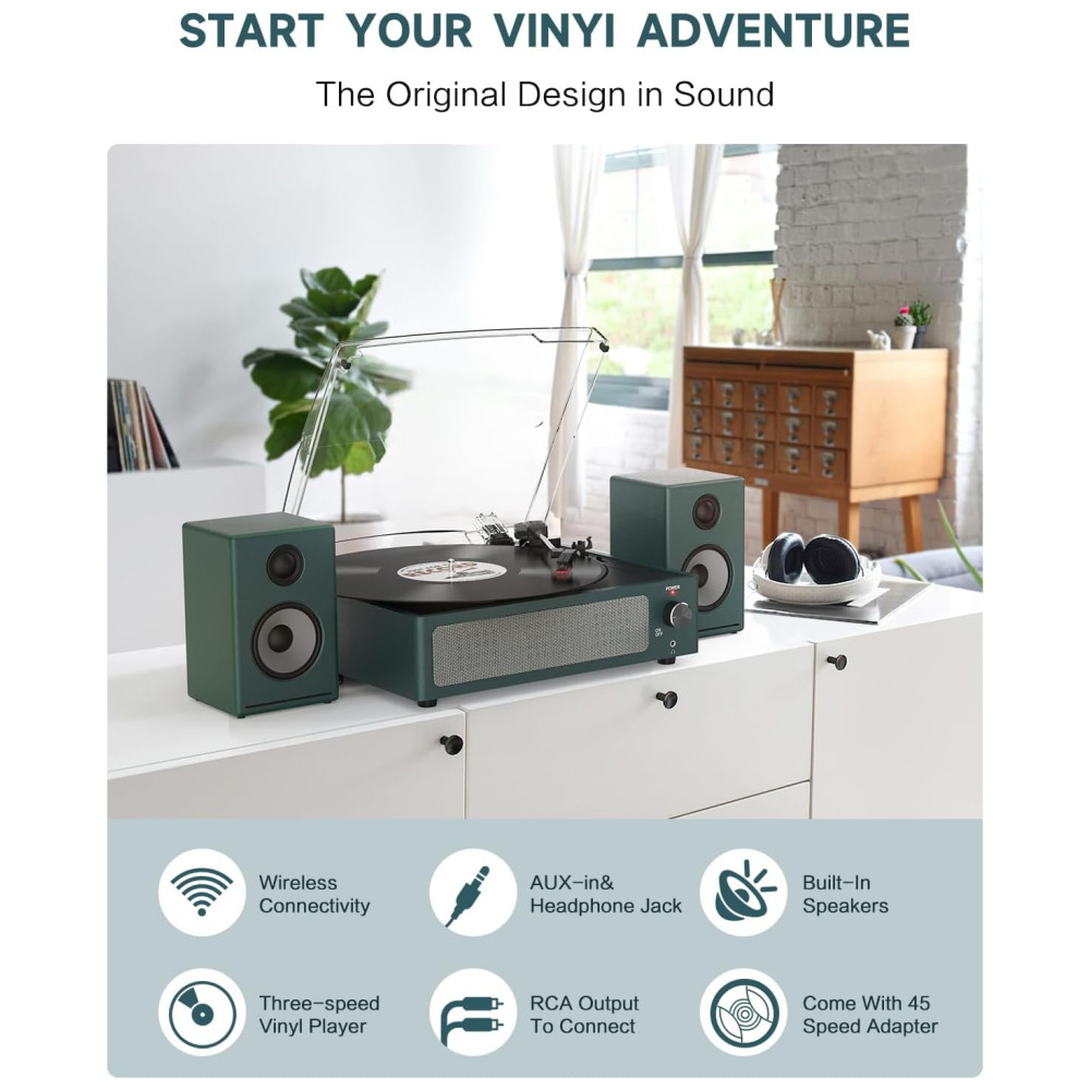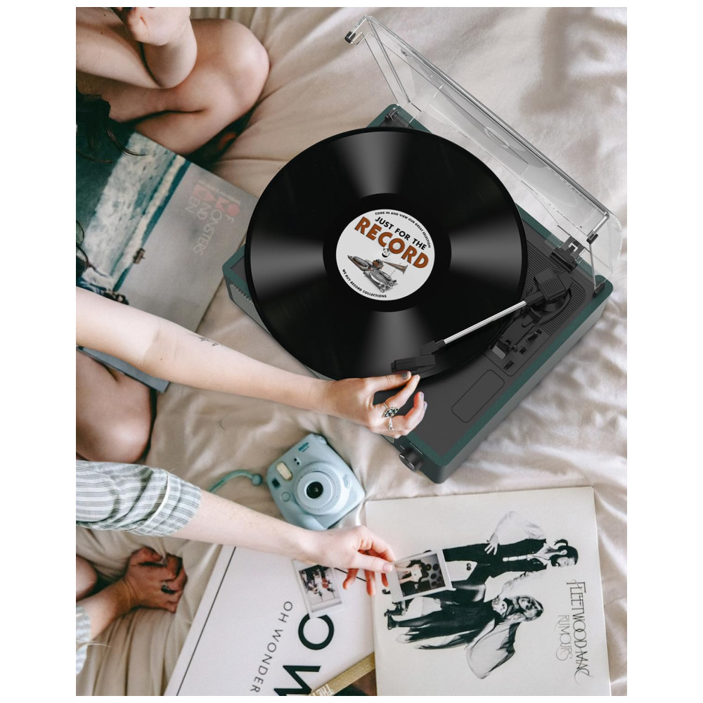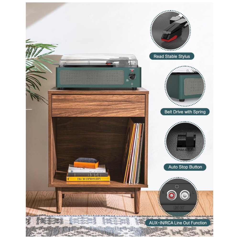 O Toca-discos de 3 velocidades com acionamento por correia reproduz seus discos de vinil de 33 1/3, 45 e 78 RPMs. Possui ajuste de autostop para parar automaticamente no final do disco e suporta tamanhos universais, incluindo adaptador para discos de 45 RPM. Conecte-se sem fio via Bluetooth ao seu celular e reproduza suas músicas digitais favoritas. Os alto-falantes integrados oferecem um som excepcional, dispensando a necessidade de caixas de som adicionais. Além disso, possui saída RCA e AUX para conexão com outros dispositivos. Com design vintage em madeira, proteção contra poeira e operação simples, é ideal para iniciantes e amantes de vinil.