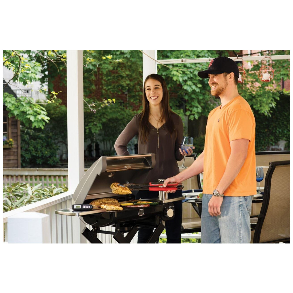 QUEIMADOR DE AÇO INOXIDÁVEL DE 15.000 BTU Possui um queimador de 15.000 BTU, um painel que distribui o calor uniformemente e uma grelha de cozimento em ferro fundido esmaltado de porcelana. Controle de temperatura com ignição elétrica Twist Start fácil de usar medidor de temperatura de assinatura.