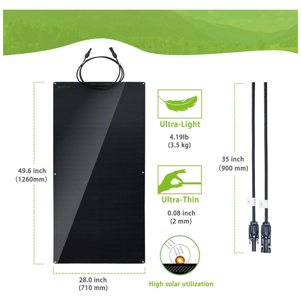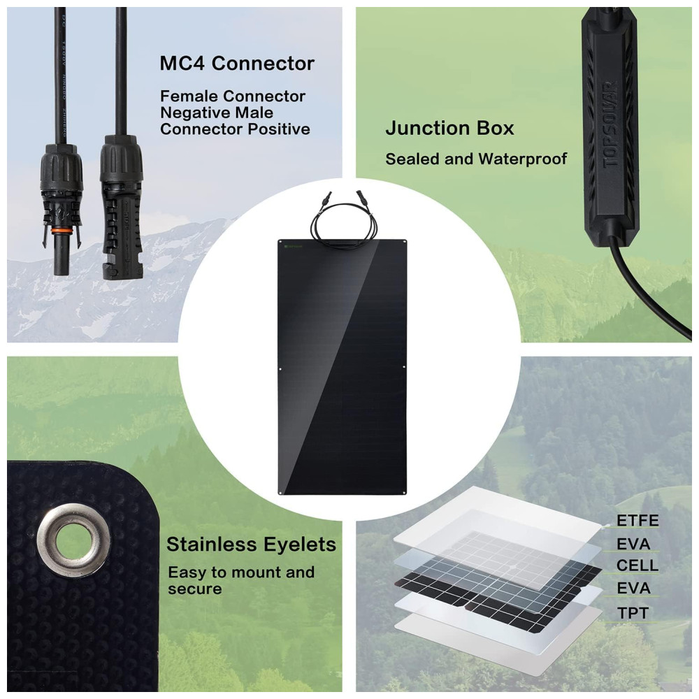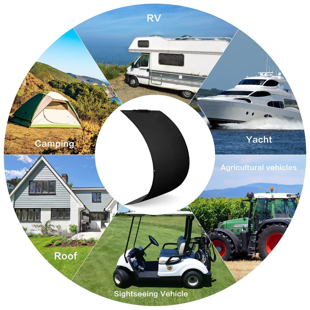 Boa flexibilidade O raio mínimo do arco que um painel solar flexível pode atingir é 40cm 15,75 pol.. É permitido ser instalado em reboques, barcos, cabines, tendas, carros, caminhões, reboques, iates, reboques, tetos , ou qualquer outra superfície irregular.